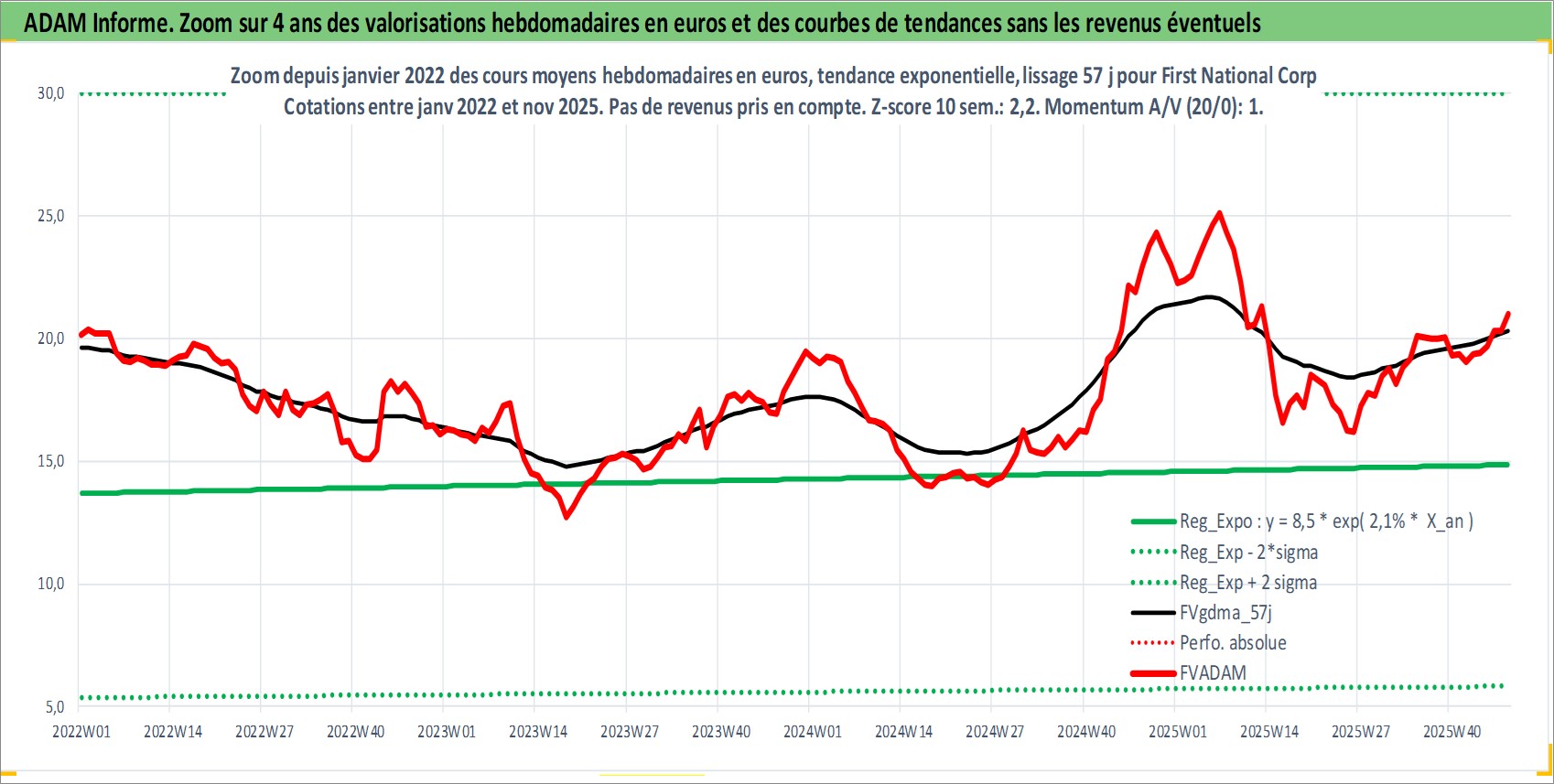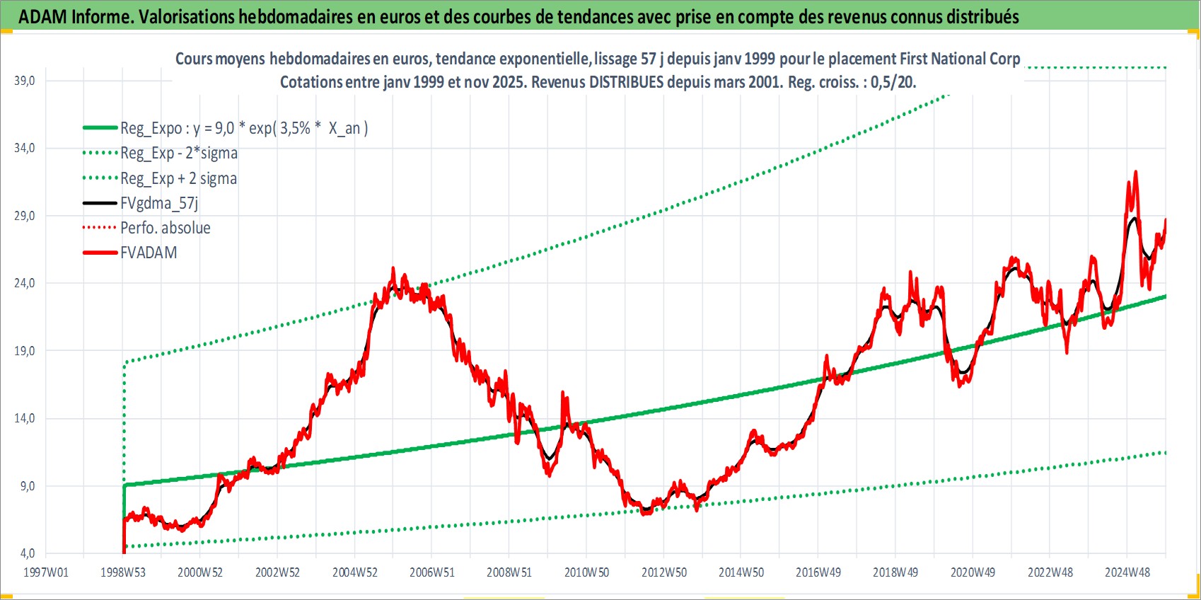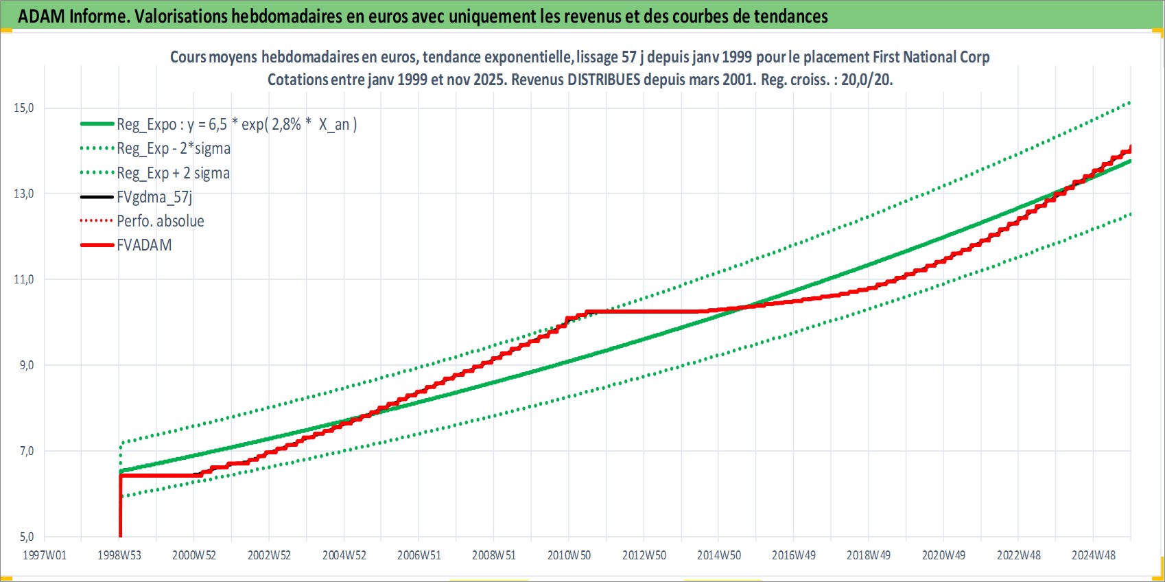 Site dédié aux investisseursPage dédiée sur site financeAnalyse des valorisations hebdomadaires de l'action First National Corp. Cet actif est cote en USD. Les valorisations sont en contrevaleur EURO et couvrent les semaines 1999W02 a 2025W48. Les revenus de cet actif financier sont pris en compte depuis la semaine 2001W11. La note ESG de cet actif n'est pas connue.