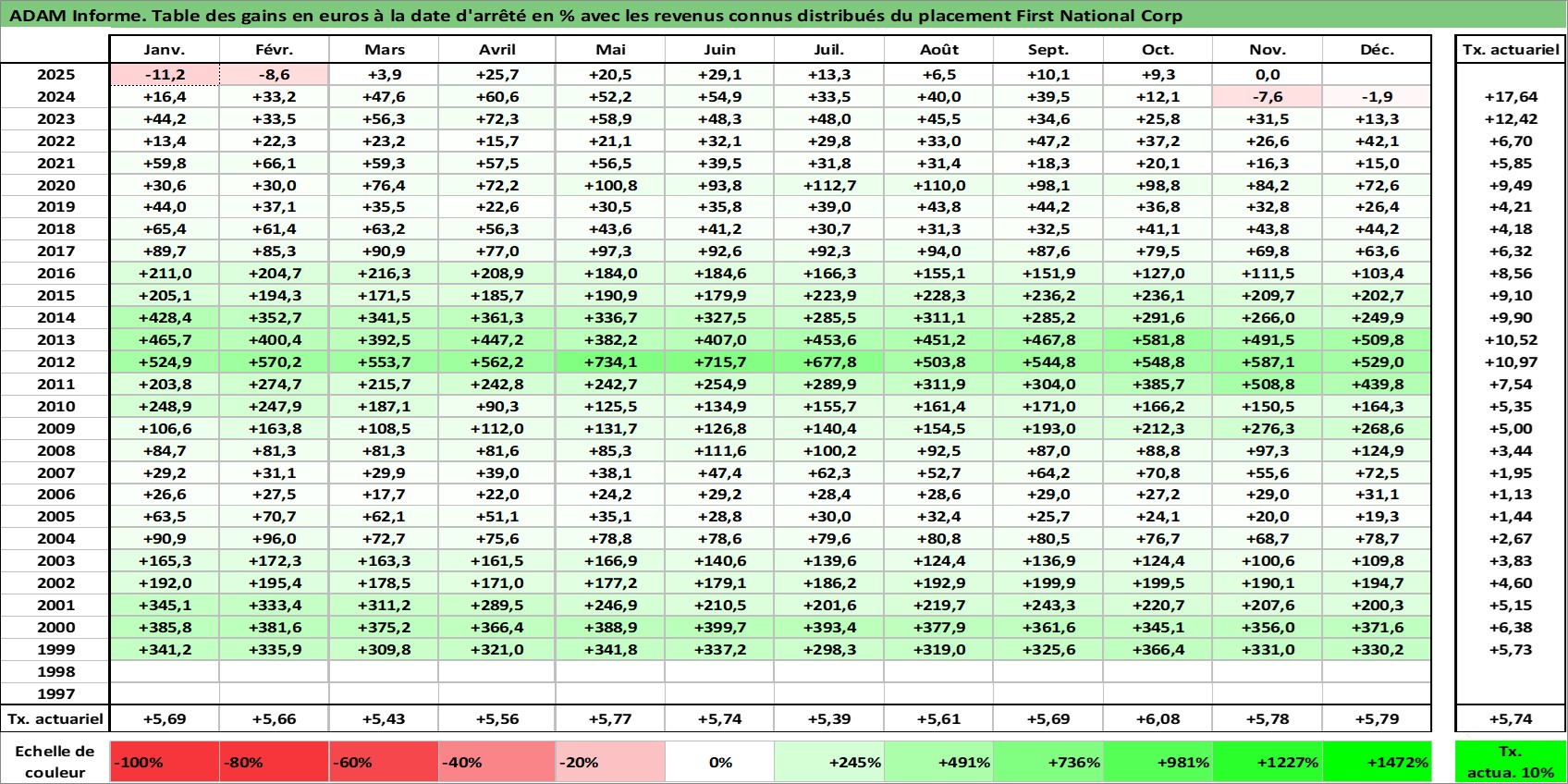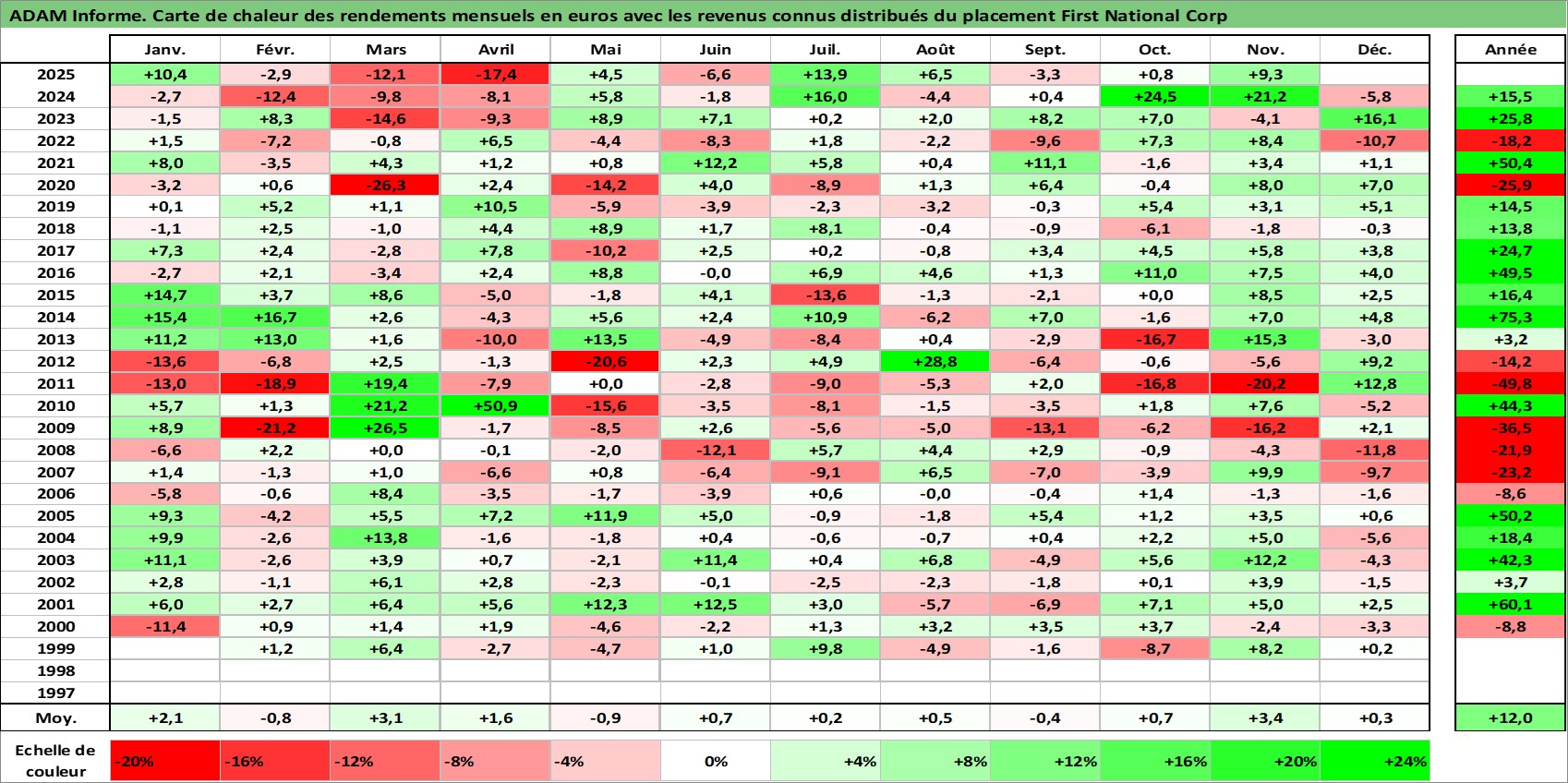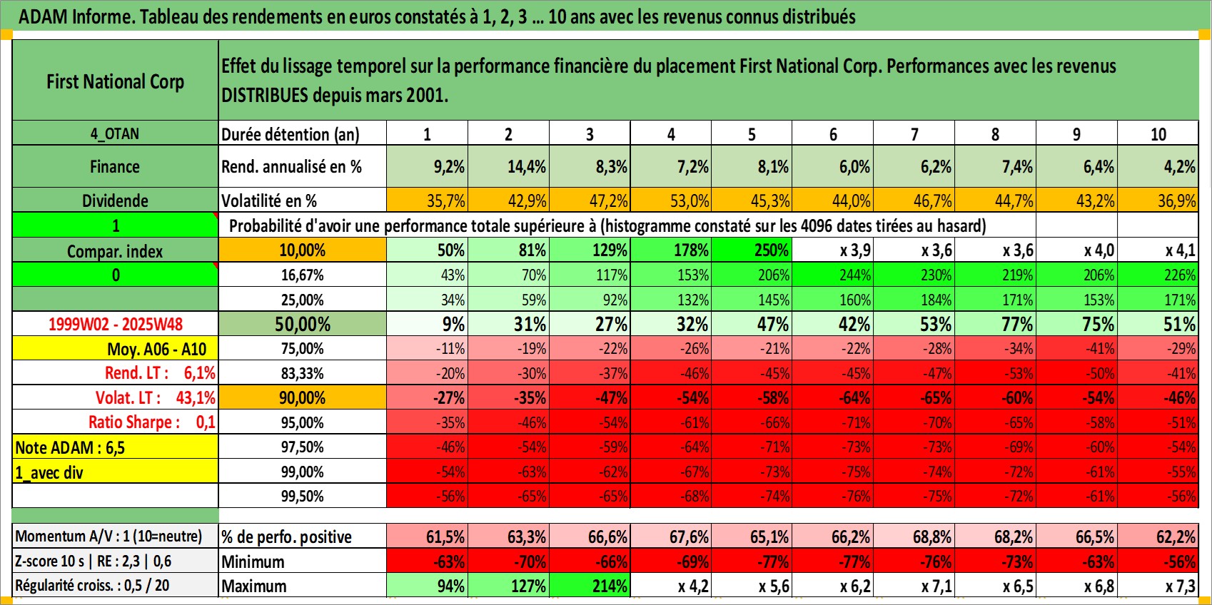 Site dédié aux investisseursPage dédiée sur site financeAnalyse des valorisations hebdomadaires de l'action First National Corp. Cet actif est cote en USD. Les valorisations sont en contrevaleur EURO et couvrent les semaines 1999W02 a 2025W48. Les revenus de cet actif financier sont pris en compte depuis la semaine 2001W11. La note ESG de cet actif n'est pas connue.