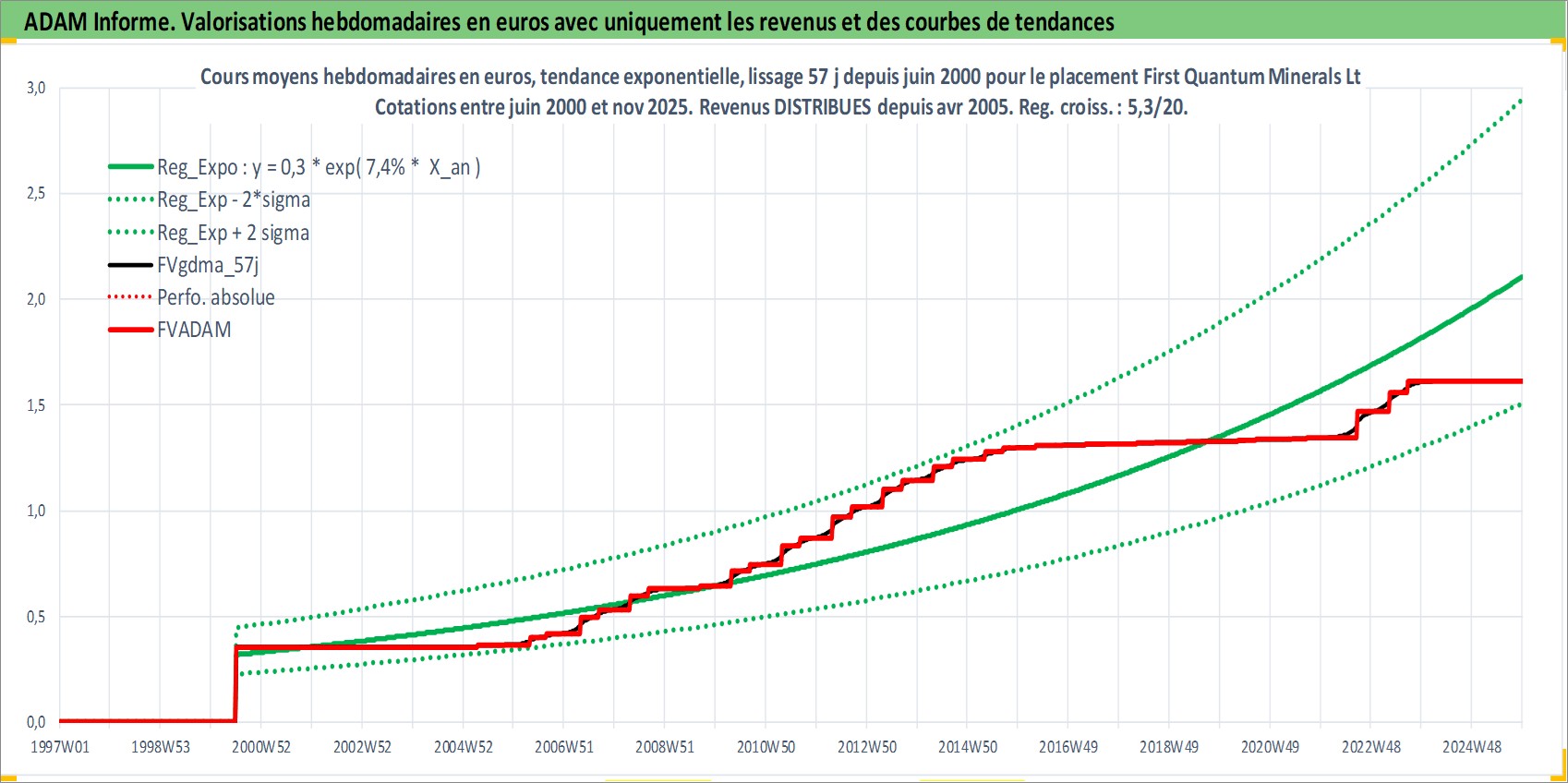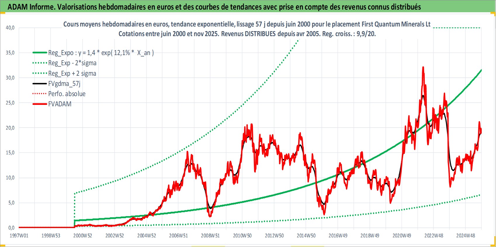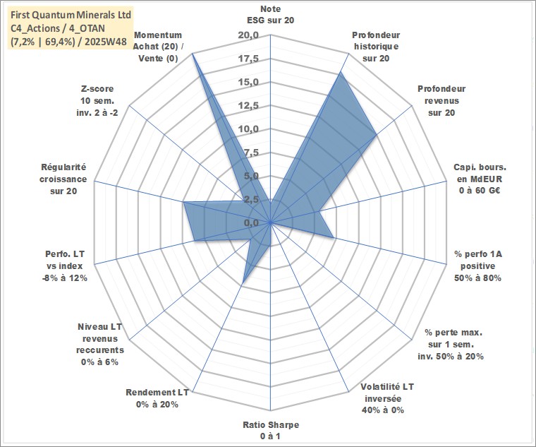 Site dédié aux investisseursPage dédiée sur site financeAnalyse des valorisations hebdomadaires de l'action First Quantum Minerals Ltd. Cet actif est cote en CAD. Les valorisations sont en contrevaleur EURO et couvrent les semaines 2000W26 a 2025W48. Les revenus de cet actif financier sont pris en compte depuis la semaine 2005W14. La note globale ESG de cet actif est estimee a 2.0 (apres rebasage entre 0 et 20).