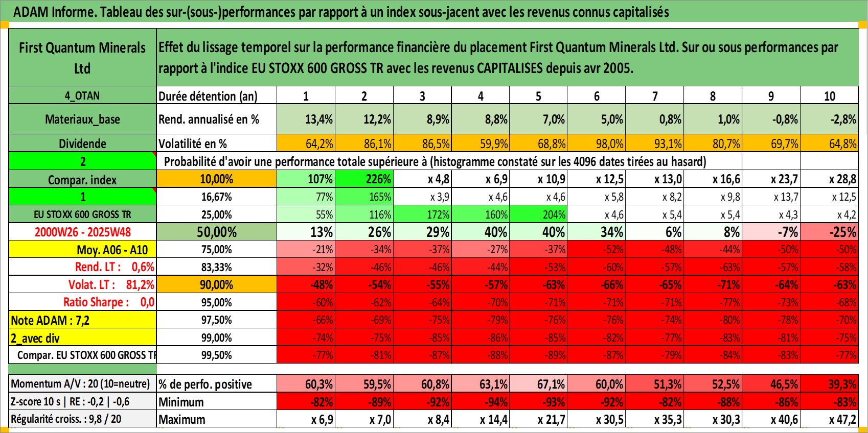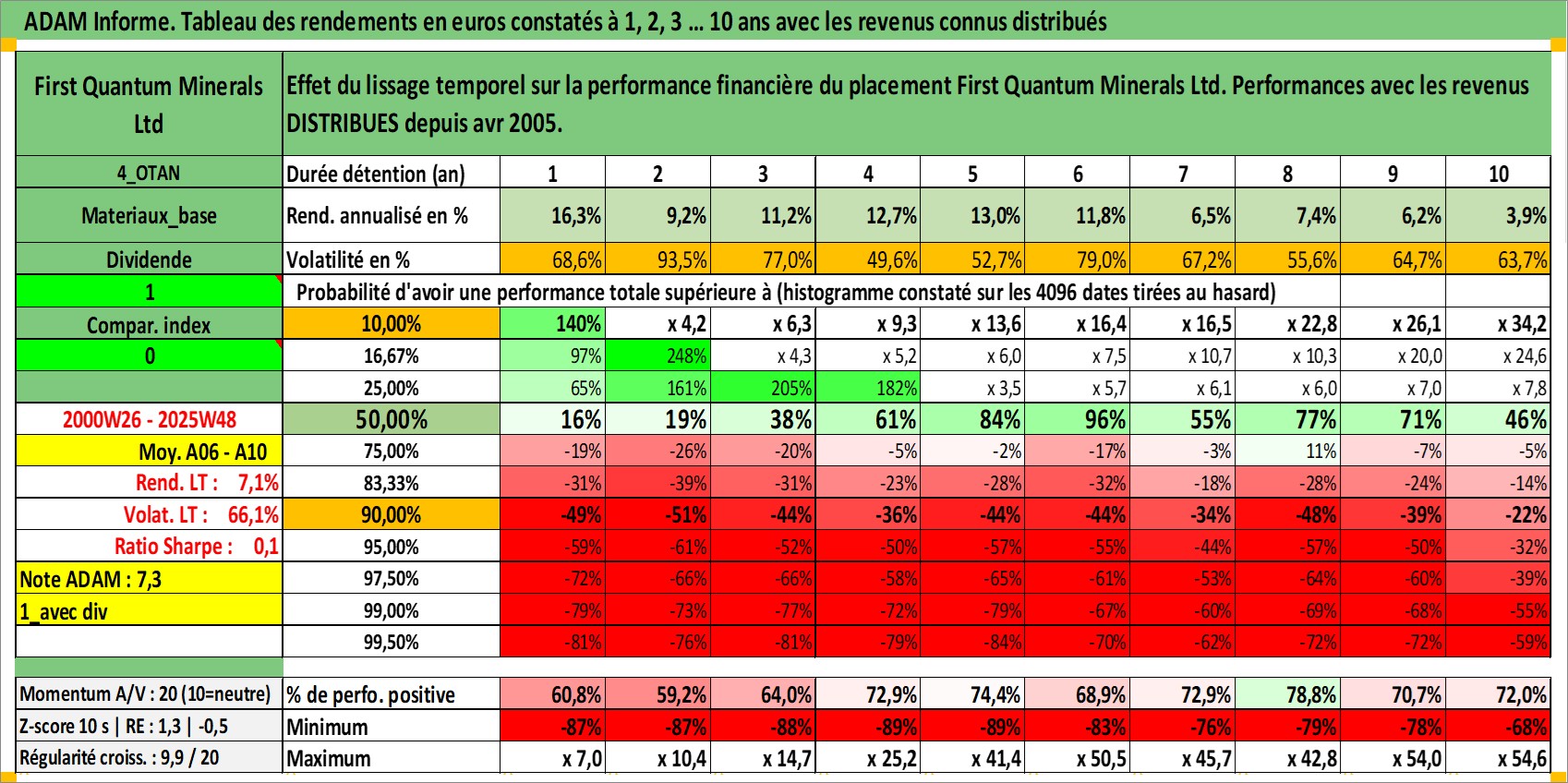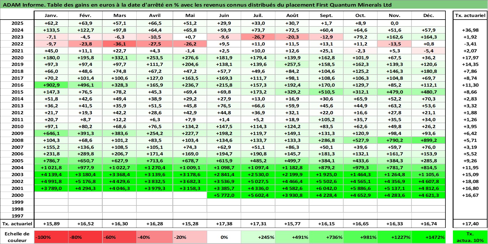Site dédié aux investisseursPage dédiée sur site financeAnalyse des valorisations hebdomadaires de l'action First Quantum Minerals Ltd. Cet actif est cote en CAD. Les valorisations sont en contrevaleur EURO et couvrent les semaines 2000W26 a 2025W48. Les revenus de cet actif financier sont pris en compte depuis la semaine 2005W14. La note globale ESG de cet actif est estimee a 2.0 (apres rebasage entre 0 et 20).