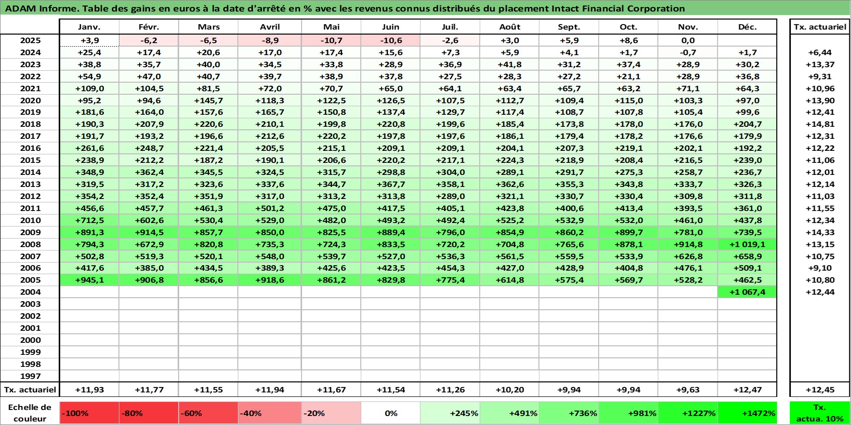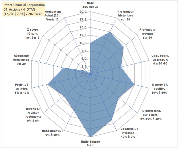 Site dédié aux investisseursPage dédiée sur site financeAnalyse des valorisations hebdomadaires de l'action Intact Financial Corporation. Cet actif est cote en CAD. Les valorisations sont en contrevaleur EURO et couvrent les semaines 2004W50 a 2025W48. Les revenus de cet actif financier sont pris en compte depuis la semaine 2005W50. La note globale ESG de cet actif est estimee a 10.0 (apres rebasage entre 0 et 20).