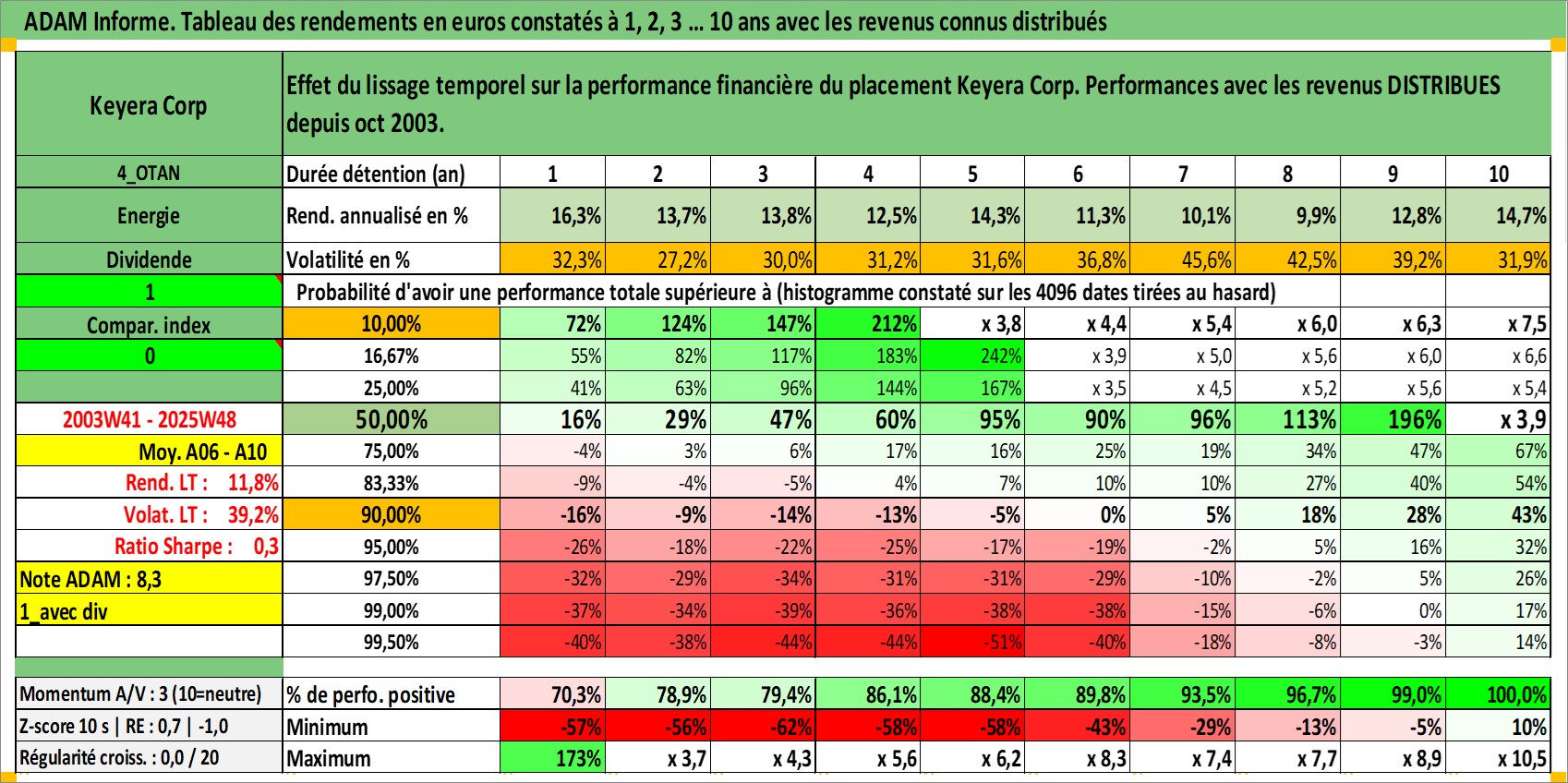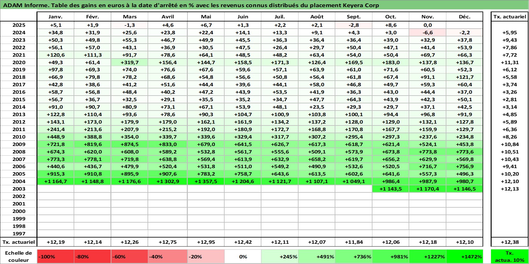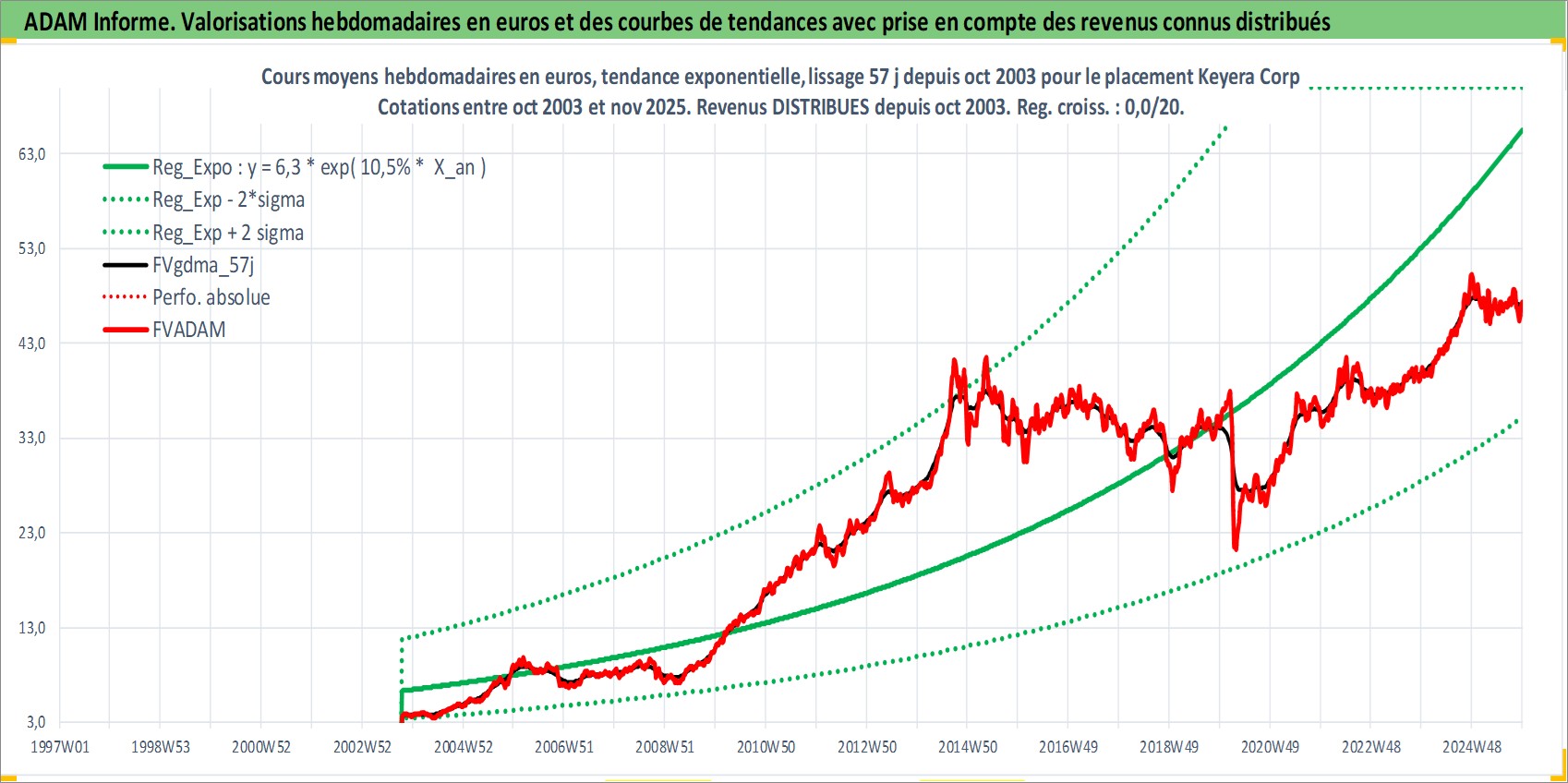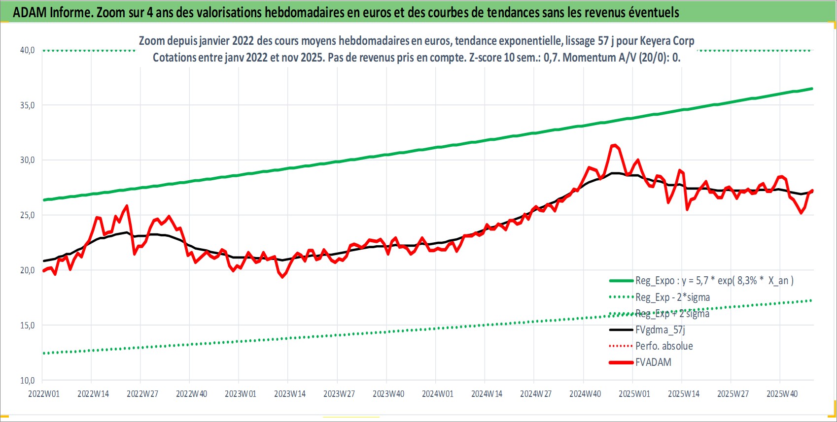 Site dédié aux investisseursPage dédiée sur site financeAnalyse des valorisations hebdomadaires de l'action Keyera Corp. Cet actif est cote en CAD. Les valorisations sont en contrevaleur EURO et couvrent les semaines 2003W41 a 2025W48. Les revenus de cet actif financier sont pris en compte depuis la semaine 2003W44. La note globale ESG de cet actif est estimee a 9.0 (apres rebasage entre 0 et 20).