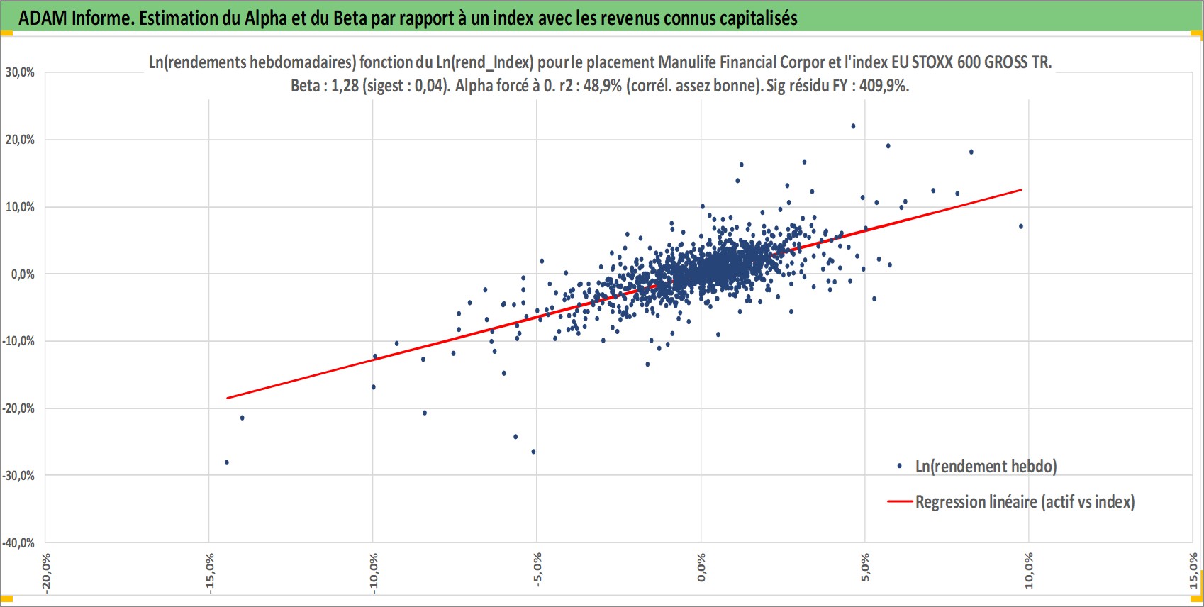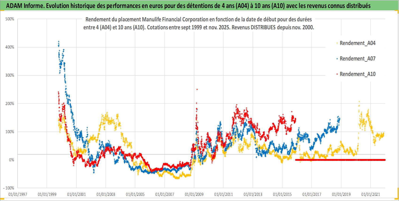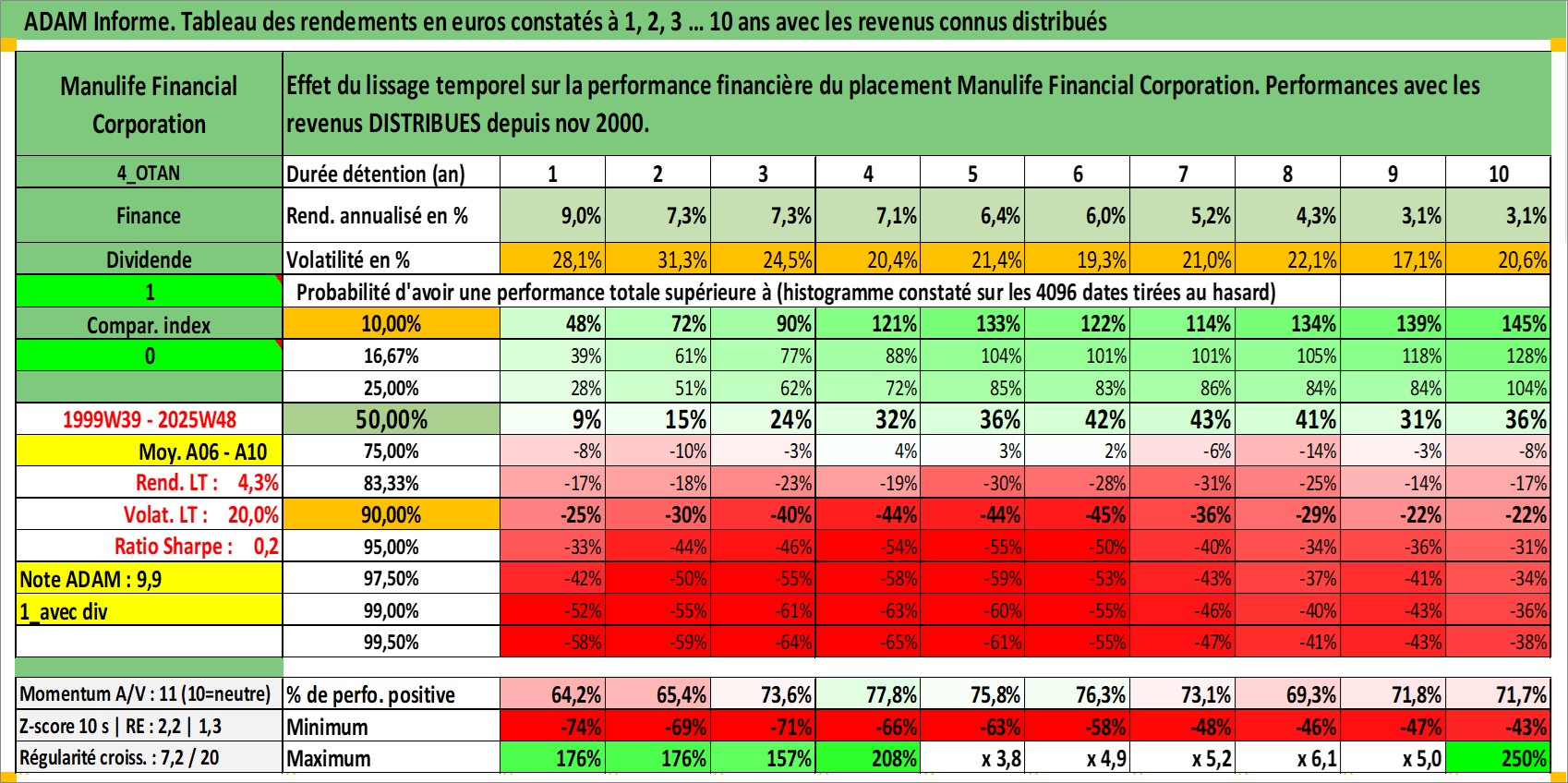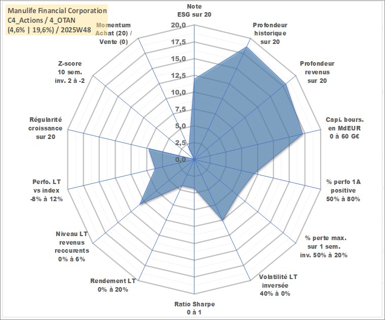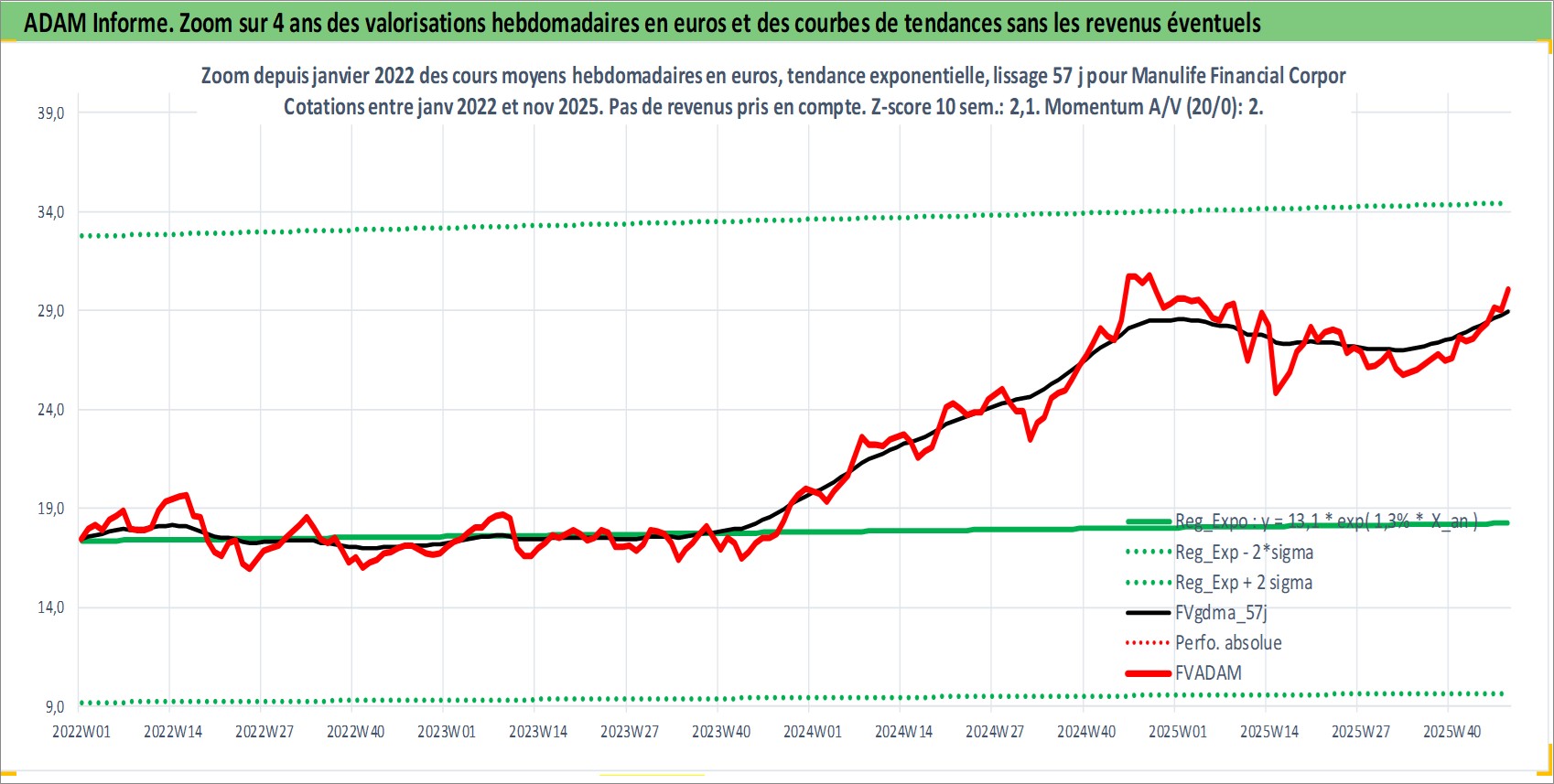 Site dédié aux investisseursPage dédiée sur site financeAnalyse des valorisations hebdomadaires de l'action Manulife Financial Corporation. Cet actif est cote en CAD. Les valorisations sont en contrevaleur EURO et couvrent les semaines 1999W39 a 2025W48. Les revenus de cet actif financier sont pris en compte depuis la semaine 2000W46. La note globale ESG de cet actif est estimee a 12.0 (apres rebasage entre 0 et 20).