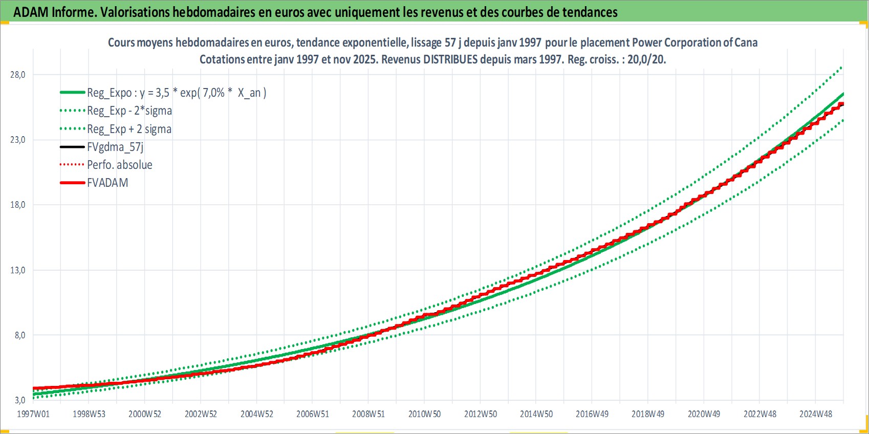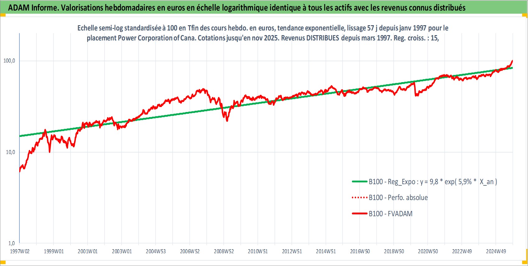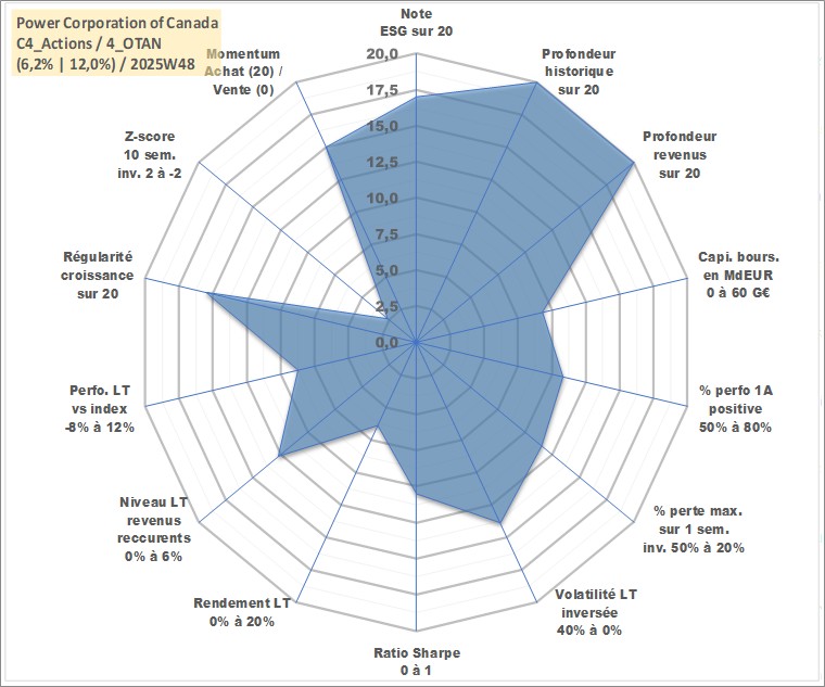 Site dédié aux investisseursPage dédiée sur site financeAnalyse des valorisations hebdomadaires de l'action Power Corporation of Canada. Cet actif est cote en CAD. Les valorisations sont en contrevaleur EURO et couvrent les semaines 1997W01 a 2025W48. Les revenus de cet actif financier sont pris en compte depuis la semaine 1997W10. La note globale ESG de cet actif est estimee a 17.0 (apres rebasage entre 0 et 20).