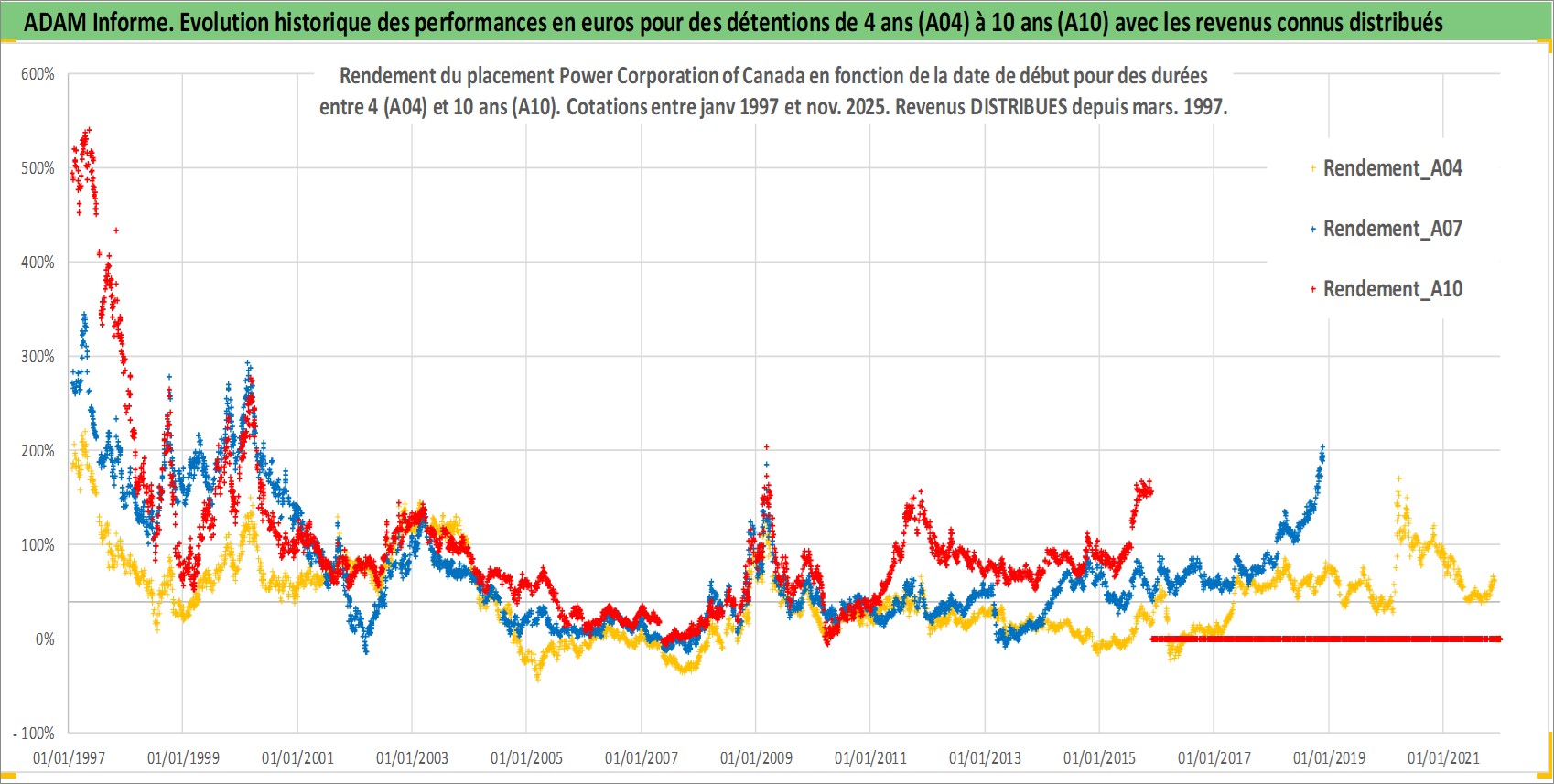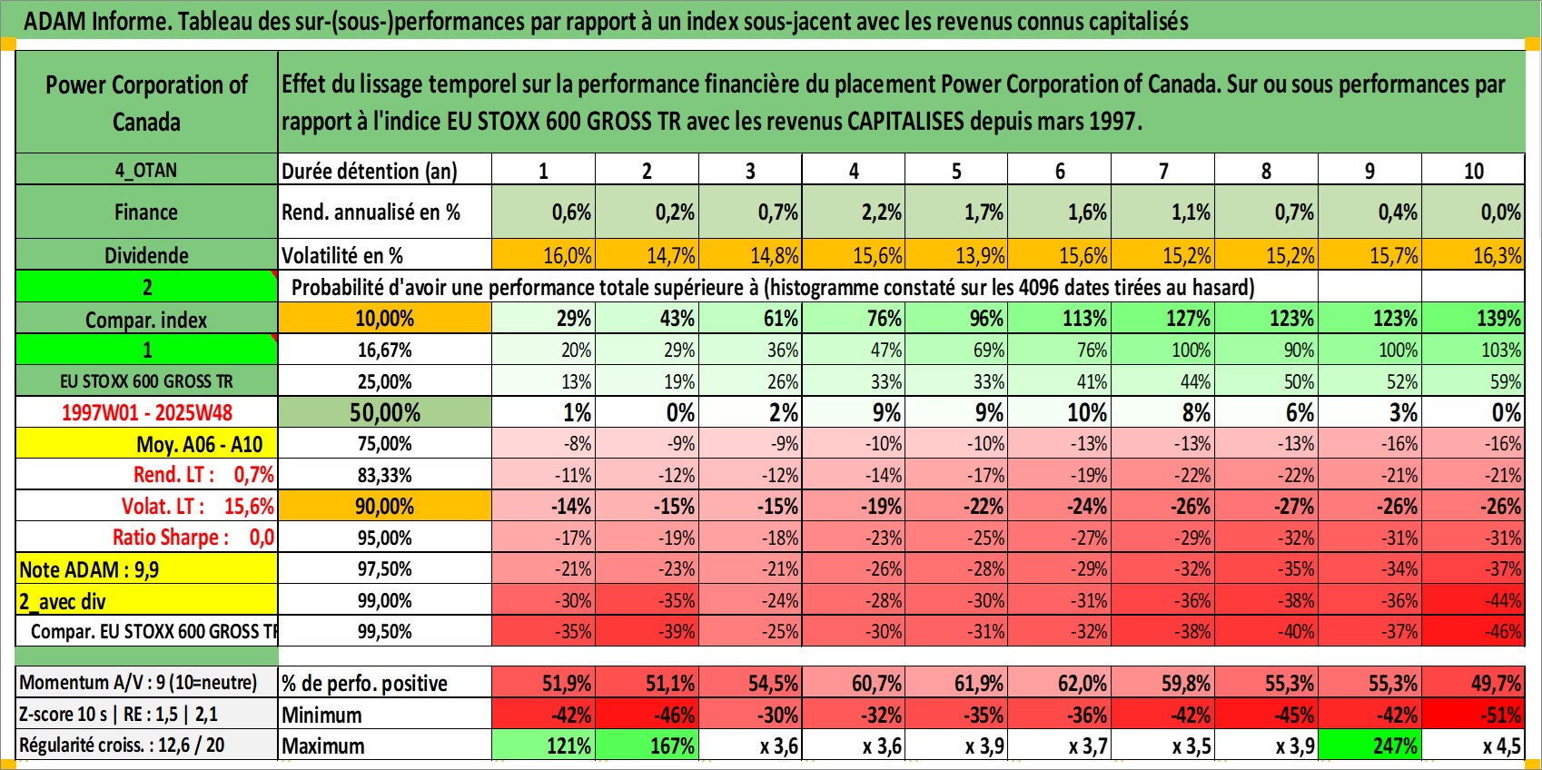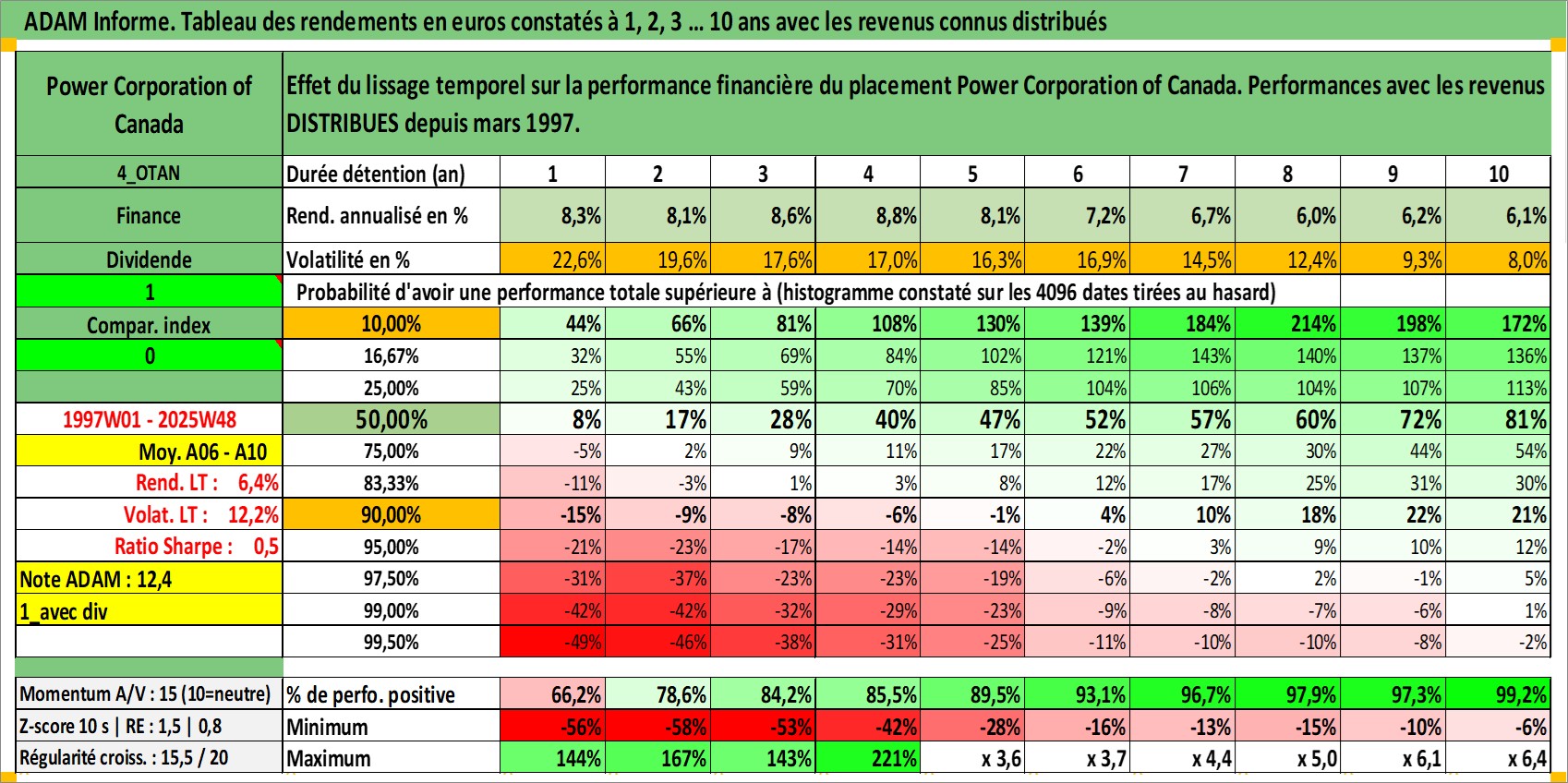 Site dédié aux investisseursPage dédiée sur site financeAnalyse des valorisations hebdomadaires de l'action Power Corporation of Canada. Cet actif est cote en CAD. Les valorisations sont en contrevaleur EURO et couvrent les semaines 1997W01 a 2025W48. Les revenus de cet actif financier sont pris en compte depuis la semaine 1997W10. La note globale ESG de cet actif est estimee a 17.0 (apres rebasage entre 0 et 20).