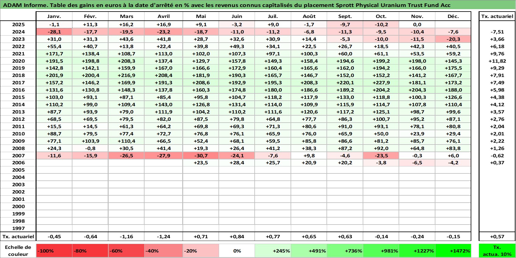 Site dédié aux investisseursPage dédiée sur site financeAnalyse des valorisations hebdomadaires du fonds Sprott Physical Uranium Trust Fund Acc. Cet actif est cote en CAD. Les valorisations sont en contrevaleur EURO et couvrent les semaines 2006W19 a 2025W48. Les revenus de cet actif financier sont pris en compte depuis la semaine 2006W19. La note ESG de cet actif n'est pas connue.