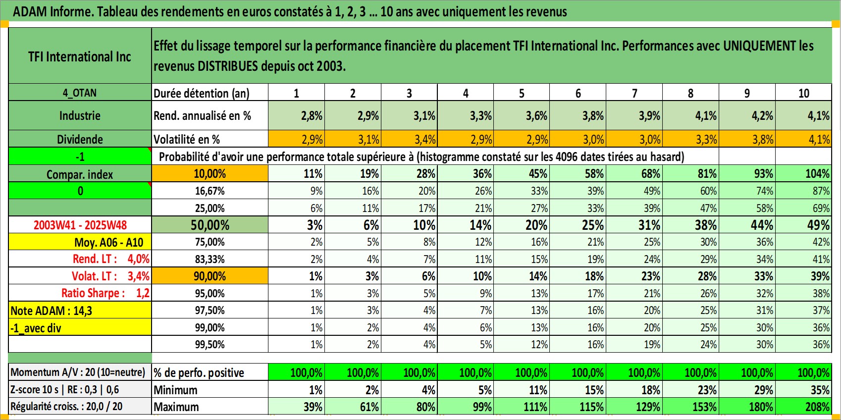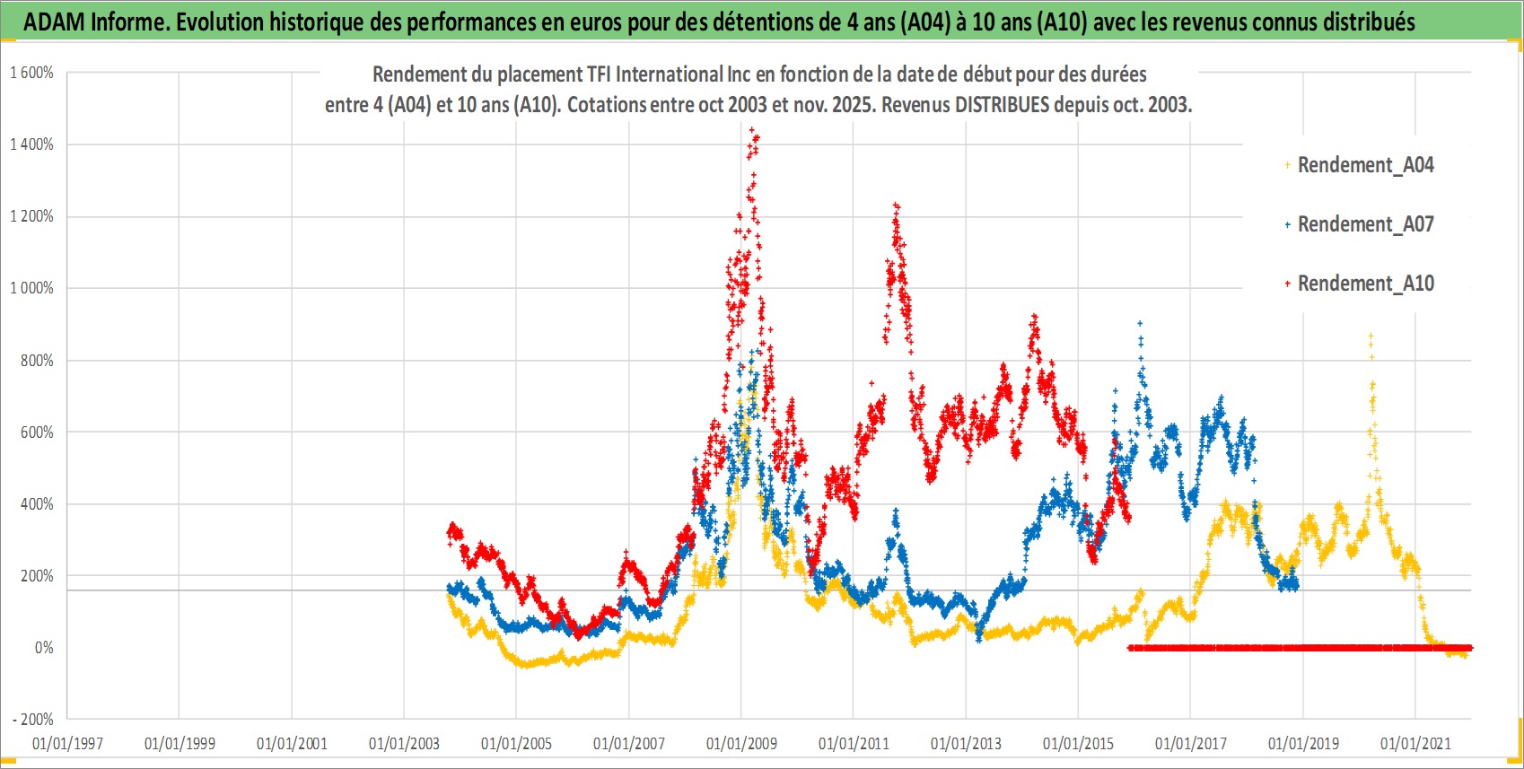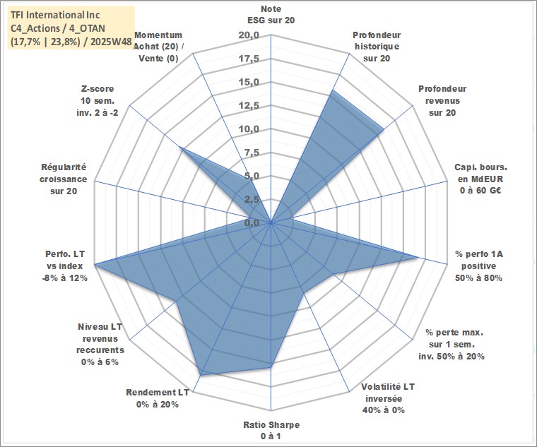 Site dédié aux investisseursPage dédiée sur site financeAnalyse des valorisations hebdomadaires de l'action TFI International Inc. Cet actif est cote en CAD. Les valorisations sont en contrevaleur EURO et couvrent les semaines 2003W41 a 2025W48. Les revenus de cet actif financier sont pris en compte depuis la semaine 2003W44. La note ESG de cet actif n'est pas connue.