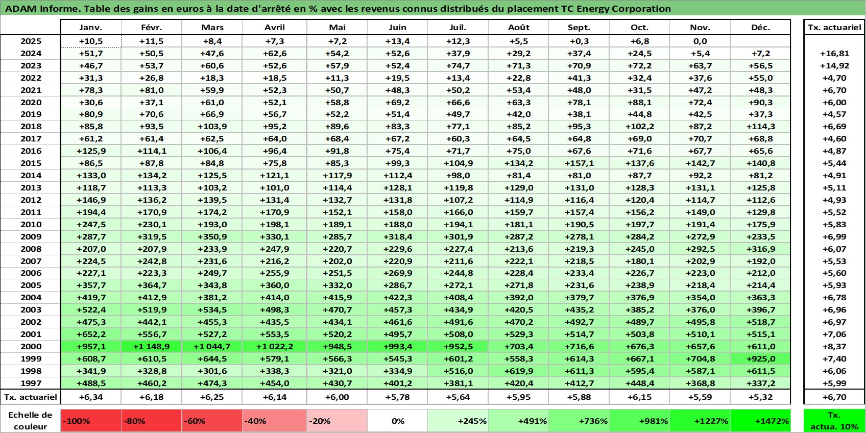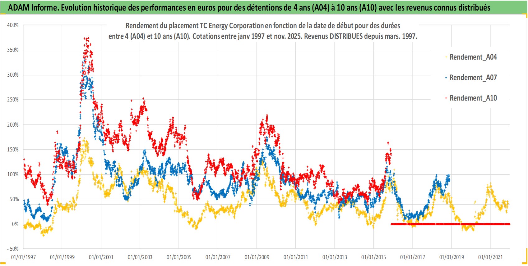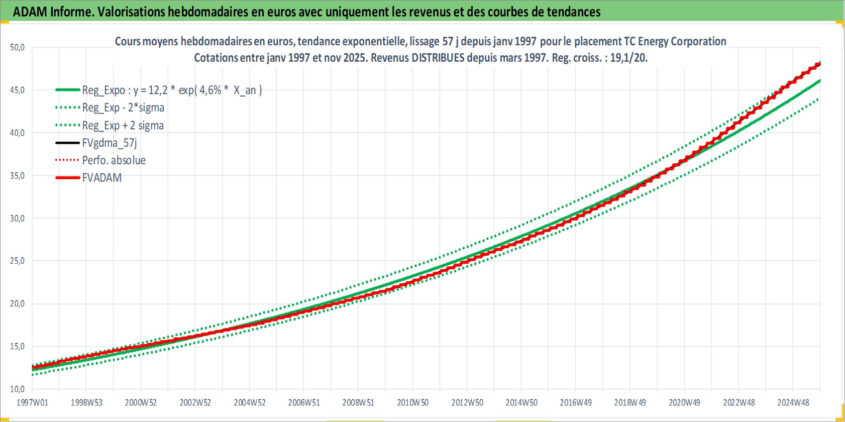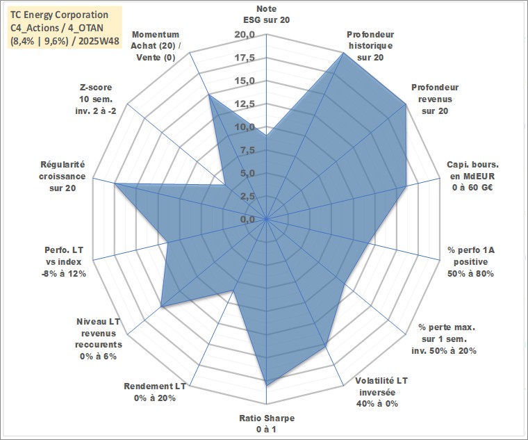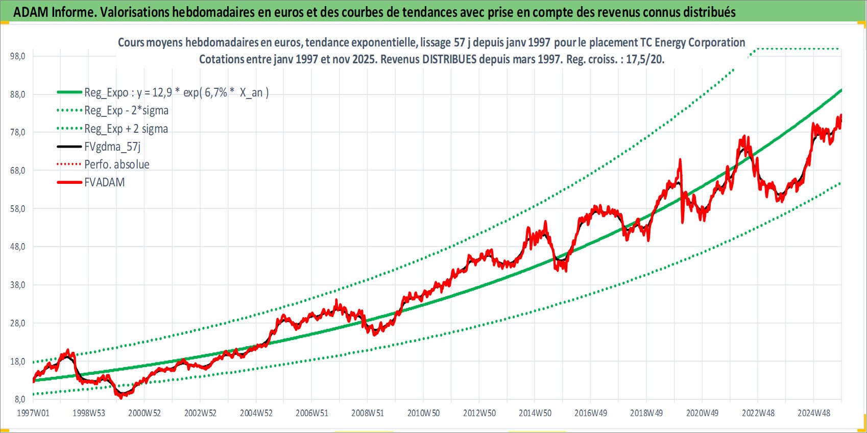 Site dédié aux investisseursPage dédiée sur site financeAnalyse des valorisations hebdomadaires de l'action TC Energy Corporation. Cet actif est cote en CAD. Les valorisations sont en contrevaleur EURO et couvrent les semaines 1997W01 a 2025W48. Les revenus de cet actif financier sont pris en compte depuis la semaine 1997W13. La note globale ESG de cet actif est estimee a 9.0 (apres rebasage entre 0 et 20).