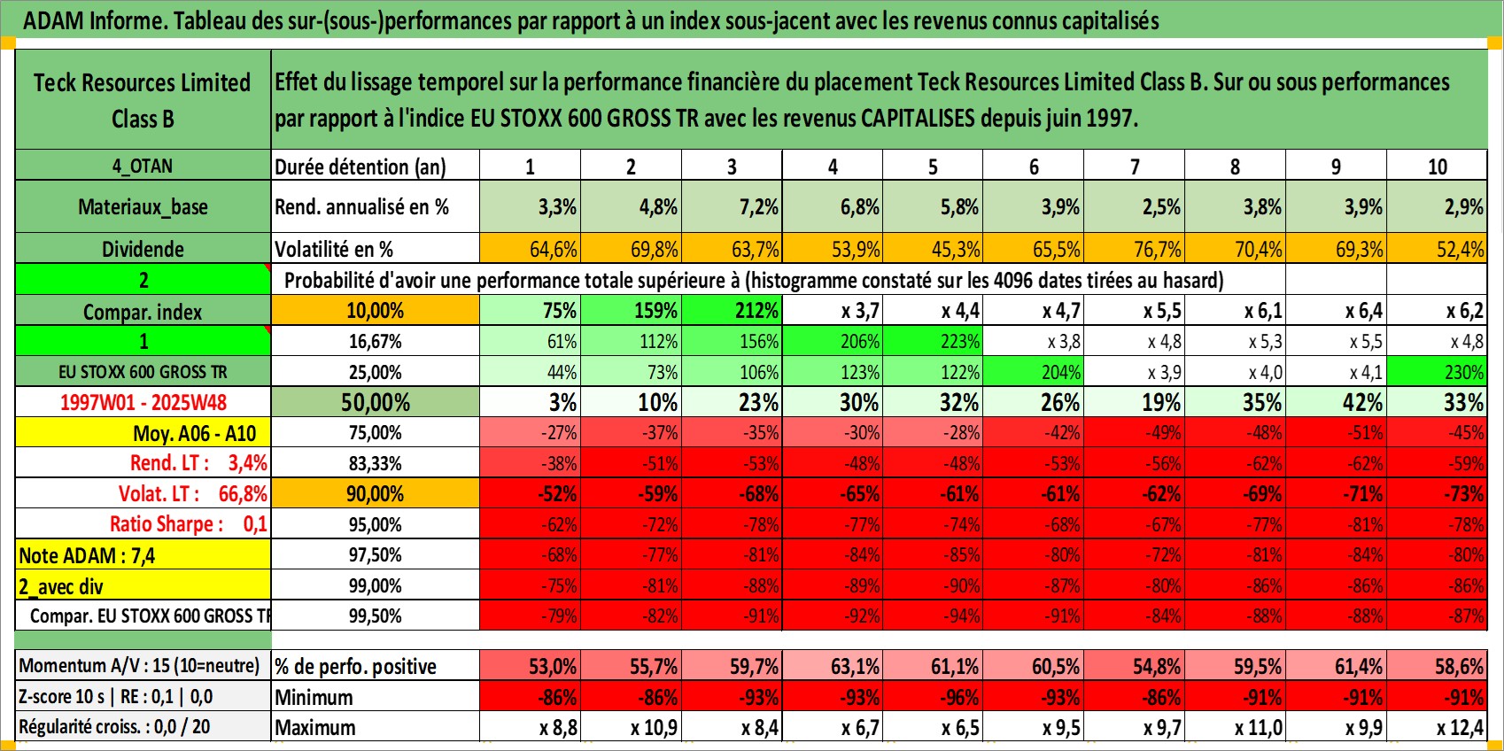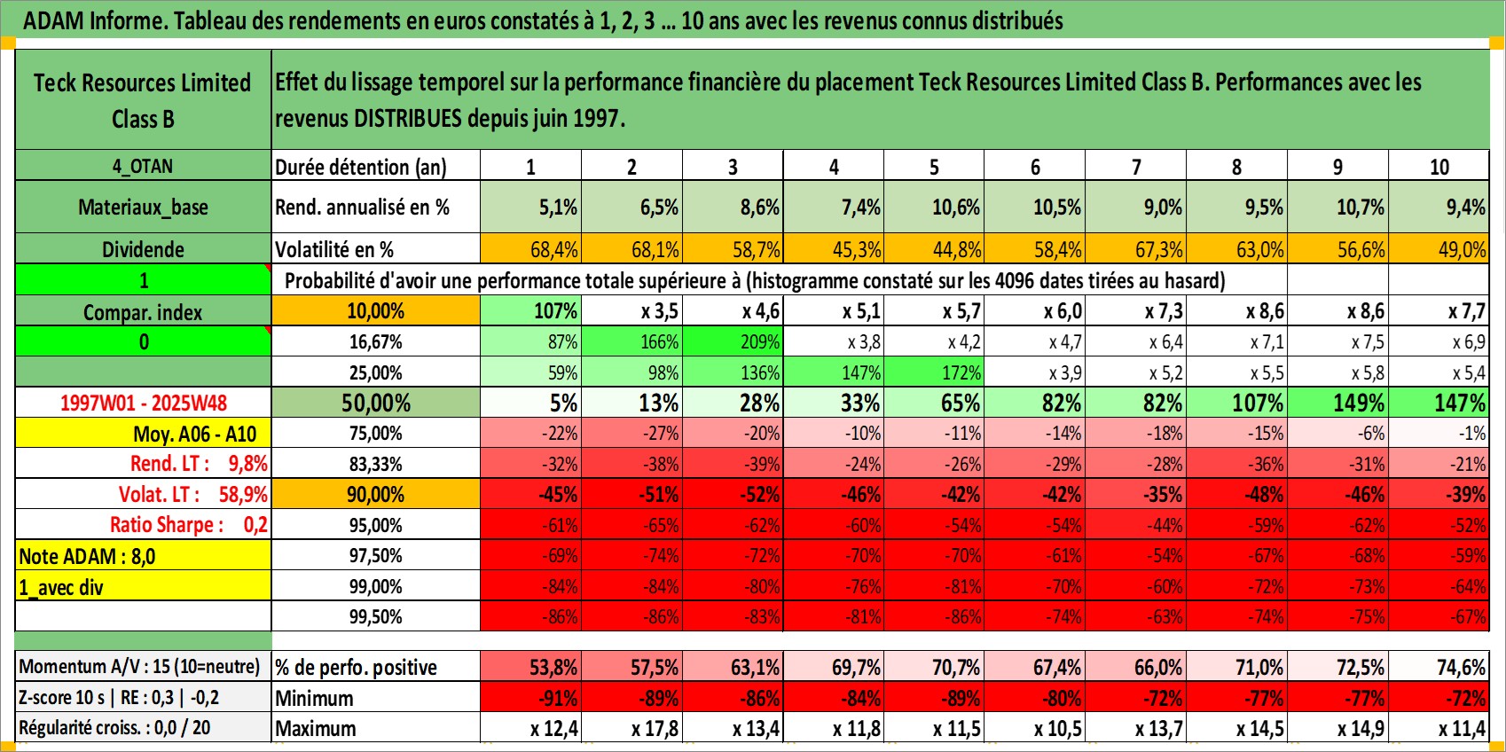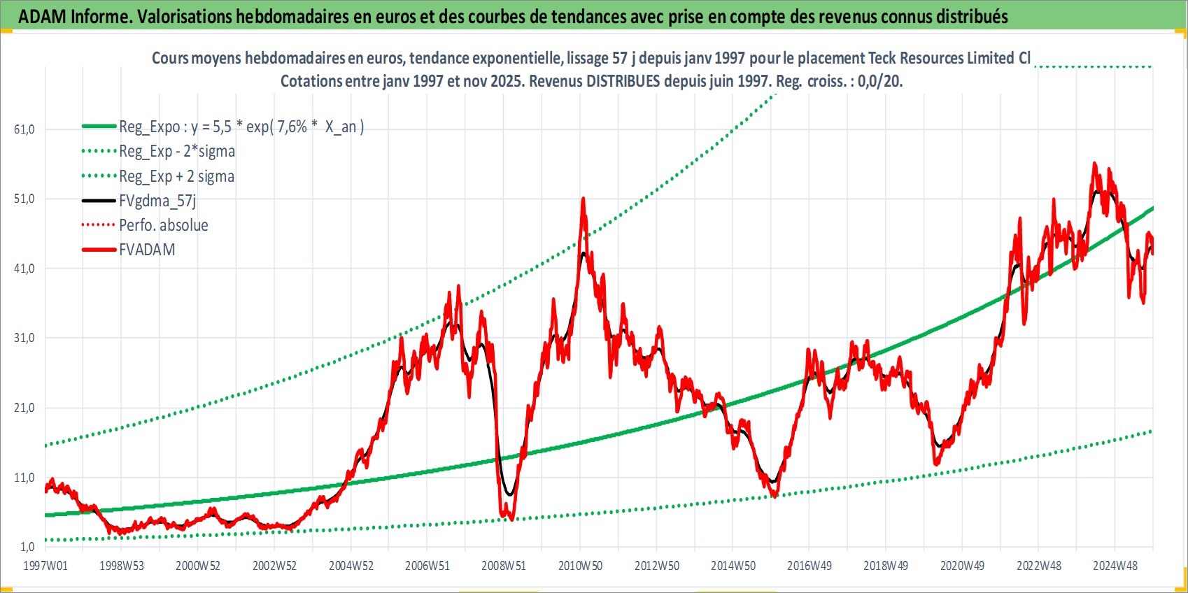Site dédié aux investisseursPage dédiée sur site financeAnalyse des valorisations hebdomadaires de l'action Teck Resources Limited Class B. Cet actif est cote en CAD. Les valorisations sont en contrevaleur EURO et couvrent les semaines 1997W01 a 2025W48. Les revenus de cet actif financier sont pris en compte depuis la semaine 1997W24. La note globale ESG de cet actif est estimee a 9.0 (apres rebasage entre 0 et 20).