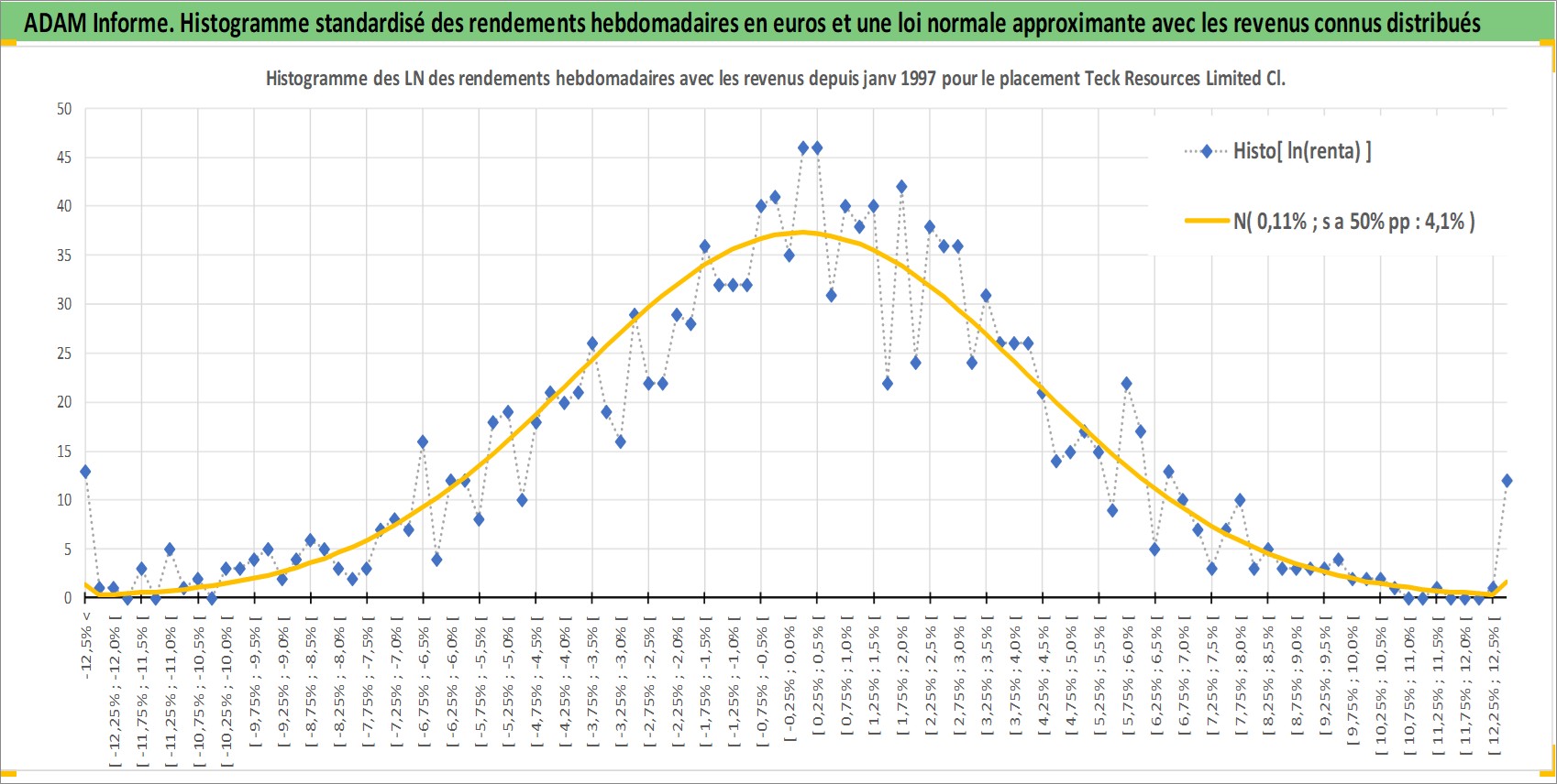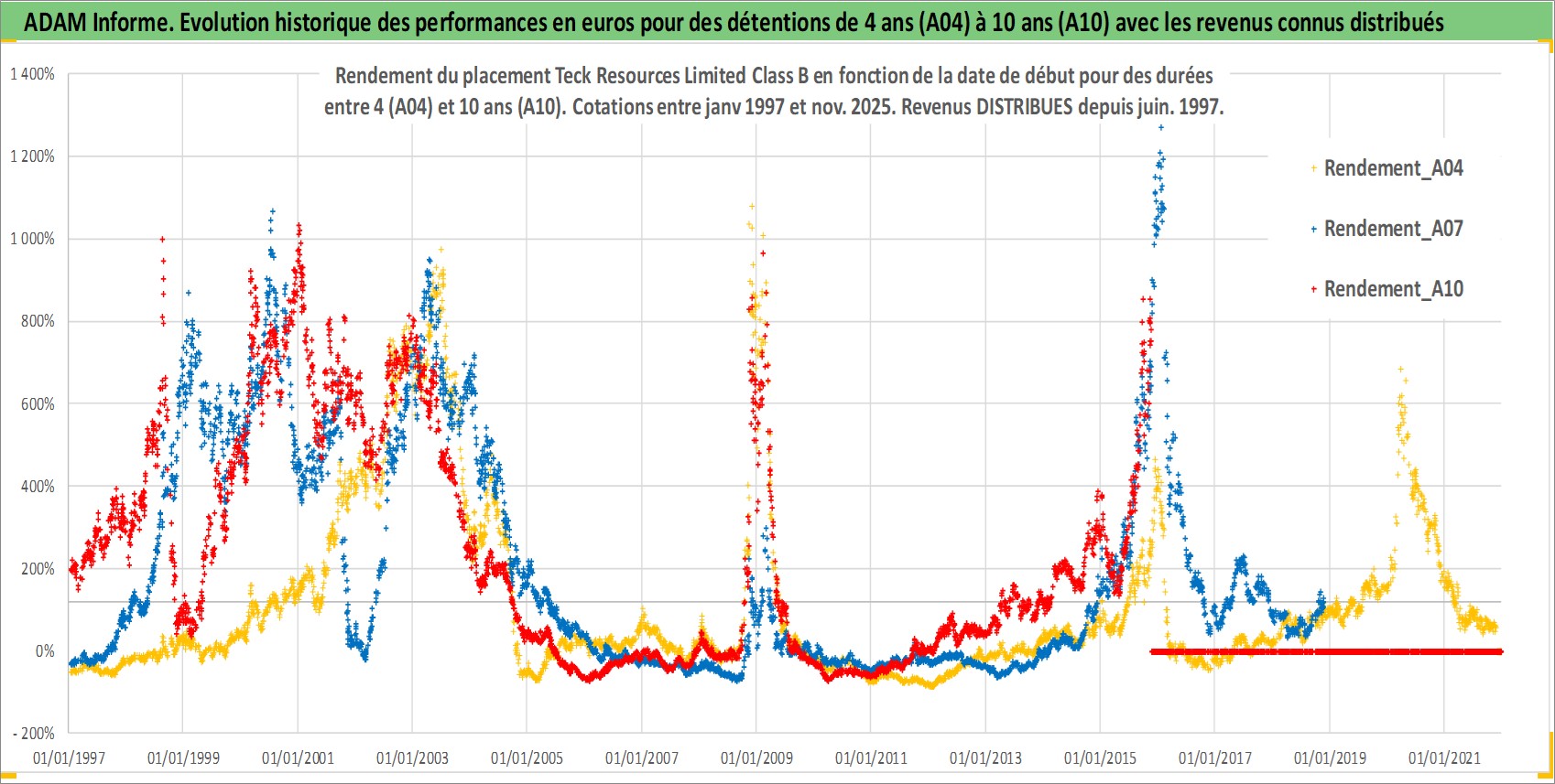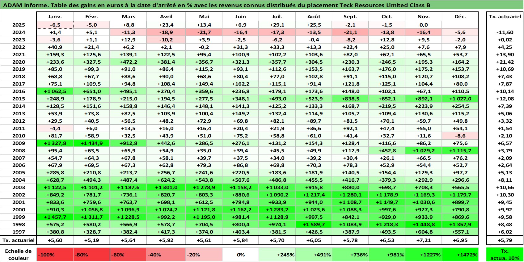 Site dédié aux investisseursPage dédiée sur site financeAnalyse des valorisations hebdomadaires de l'action Teck Resources Limited Class B. Cet actif est cote en CAD. Les valorisations sont en contrevaleur EURO et couvrent les semaines 1997W01 a 2025W48. Les revenus de cet actif financier sont pris en compte depuis la semaine 1997W24. La note globale ESG de cet actif est estimee a 9.0 (apres rebasage entre 0 et 20).