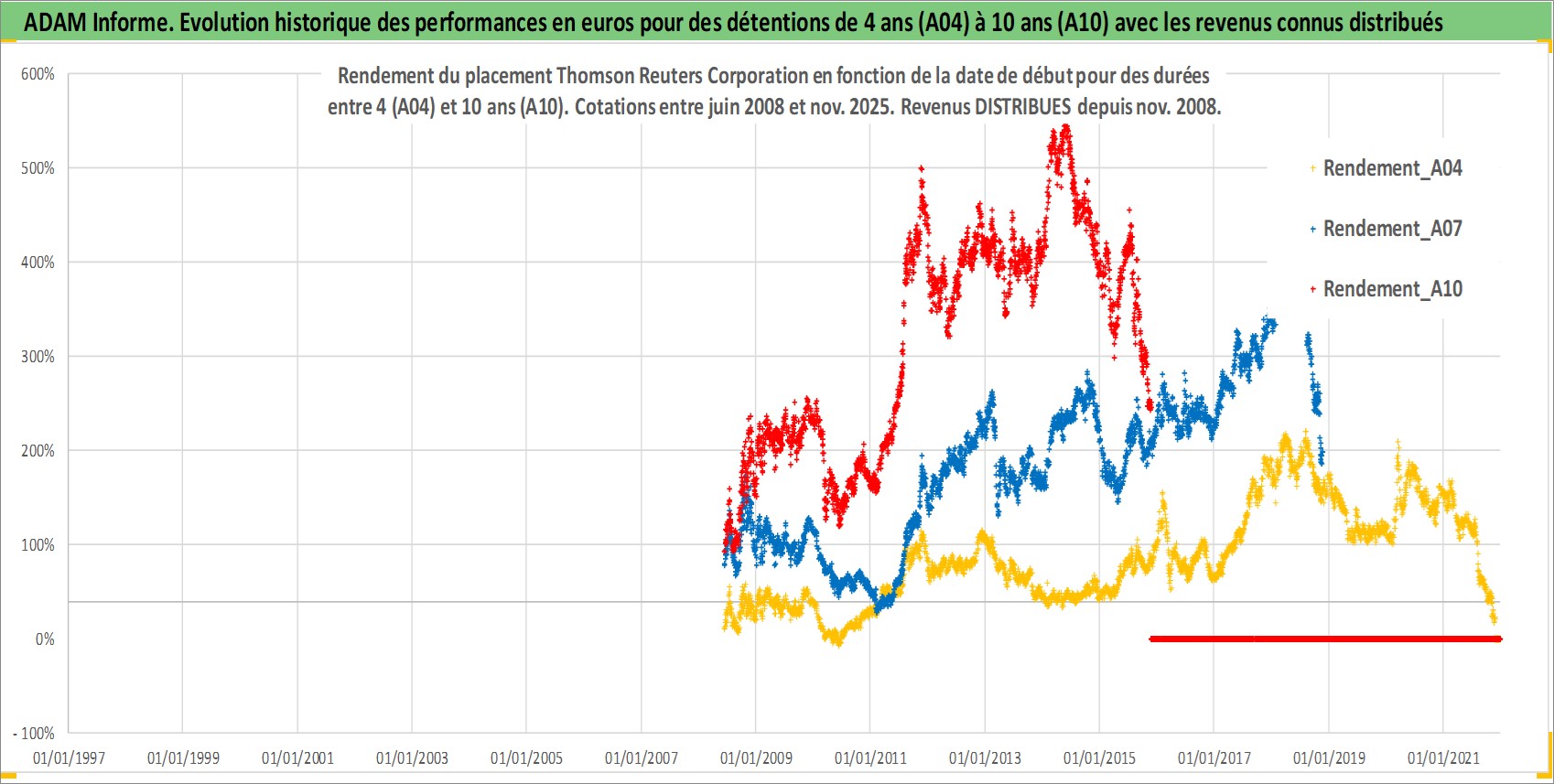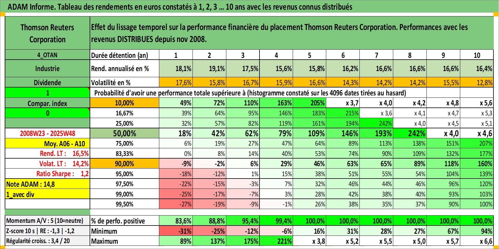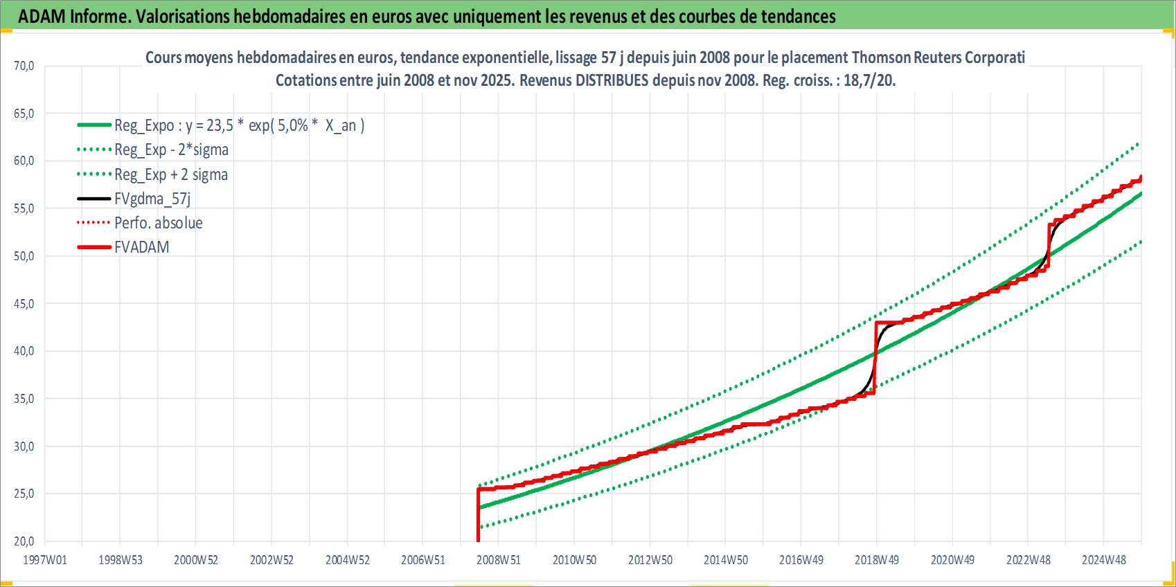 Site dédié aux investisseursPage dédiée sur site financeAnalyse des valorisations hebdomadaires de l'action Thomson Reuters Corporation. Cet actif est cote en CAD. Les valorisations sont en contrevaleur EURO et couvrent les semaines 2008W23 a 2025W48. Les revenus de cet actif financier sont pris en compte depuis la semaine 2008W47. La note globale ESG de cet actif est estimee a 18.0 (apres rebasage entre 0 et 20).