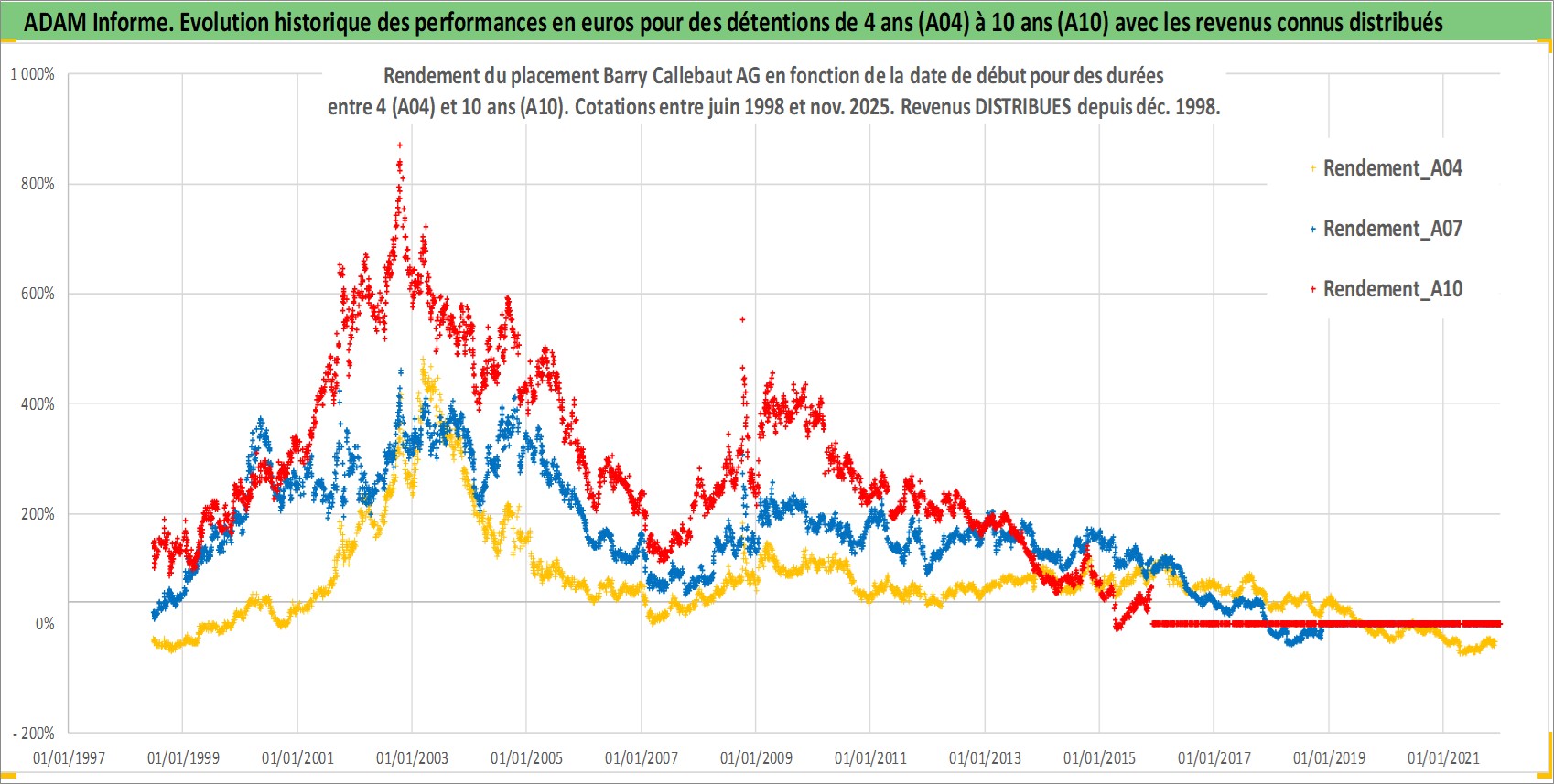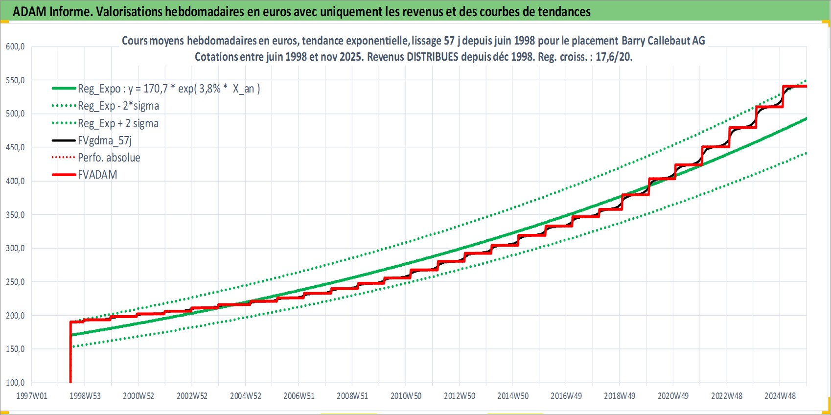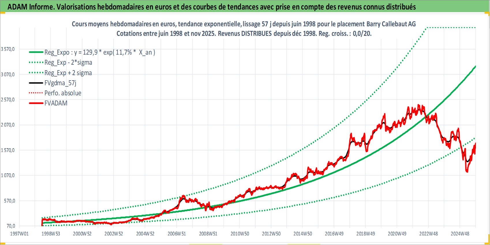 Site dédié aux investisseursPage dédiée sur site financeAnalyse des valorisations hebdomadaires de l'action Barry Callebaut AG. Cet actif est cote en CHF. Les valorisations sont en contrevaleur EURO et couvrent les semaines 1998W25 a 2025W48. Les revenus de cet actif financier sont pris en compte depuis la semaine 1998W51. La note globale ESG de cet actif est estimee a 14.0 (apres rebasage entre 0 et 20).