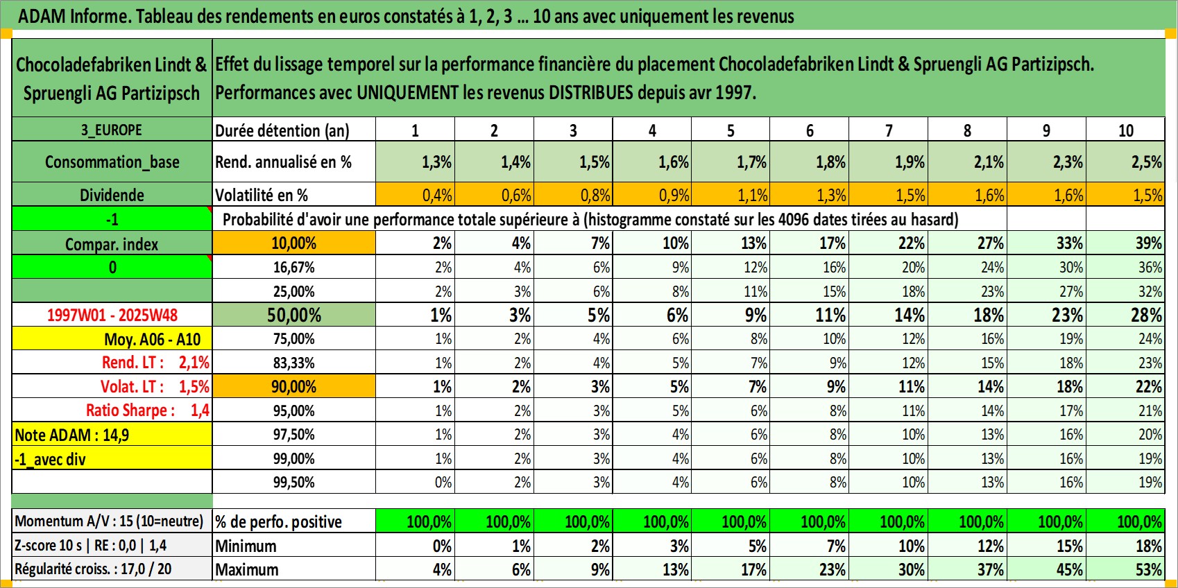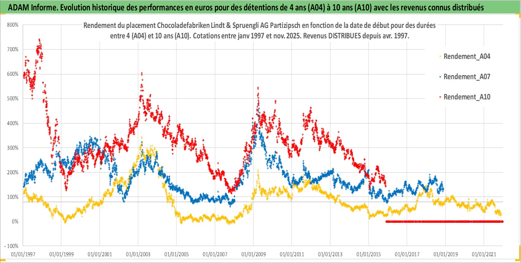 Site dédié aux investisseursPage dédiée sur site financeAnalyse des valorisations hebdomadaires de l'action Chocoladefabriken Lindt & Spruengli AG Partizipsch. Cet actif est cote en CHF. Les valorisations sont en contrevaleur EURO et couvrent les semaines 1997W01 a 2025W48. Les revenus de cet actif financier sont pris en compte depuis la semaine 1997W18. La note ESG de cet actif n'est pas connue.