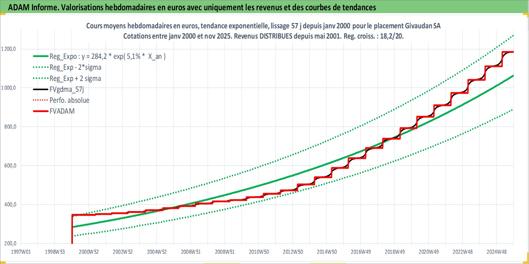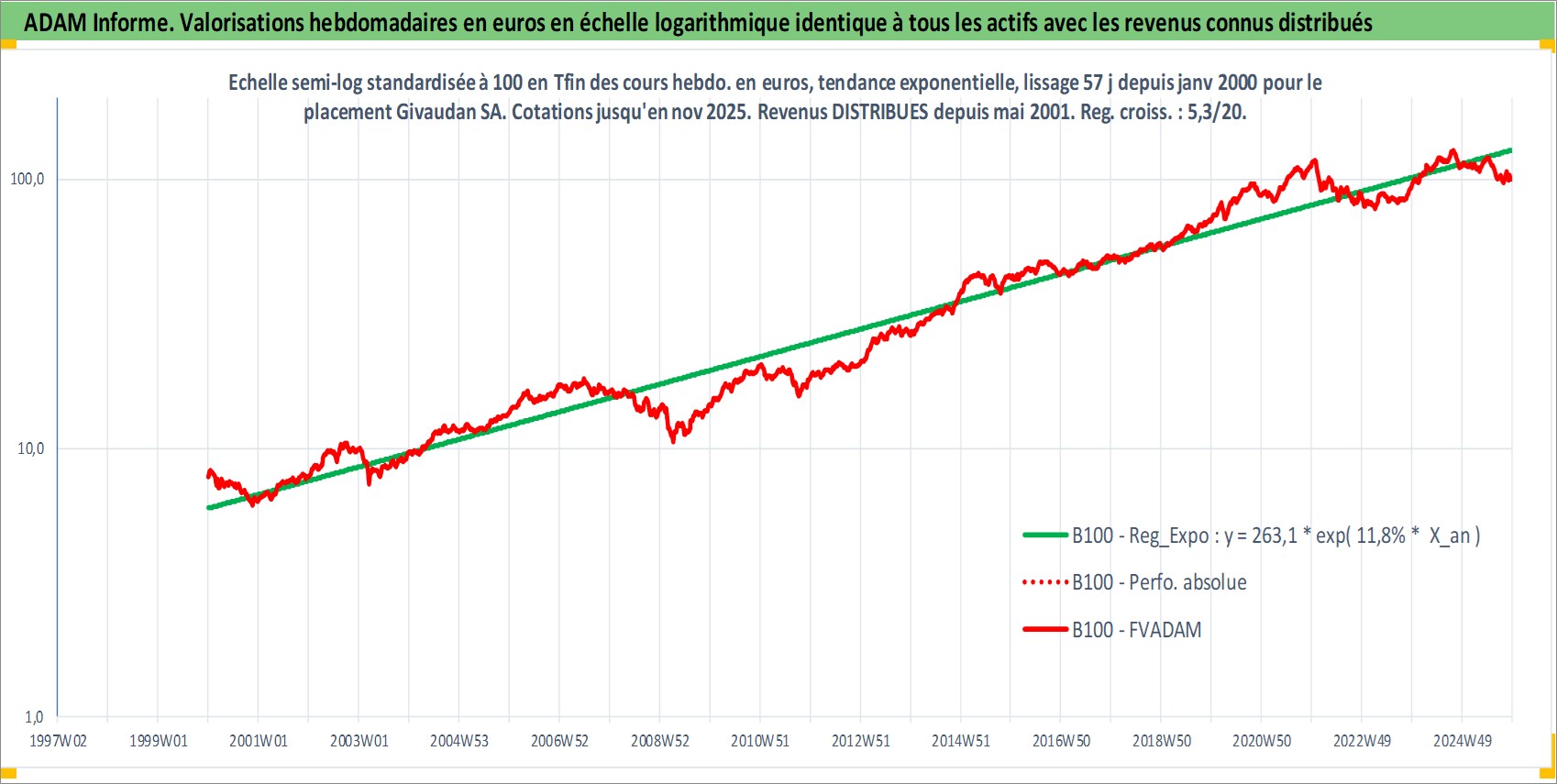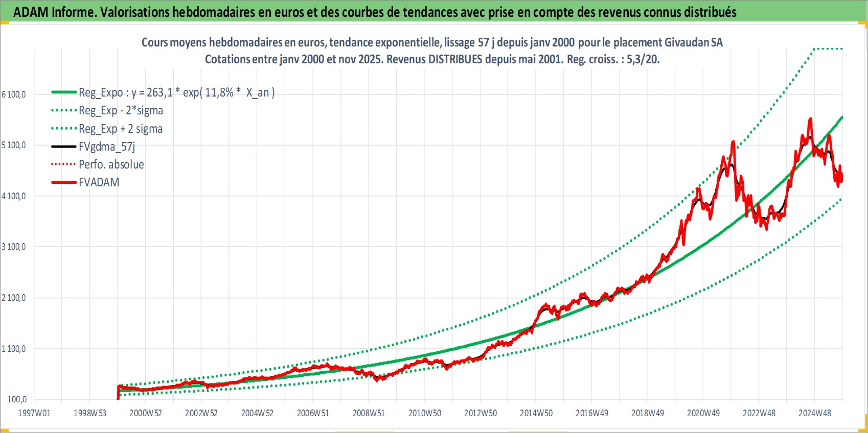 Site dédié aux investisseursPage dédiée sur site financeAnalyse des valorisations hebdomadaires de l'action Givaudan SA. Cet actif est cote en CHF. Les valorisations sont en contrevaleur EURO et couvrent les semaines 2000W01 a 2025W48. Les revenus de cet actif financier sont pris en compte depuis la semaine 2001W21. La note globale ESG de cet actif est estimee a 11.0 (apres rebasage entre 0 et 20).