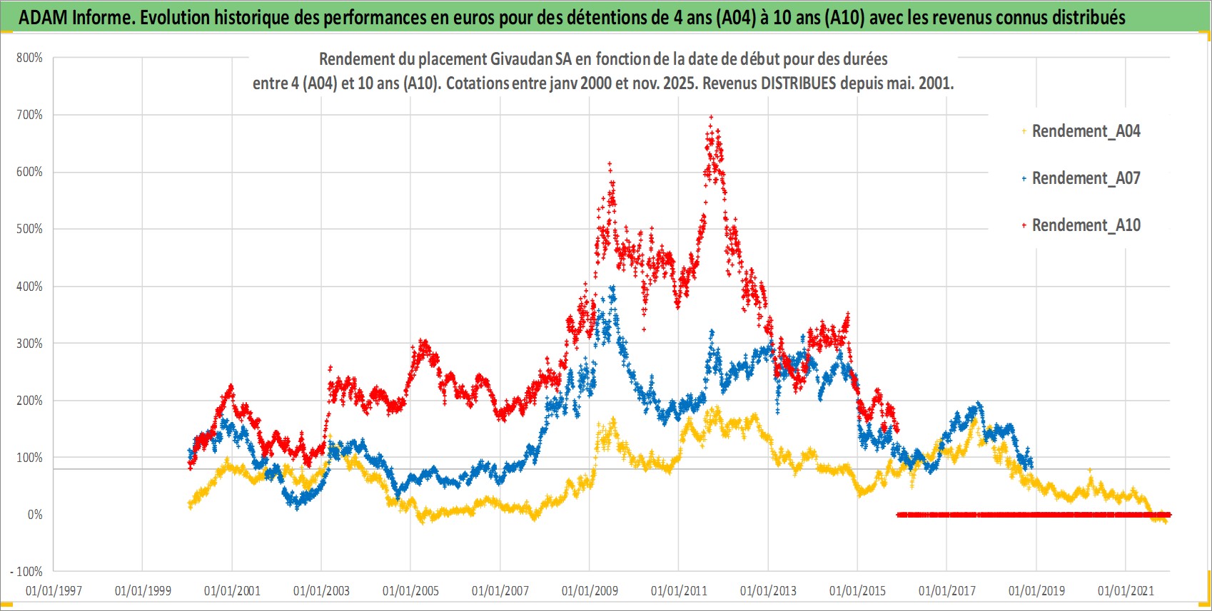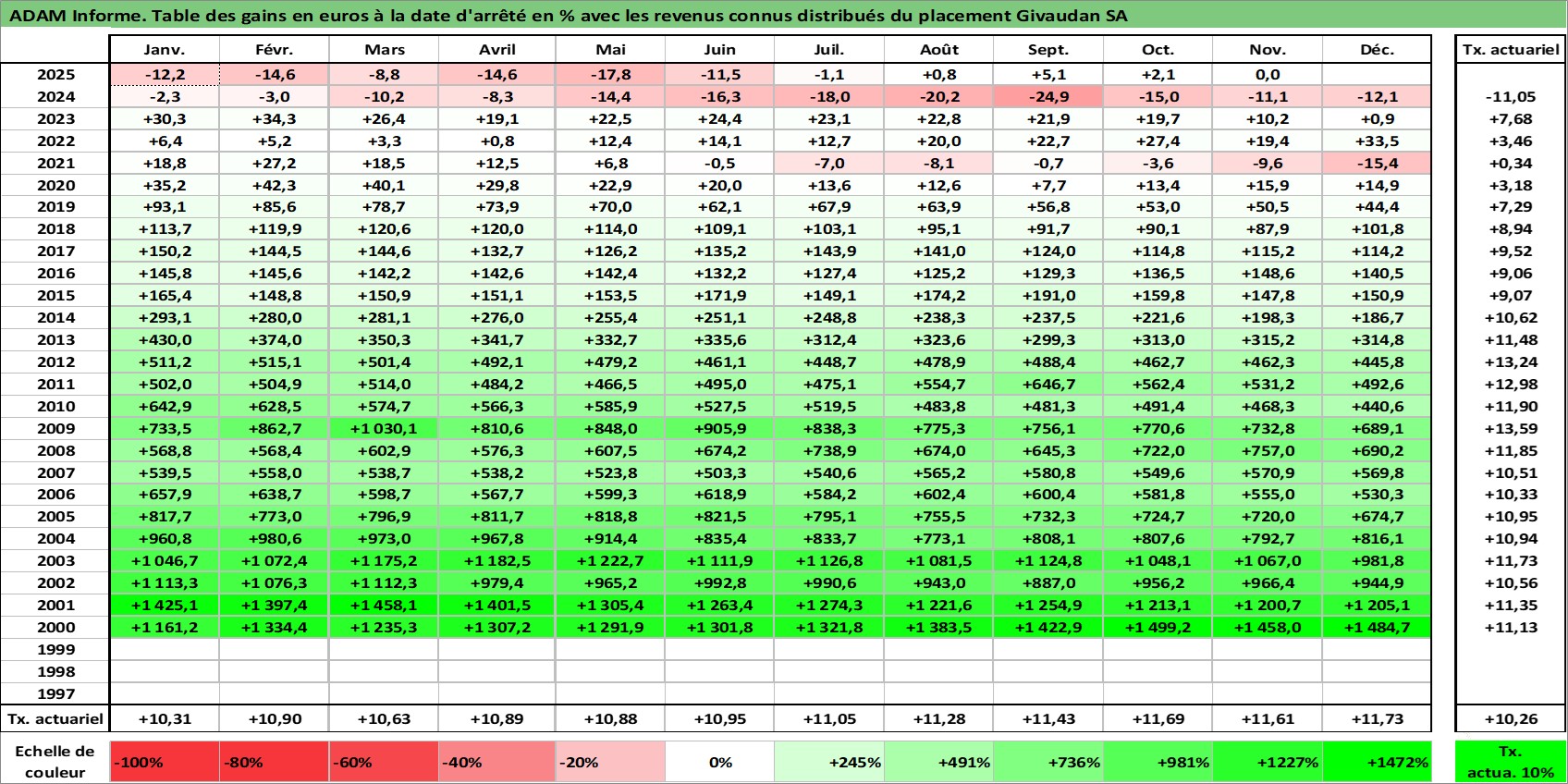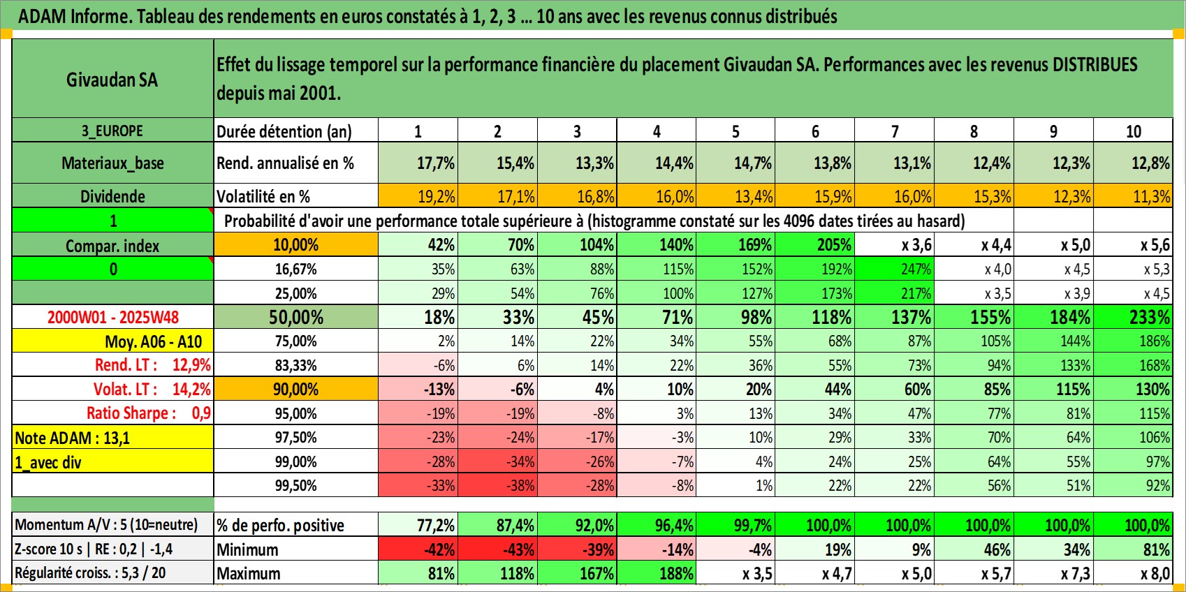 Site dédié aux investisseursPage dédiée sur site financeAnalyse des valorisations hebdomadaires de l'action Givaudan SA. Cet actif est cote en CHF. Les valorisations sont en contrevaleur EURO et couvrent les semaines 2000W01 a 2025W48. Les revenus de cet actif financier sont pris en compte depuis la semaine 2001W21. La note globale ESG de cet actif est estimee a 11.0 (apres rebasage entre 0 et 20).