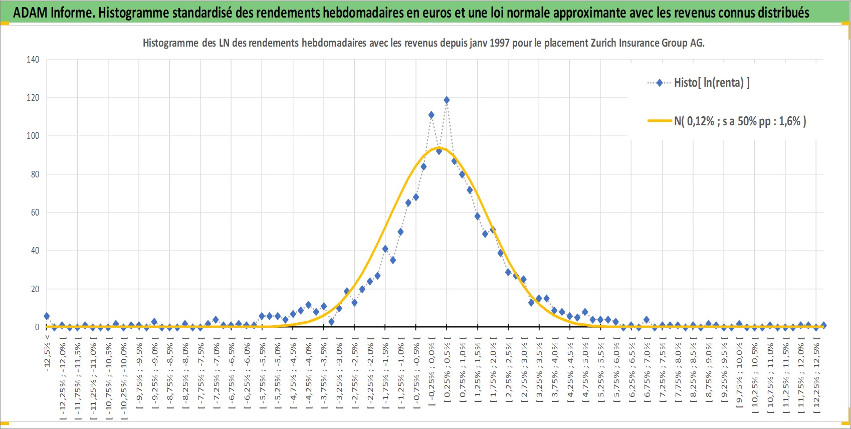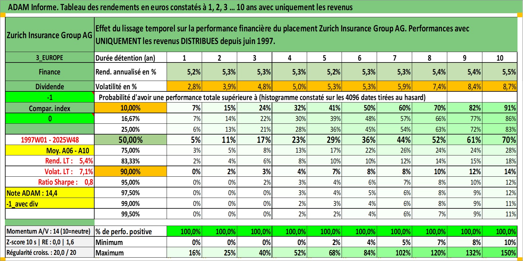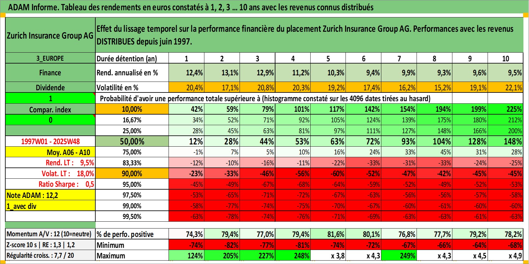Site dédié aux investisseursPage dédiée sur site financeAnalyse des valorisations hebdomadaires de l'action Zurich Insurance Group AG. Cet actif est cote en CHF. Les valorisations sont en contrevaleur EURO et couvrent les semaines 1997W01 a 2025W48. Les revenus de cet actif financier sont pris en compte depuis la semaine 1997W25. La note globale ESG de cet actif est estimee a 11.0 (apres rebasage entre 0 et 20).