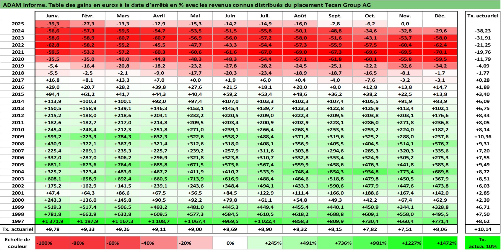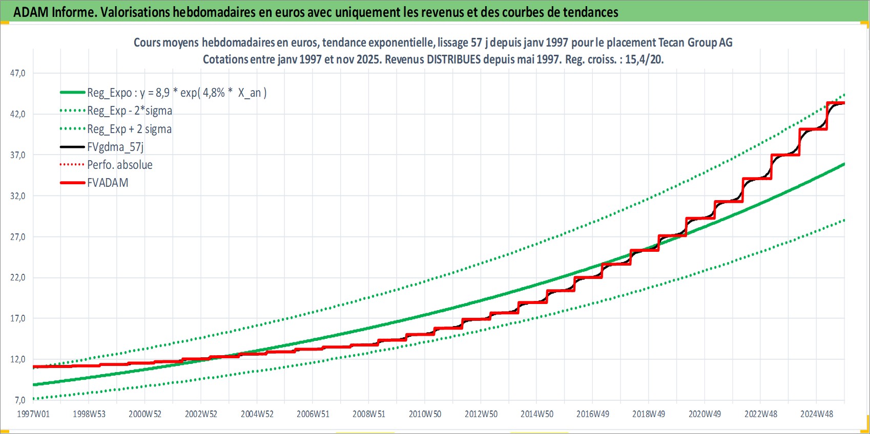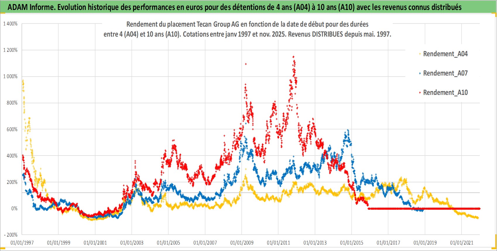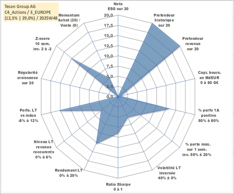 Site dédié aux investisseursPage dédiée sur site financeAnalyse des valorisations hebdomadaires de l'action Tecan Group AG. Cet actif est cote en CHF. Les valorisations sont en contrevaleur EURO et couvrent les semaines 1997W01 a 2025W48. Les revenus de cet actif financier sont pris en compte depuis la semaine 1997W21. La note ESG de cet actif n'est pas connue.