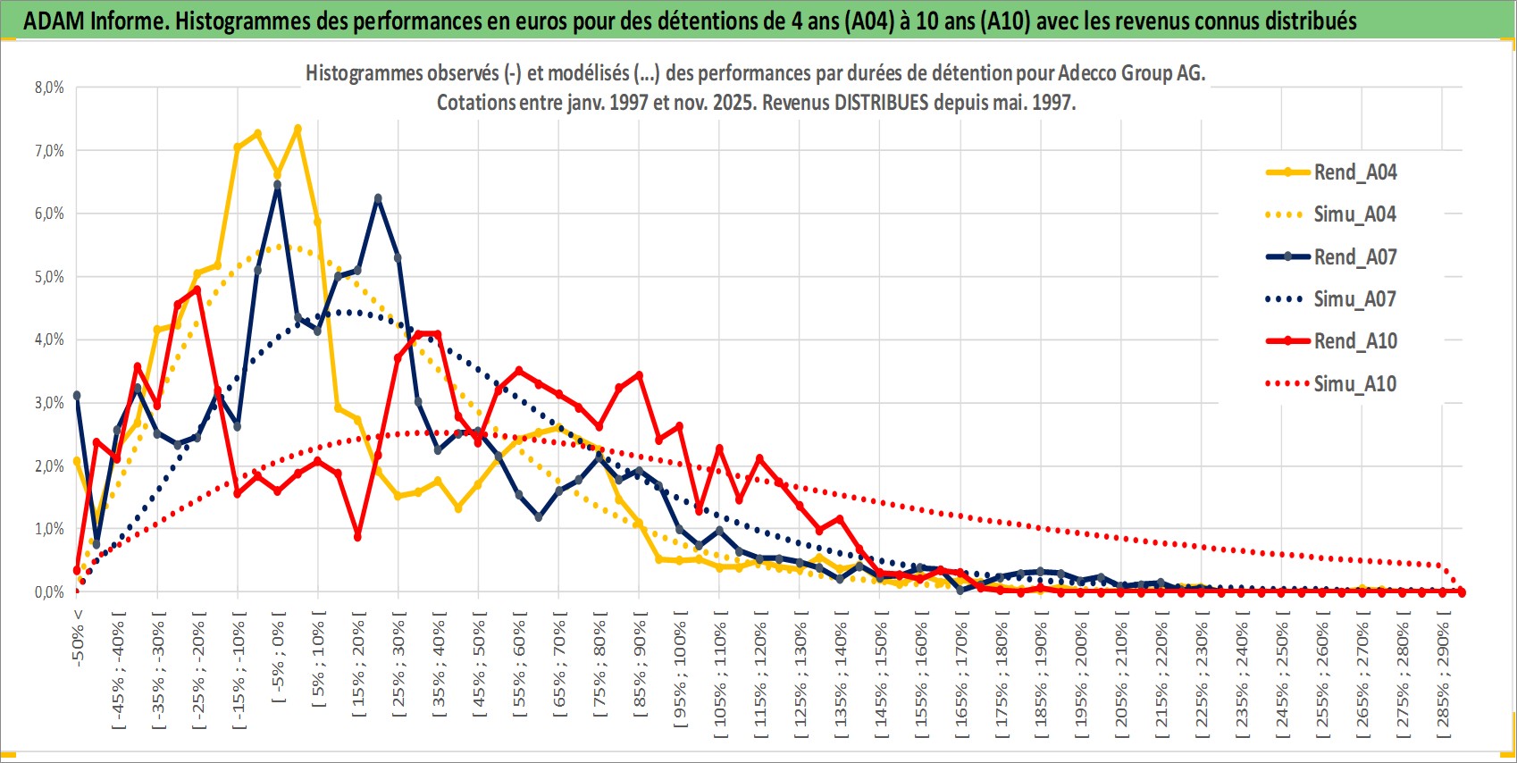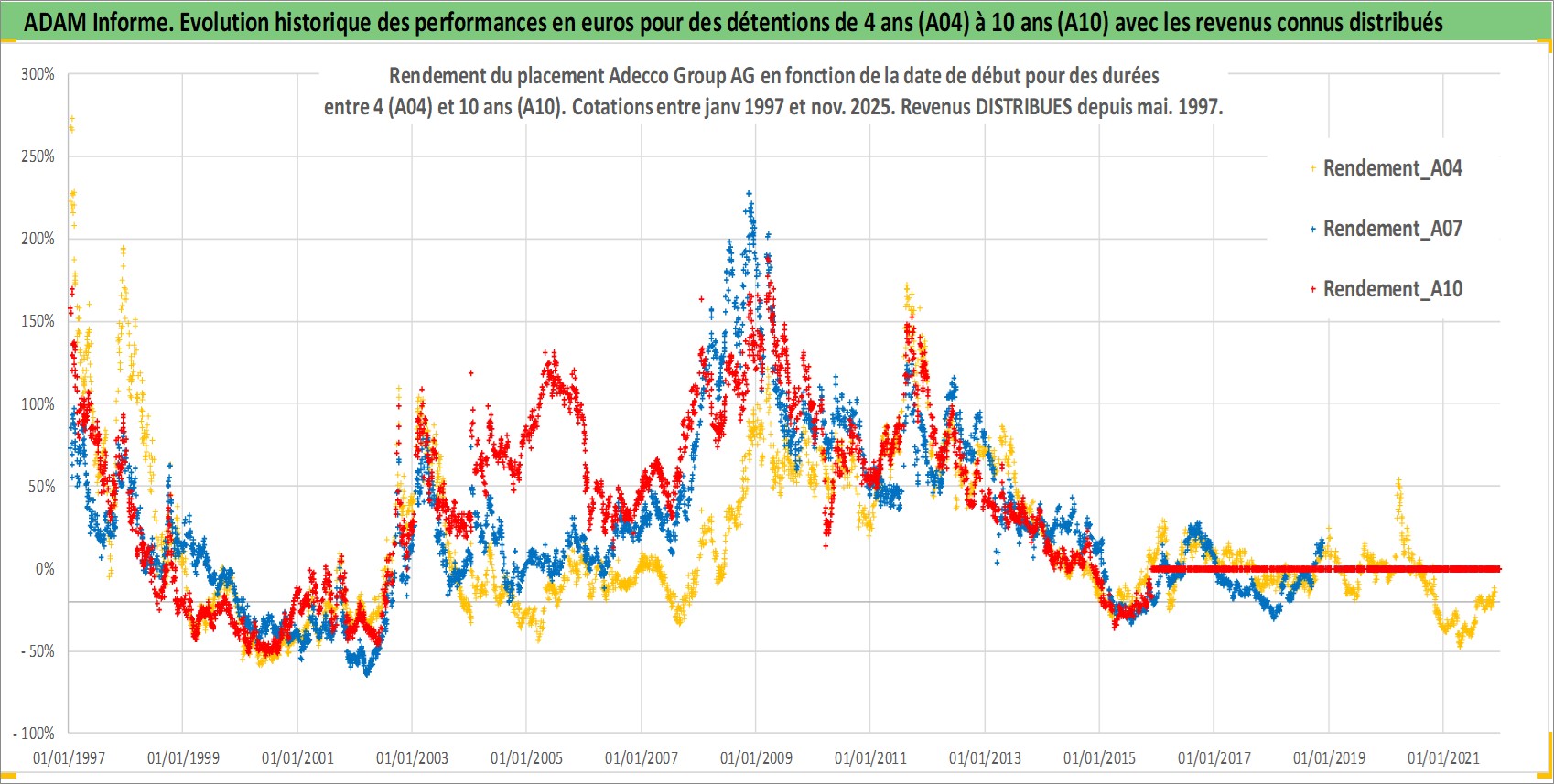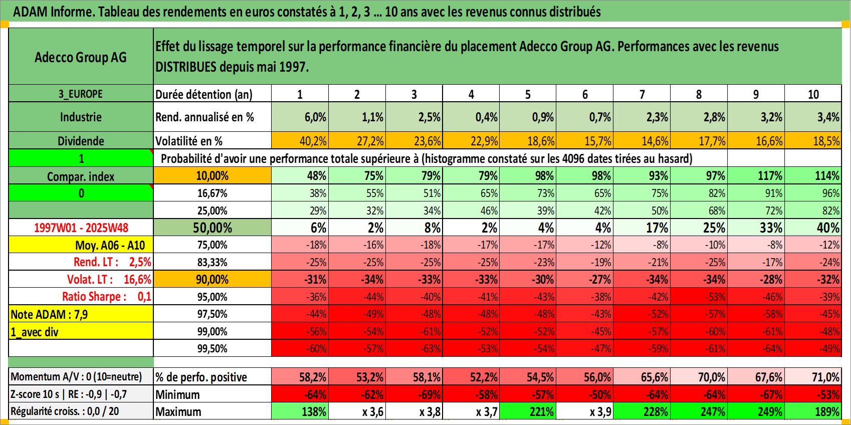 Site dédié aux investisseursPage dédiée sur site financeAnalyse des valorisations hebdomadaires de l'action Adecco Group AG. Cet actif est cote en CHF. Les valorisations sont en contrevaleur EURO et couvrent les semaines 1997W01 a 2025W48. Les revenus de cet actif financier sont pris en compte depuis la semaine 1997W22. La note globale ESG de cet actif est estimee a 17.0 (apres rebasage entre 0 et 20).