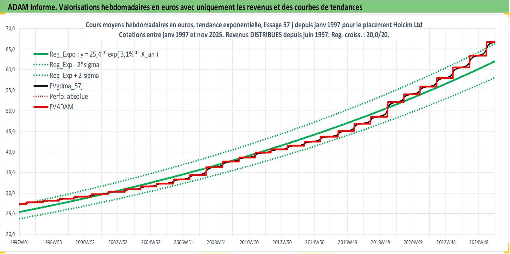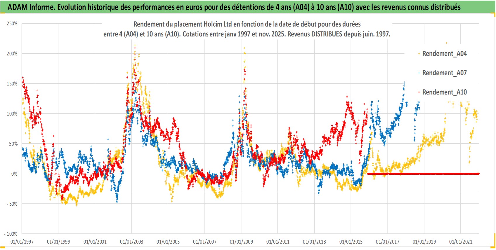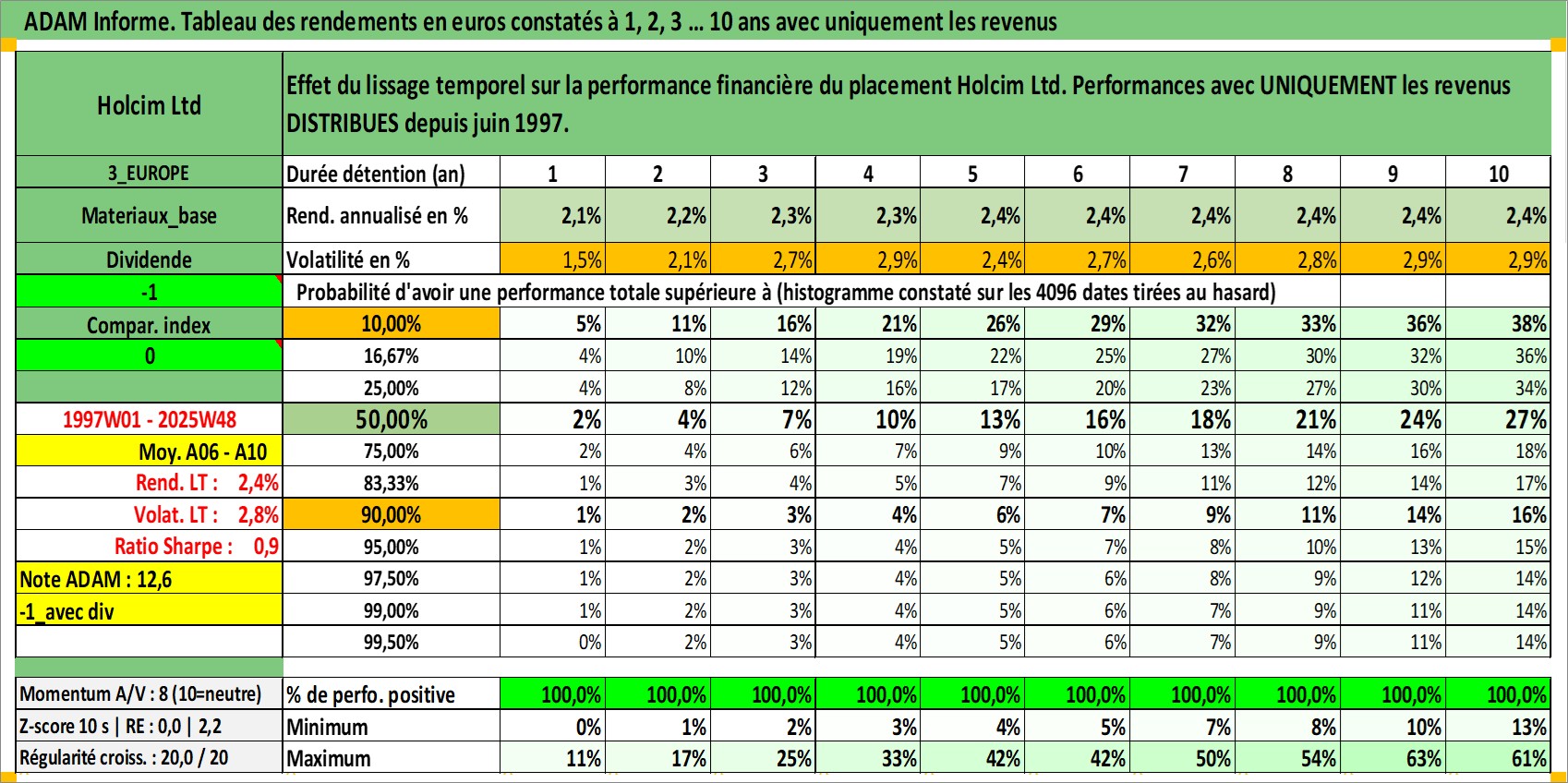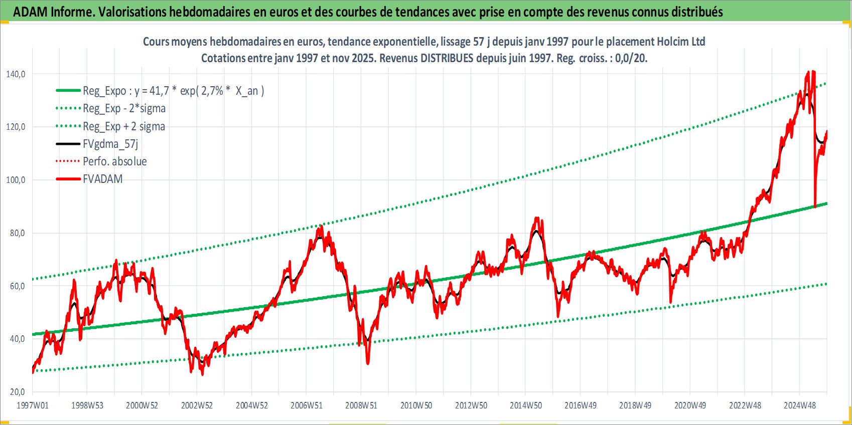Site dédié aux investisseursPage dédiée sur site financeAnalyse des valorisations hebdomadaires de l'action Holcim Ltd. Cet actif est cote en CHF. Les valorisations sont en contrevaleur EURO et couvrent les semaines 1997W01 a 2025W48. Les revenus de cet actif financier sont pris en compte depuis la semaine 1997W24. La note globale ESG de cet actif est estimee a 10.0 (apres rebasage entre 0 et 20).