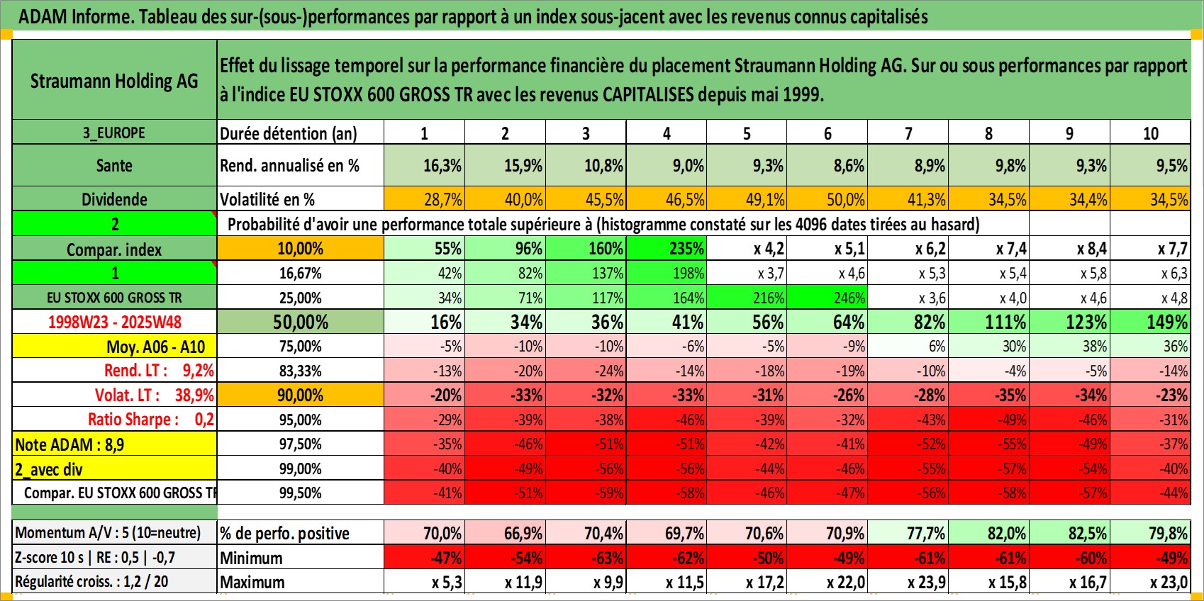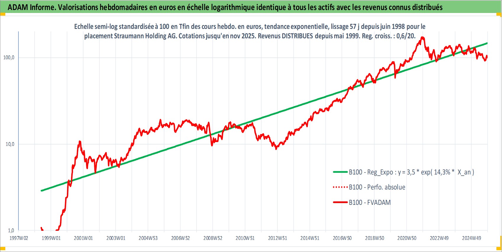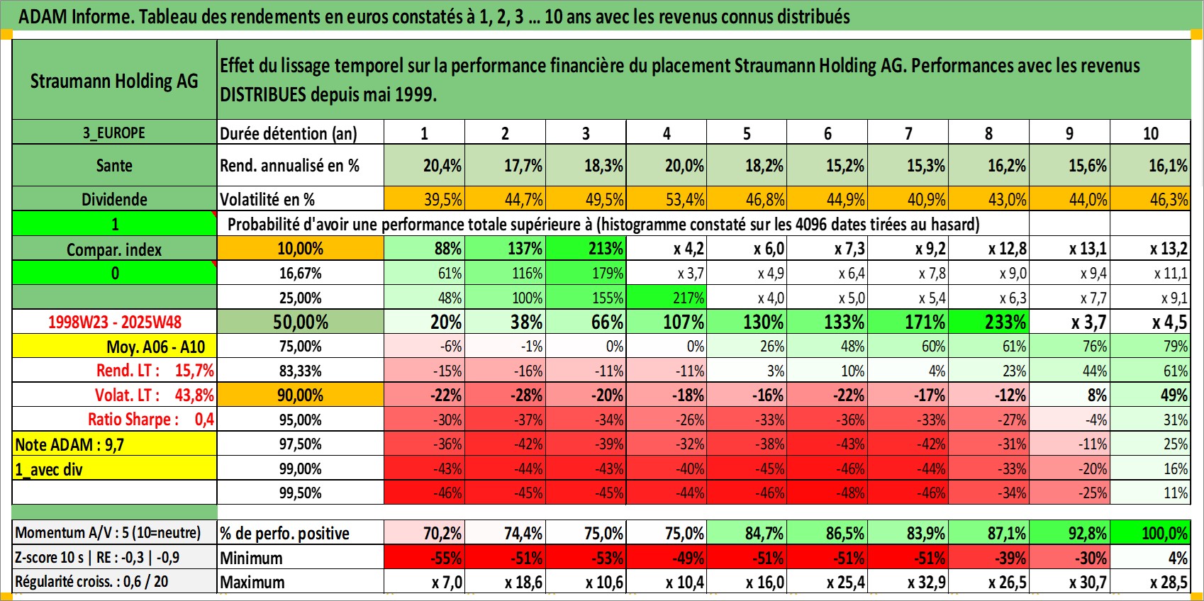 Site dédié aux investisseursPage dédiée sur site financeAnalyse des valorisations hebdomadaires de l'action Straumann Holding AG. Cet actif est cote en CHF. Les valorisations sont en contrevaleur EURO et couvrent les semaines 1998W23 a 2025W48. Les revenus de cet actif financier sont pris en compte depuis la semaine 1999W21. La note globale ESG de cet actif est estimee a 9.0 (apres rebasage entre 0 et 20).