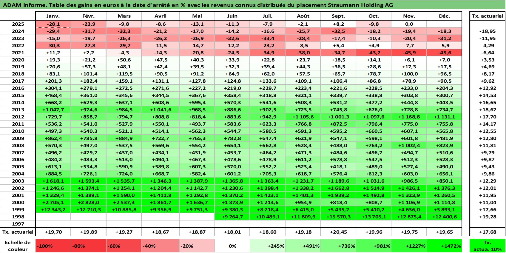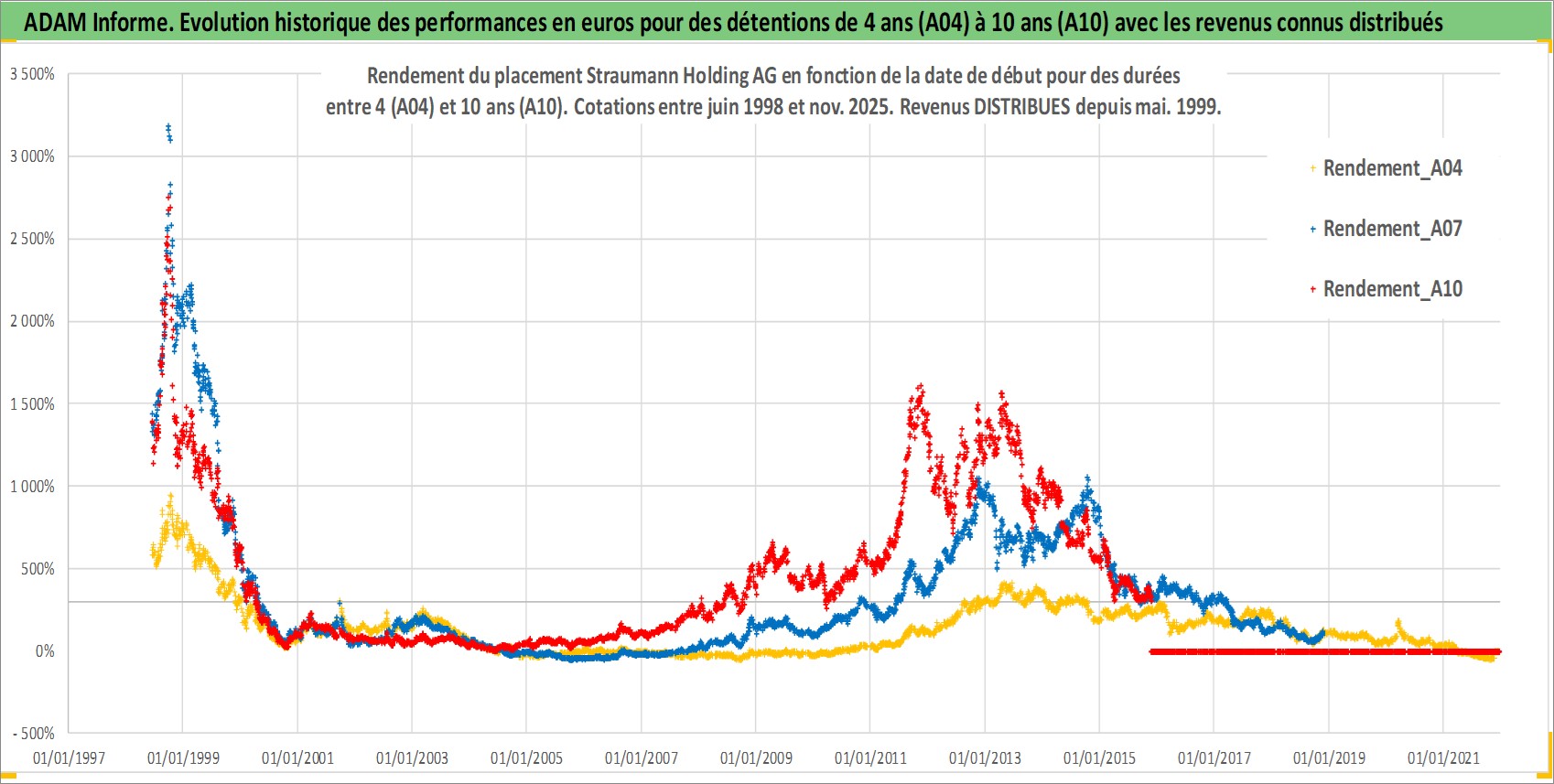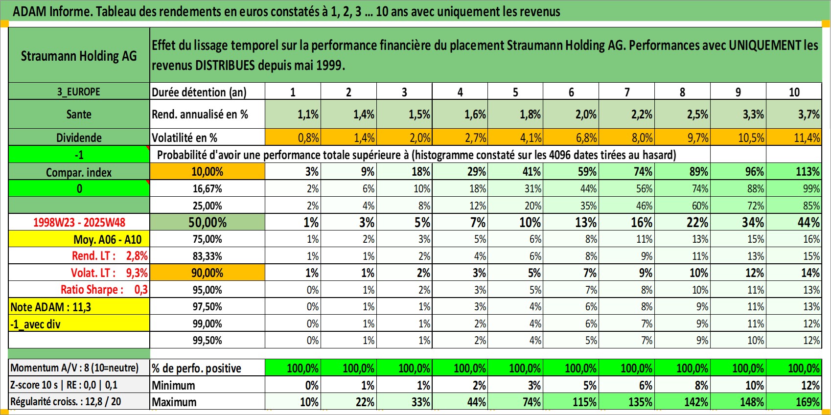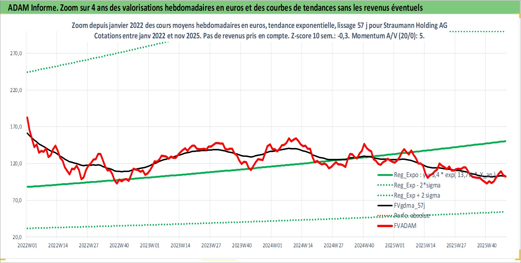 Site dédié aux investisseursPage dédiée sur site financeAnalyse des valorisations hebdomadaires de l'action Straumann Holding AG. Cet actif est cote en CHF. Les valorisations sont en contrevaleur EURO et couvrent les semaines 1998W23 a 2025W48. Les revenus de cet actif financier sont pris en compte depuis la semaine 1999W21. La note globale ESG de cet actif est estimee a 9.0 (apres rebasage entre 0 et 20).