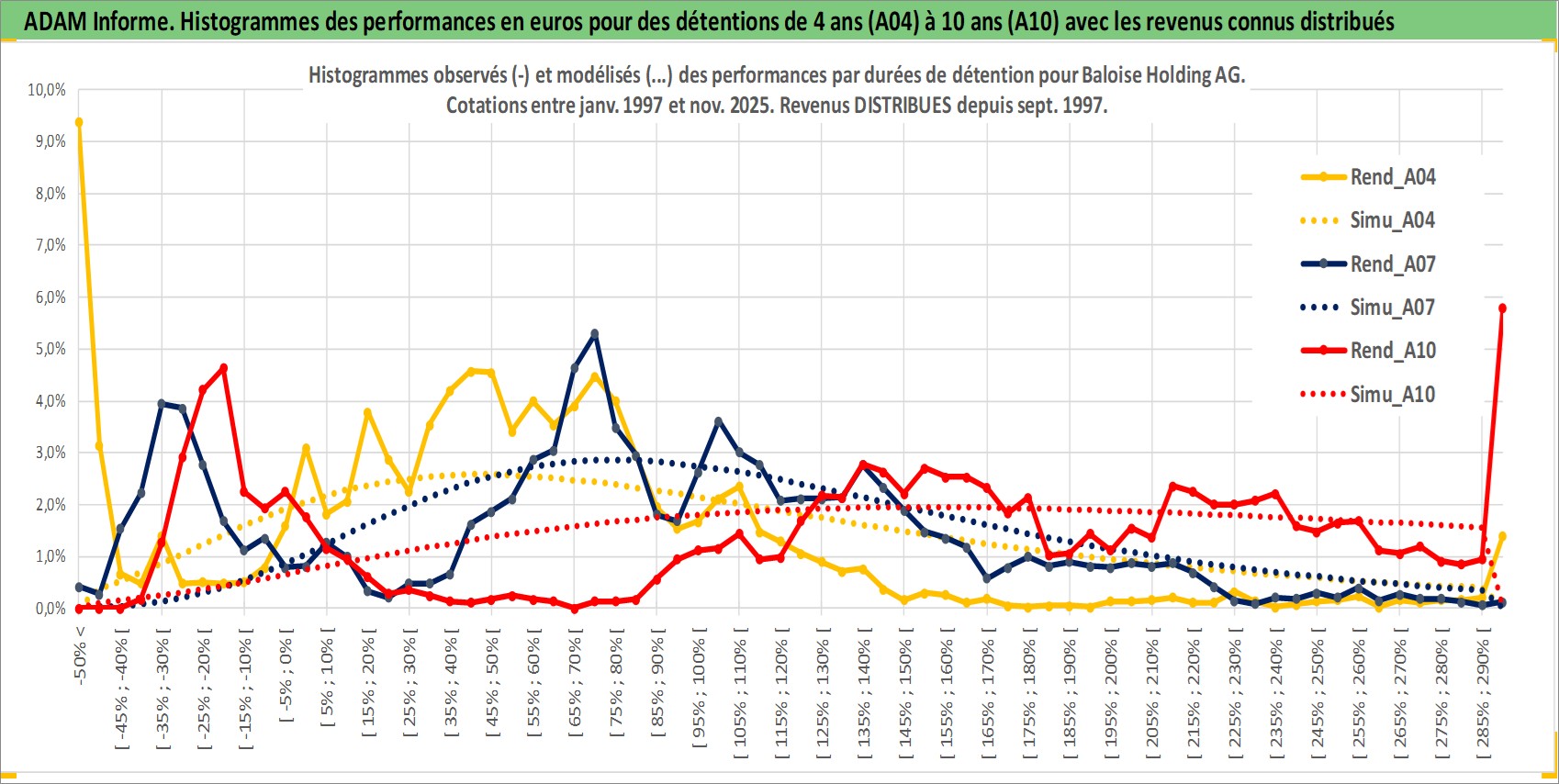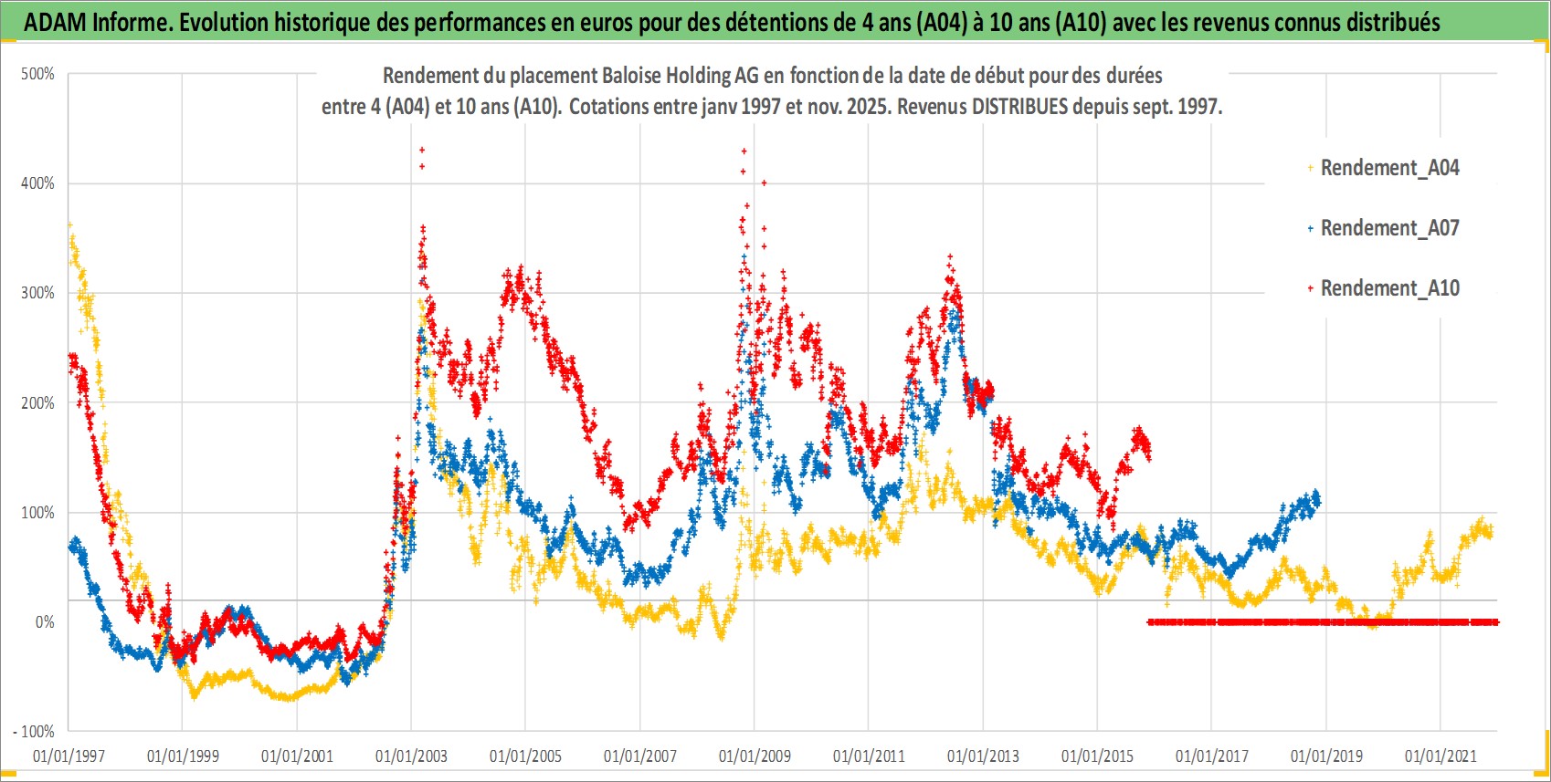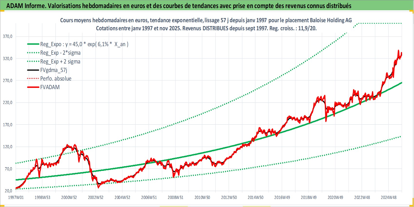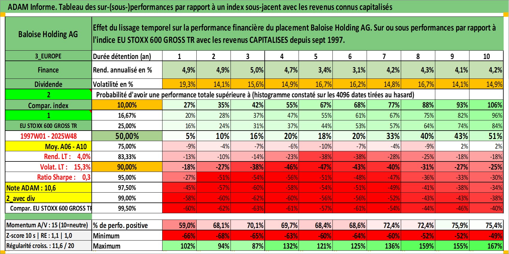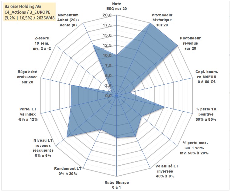 Site dédié aux investisseursPage dédiée sur site financeAnalyse des valorisations hebdomadaires de l'action Baloise Holding AG. Cet actif est cote en CHF. Les valorisations sont en contrevaleur EURO et couvrent les semaines 1997W01 a 2025W48. Les revenus de cet actif financier sont pris en compte depuis la semaine 1997W37. La note globale ESG de cet actif est estimee a 10.0 (apres rebasage entre 0 et 20).