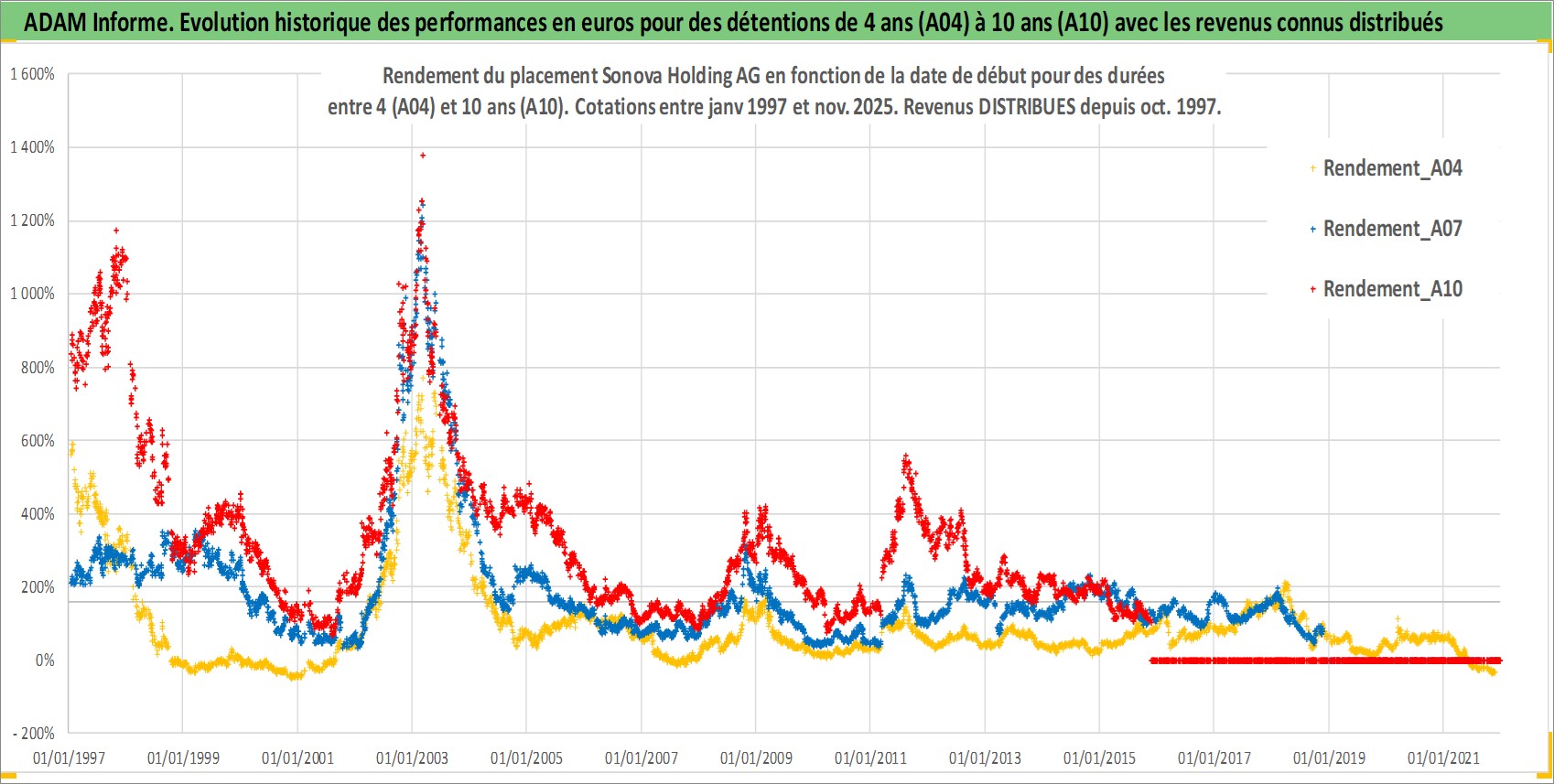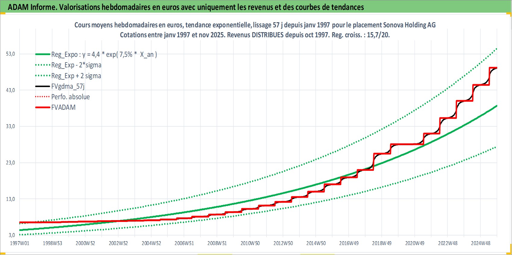 Site dédié aux investisseursPage dédiée sur site financeAnalyse des valorisations hebdomadaires de l'action Sonova Holding AG. Cet actif est cote en CHF. Les valorisations sont en contrevaleur EURO et couvrent les semaines 1997W01 a 2025W48. Les revenus de cet actif financier sont pris en compte depuis la semaine 1997W40. La note globale ESG de cet actif est estimee a 11.0 (apres rebasage entre 0 et 20).