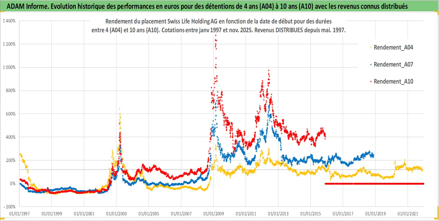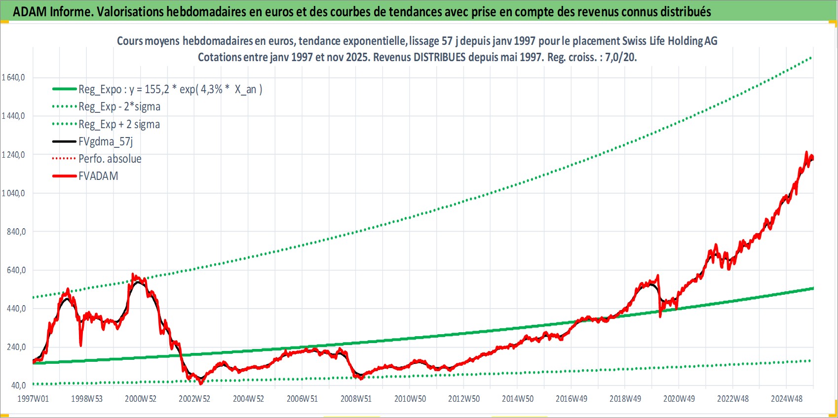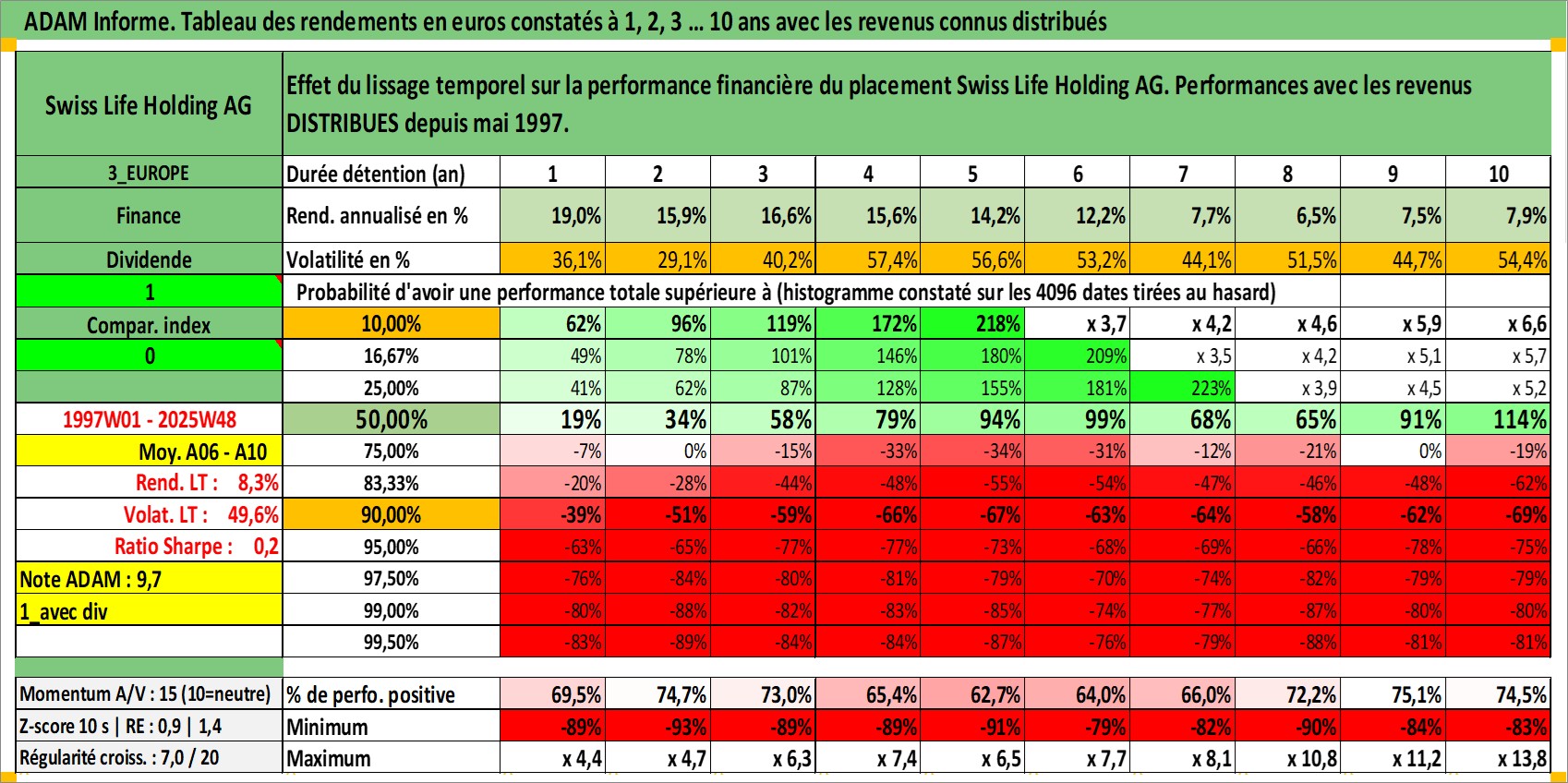 Site dédié aux investisseursPage dédiée sur site financeAnalyse des valorisations hebdomadaires de l'action Swiss Life Holding AG. Cet actif est cote en CHF. Les valorisations sont en contrevaleur EURO et couvrent les semaines 1997W01 a 2025W48. Les revenus de cet actif financier sont pris en compte depuis la semaine 1997W22. La note globale ESG de cet actif est estimee a 13.0 (apres rebasage entre 0 et 20).