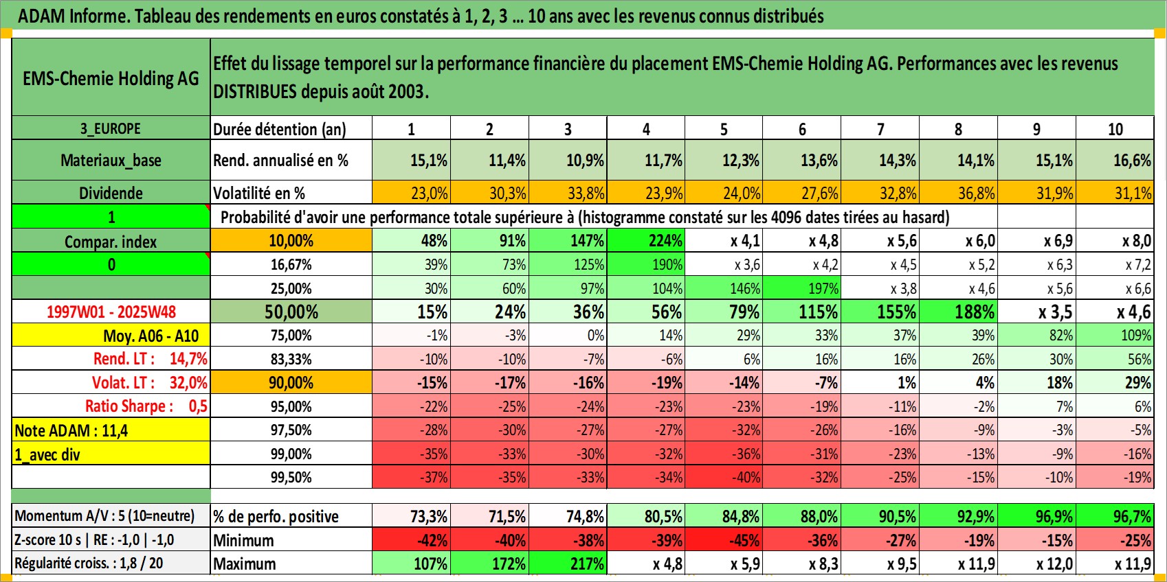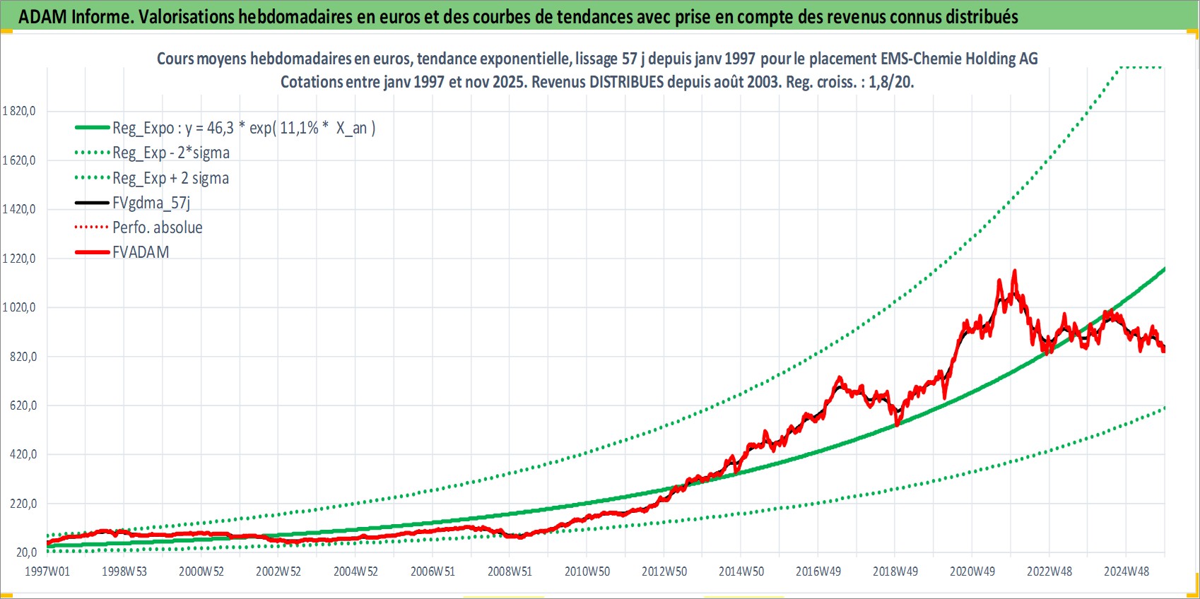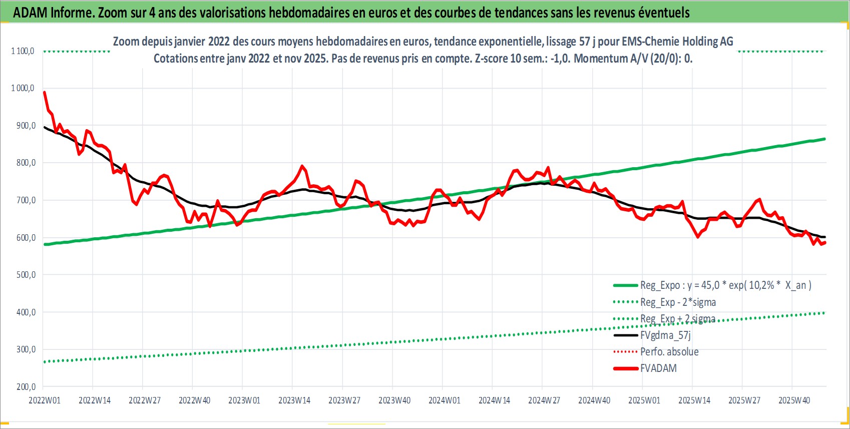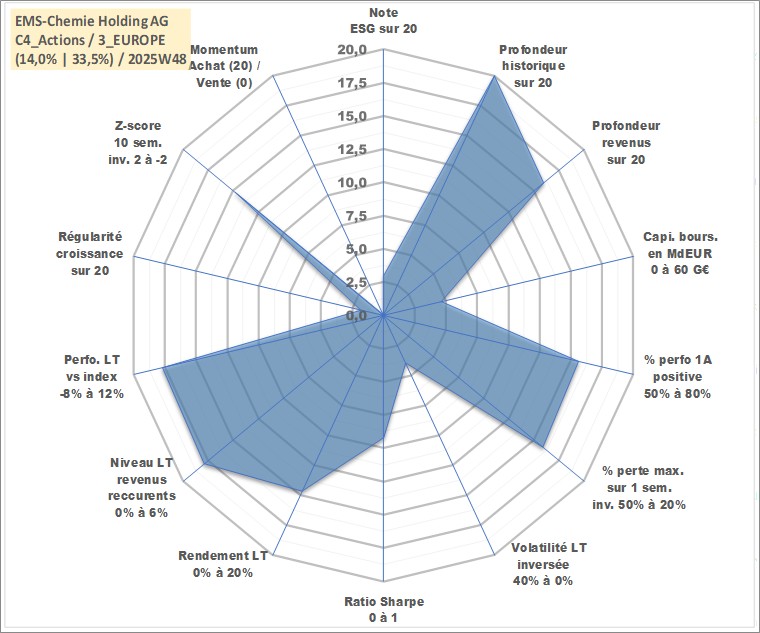 Site dédié aux investisseursPage dédiée sur site financeAnalyse des valorisations hebdomadaires de l'action EMS-Chemie Holding AG. Cet actif est cote en CHF. Les valorisations sont en contrevaleur EURO et couvrent les semaines 1997W01 a 2025W48. Les revenus de cet actif financier sont pris en compte depuis la semaine 2003W34. La note globale ESG de cet actif est estimee a 3.0 (apres rebasage entre 0 et 20).