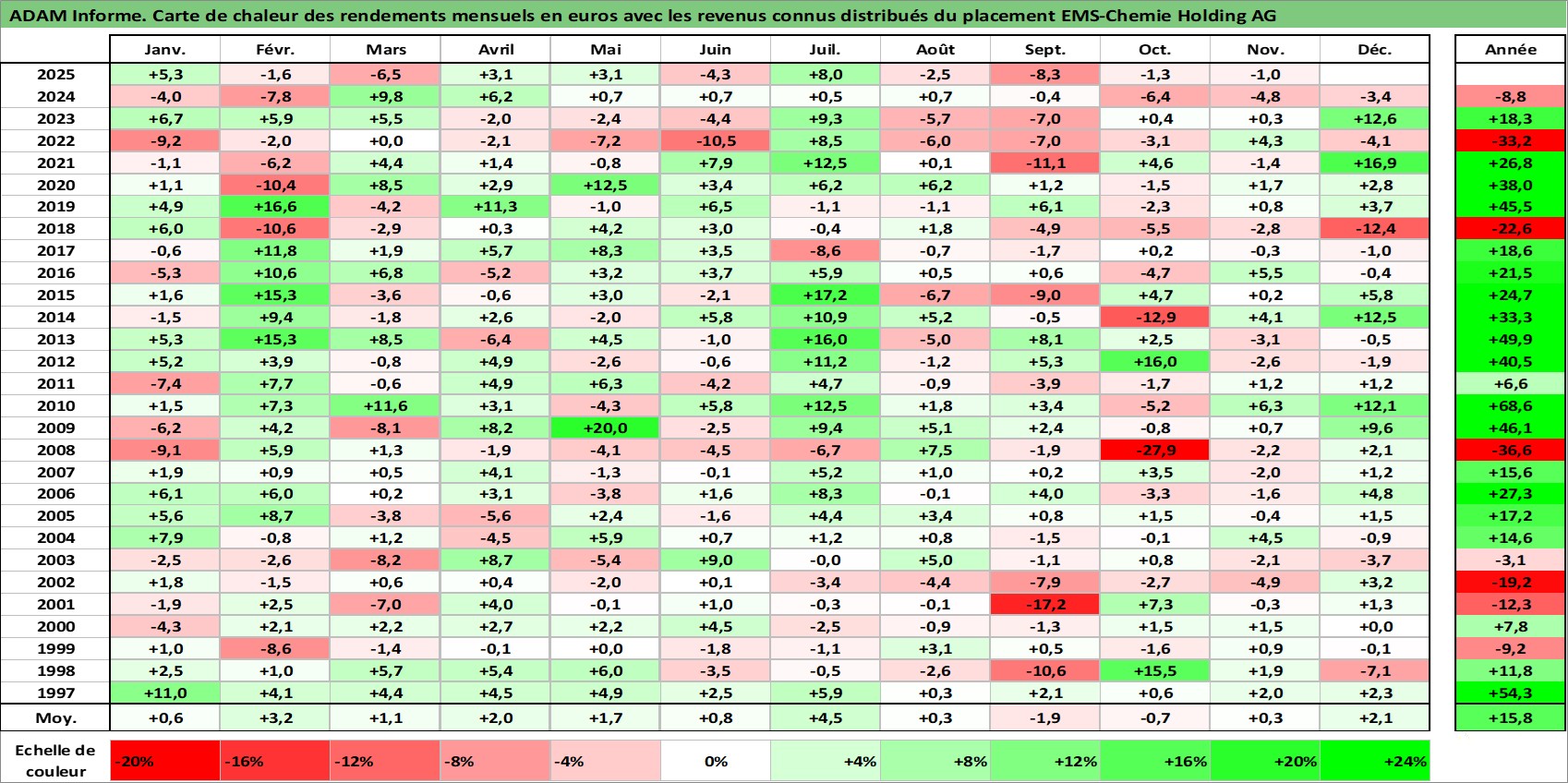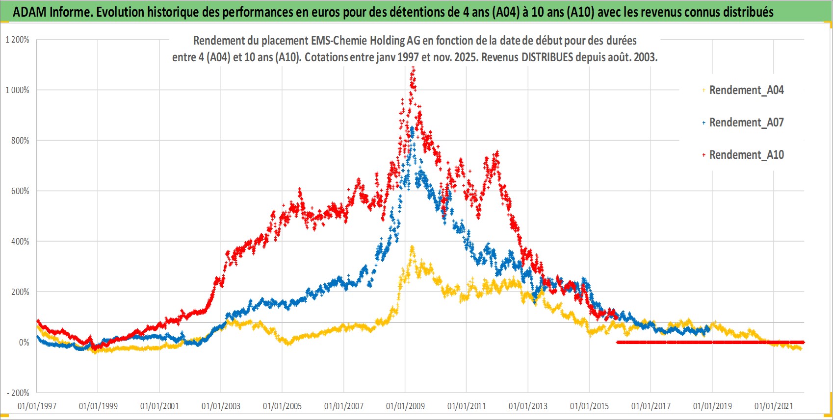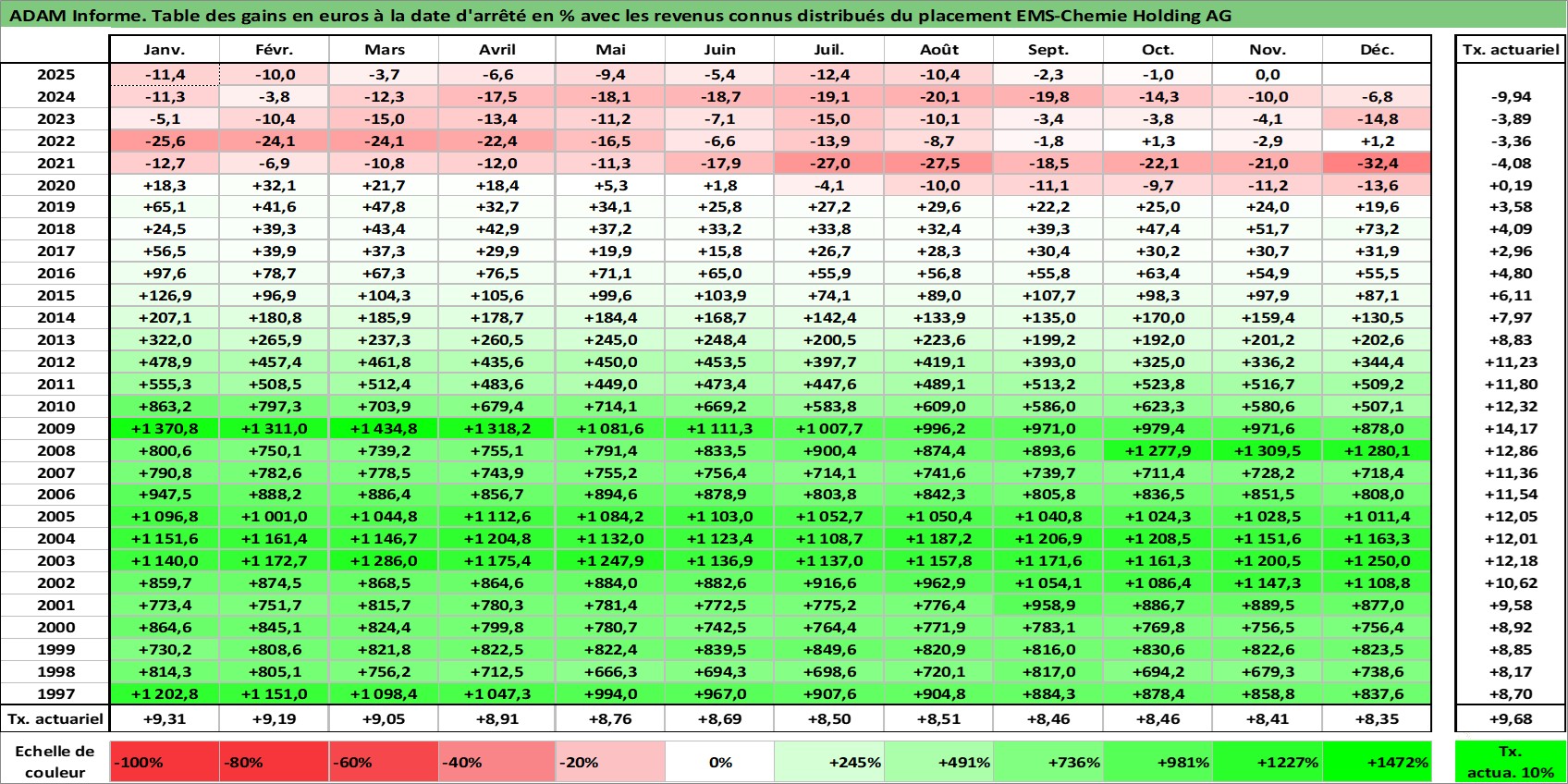 Site dédié aux investisseursPage dédiée sur site financeAnalyse des valorisations hebdomadaires de l'action EMS-Chemie Holding AG. Cet actif est cote en CHF. Les valorisations sont en contrevaleur EURO et couvrent les semaines 1997W01 a 2025W48. Les revenus de cet actif financier sont pris en compte depuis la semaine 2003W34. La note globale ESG de cet actif est estimee a 3.0 (apres rebasage entre 0 et 20).