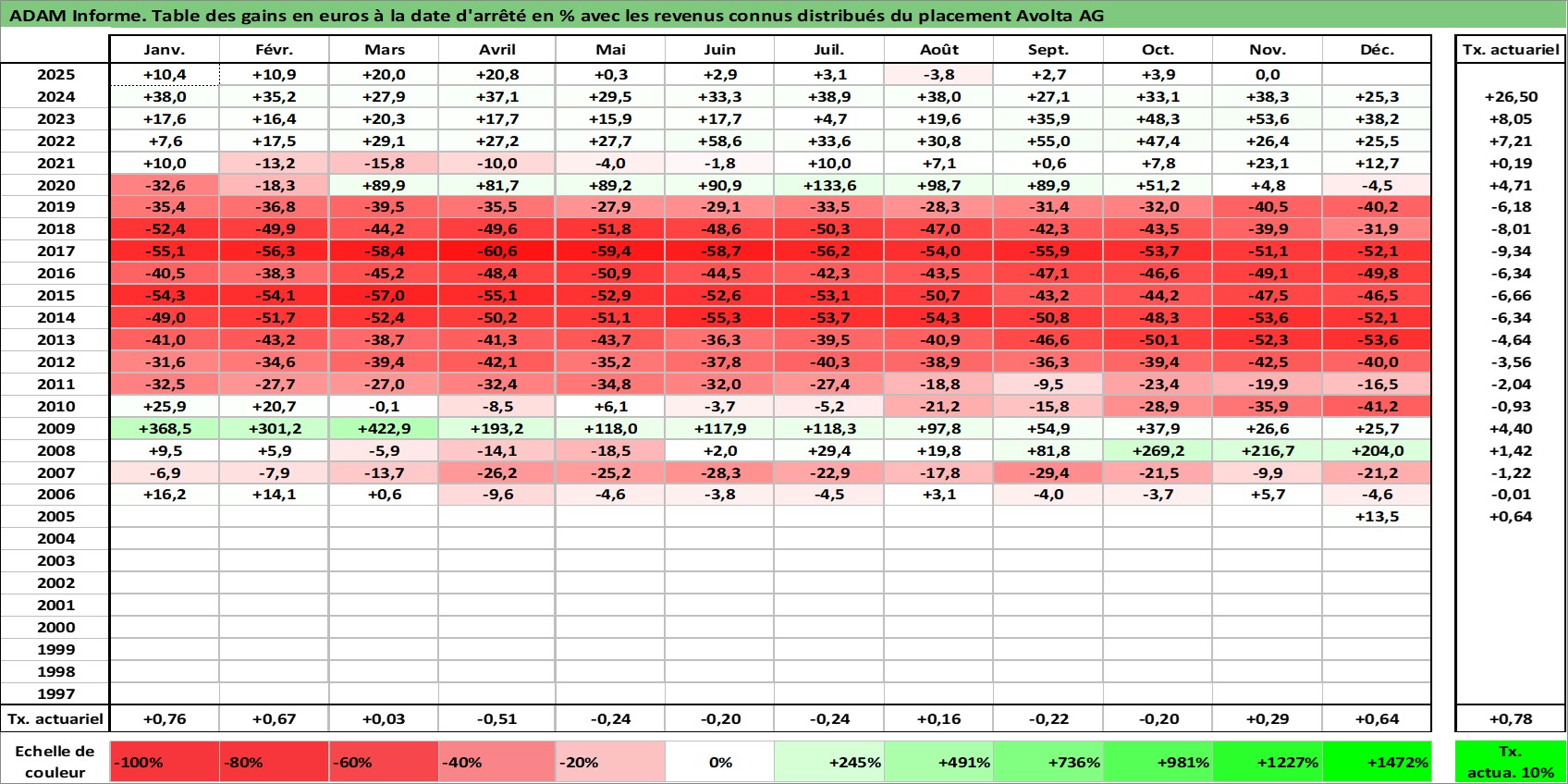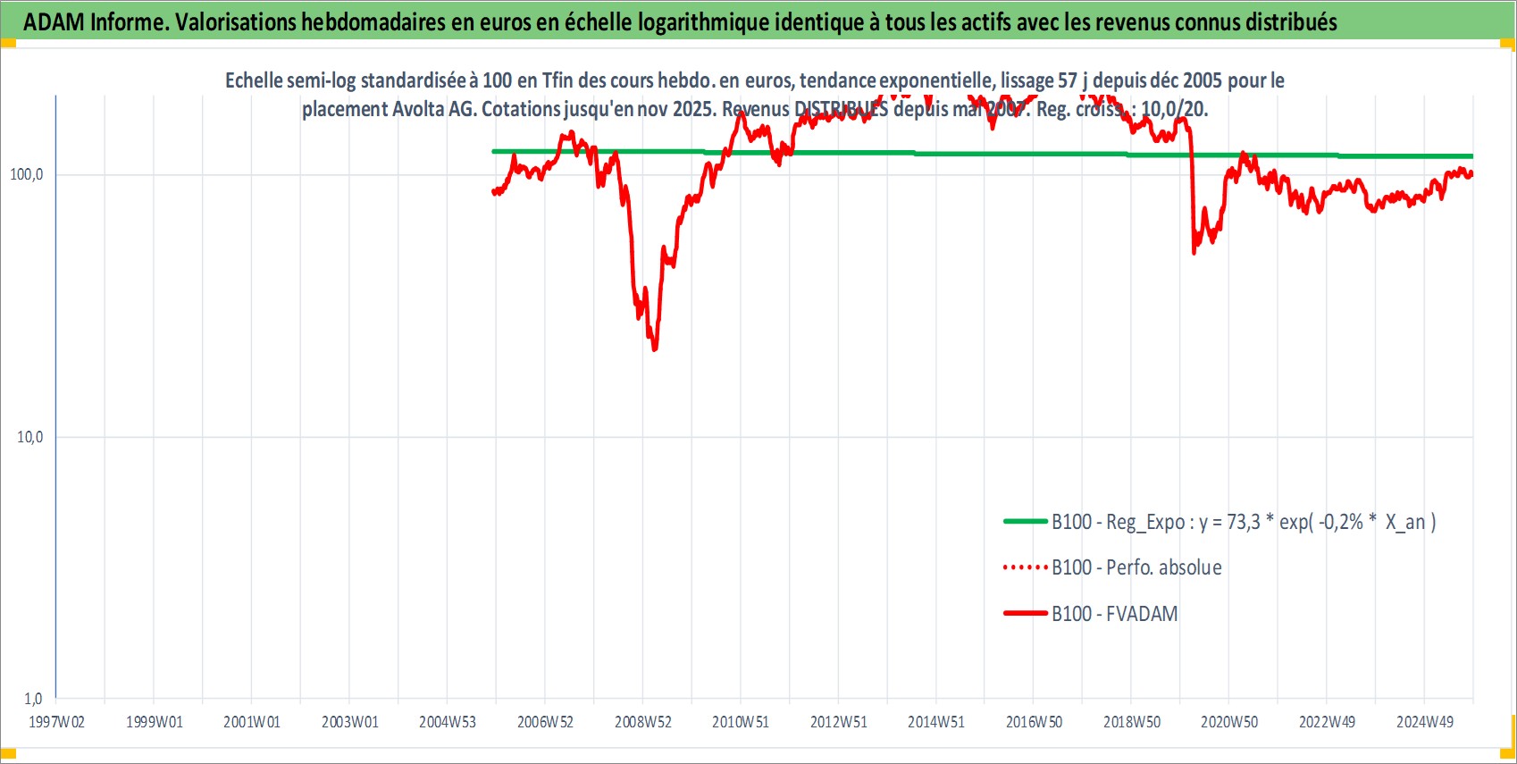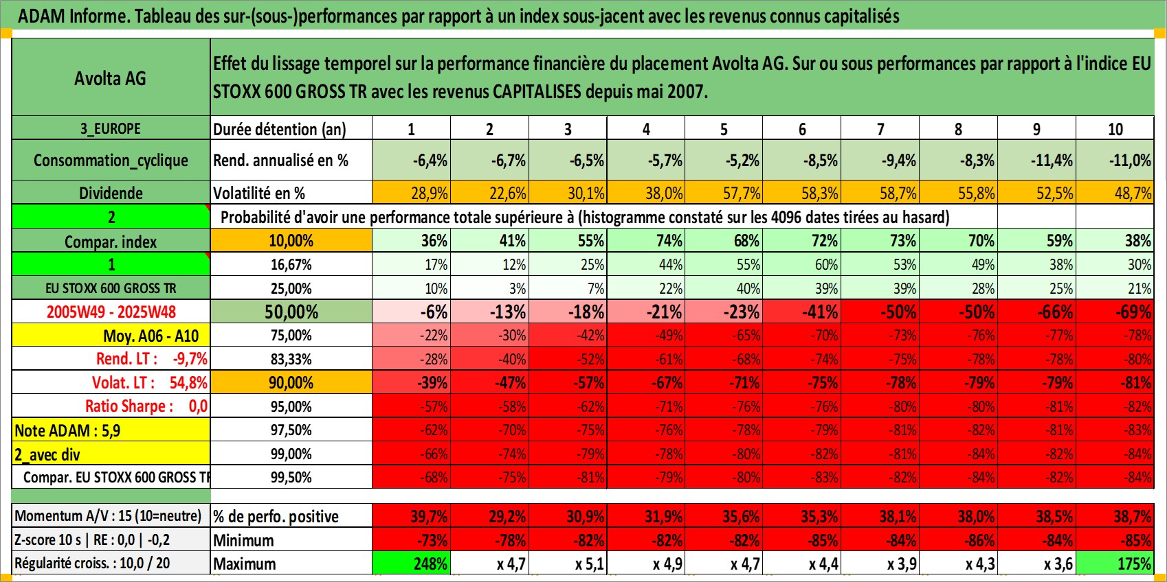 Site dédié aux investisseursPage dédiée sur site financeAnalyse des valorisations hebdomadaires de l'action Avolta AG. Cet actif est cote en CHF. Les valorisations sont en contrevaleur EURO et couvrent les semaines 2005W49 a 2025W48. Les revenus de cet actif financier sont pris en compte depuis la semaine 2007W21. La note globale ESG de cet actif est estimee a 15.0 (apres rebasage entre 0 et 20).