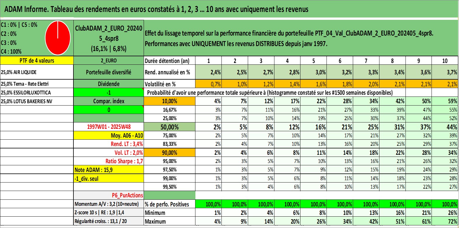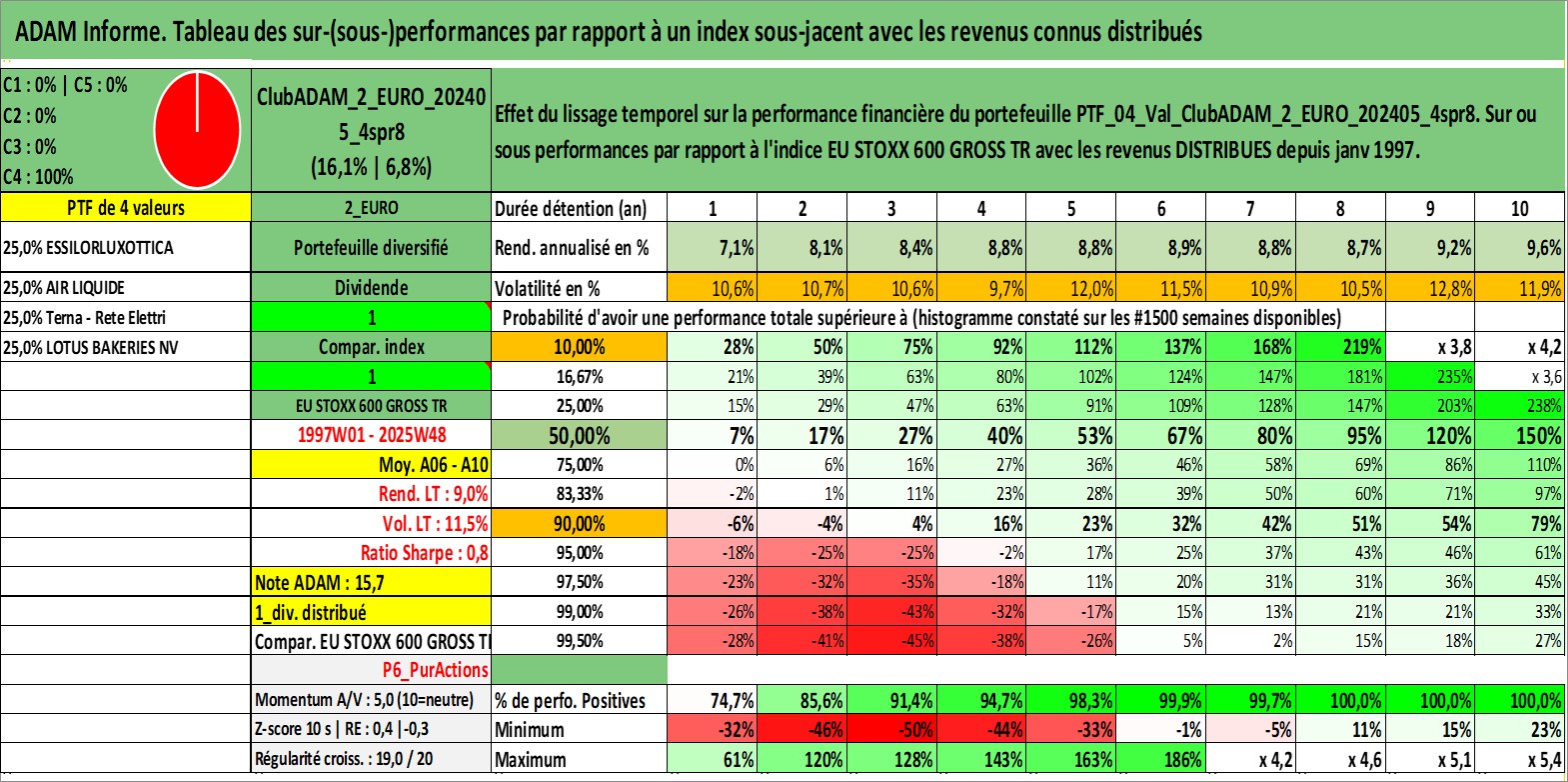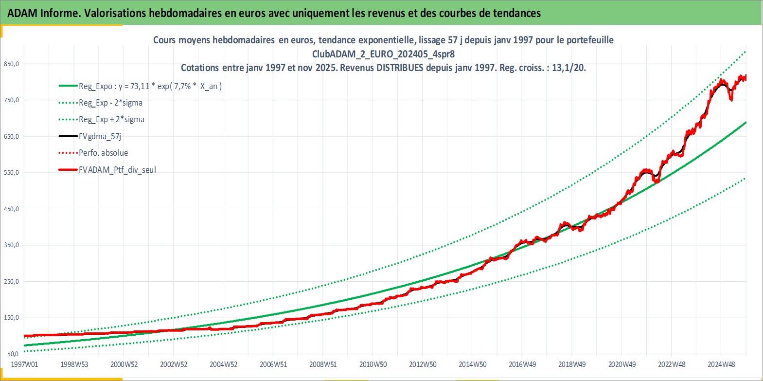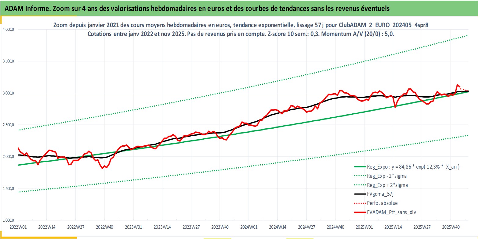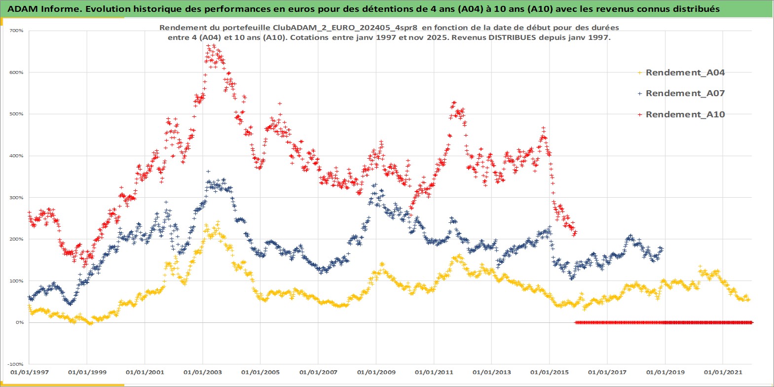 Site dédié aux investisseursPage dédiée sur site financeAnalyse des valorisations hebdomadaires du portefeuille ClubADAM_2_EURO_202405_4spr8_4actifs avec un profil P6_PurActions. Ce portefeuille est cote en EUR. Les valorisations couvrent les semaines 1997W01 a 2025W48. Les revenus de cet actif financier sont pris en compte depuis la semaine 1997W01. La note globale ESG de cet actif est estimee a 14.0 (apres rebasage entre 0 et 20).