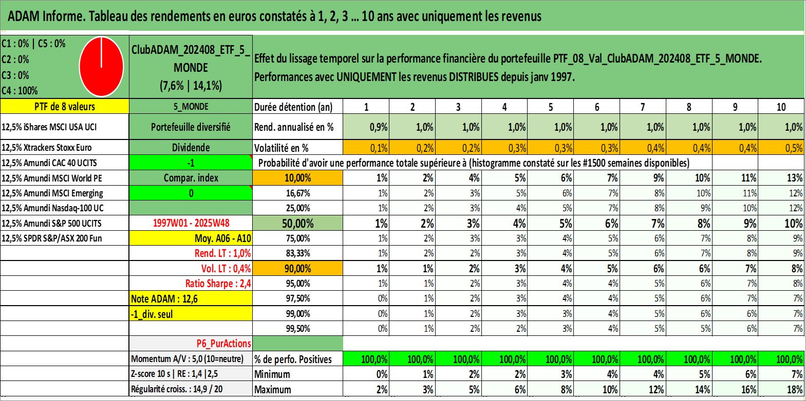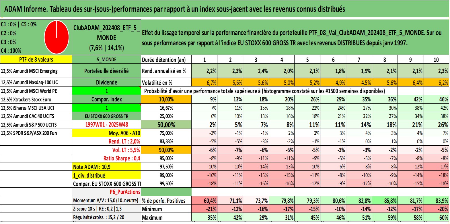 Site dédié aux investisseursPage dédiée sur site financeAnalyse des valorisations hebdomadaires du portefeuille ClubADAM_202408_ETF_5_MONDE_8actifs avec un profil P6_PurActions. Ce portefeuille est cote en EUR. Les valorisations couvrent les semaines 1997W01 a 2025W48. Les revenus de cet actif financier sont pris en compte depuis la semaine 1997W01. La note ESG de cet actif n'est pas connue.