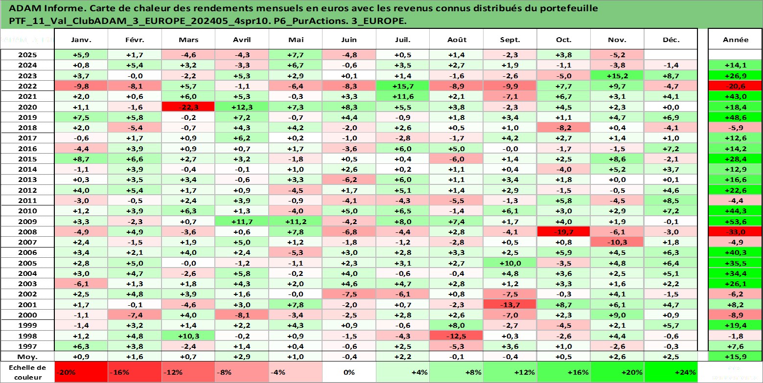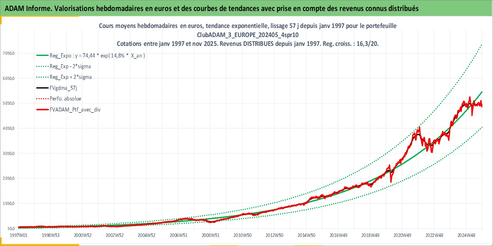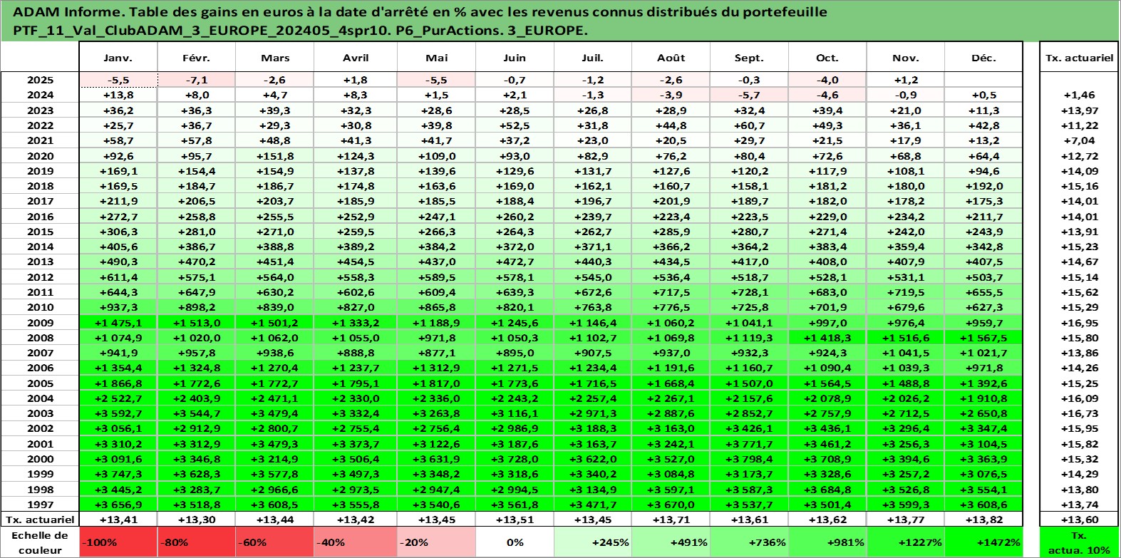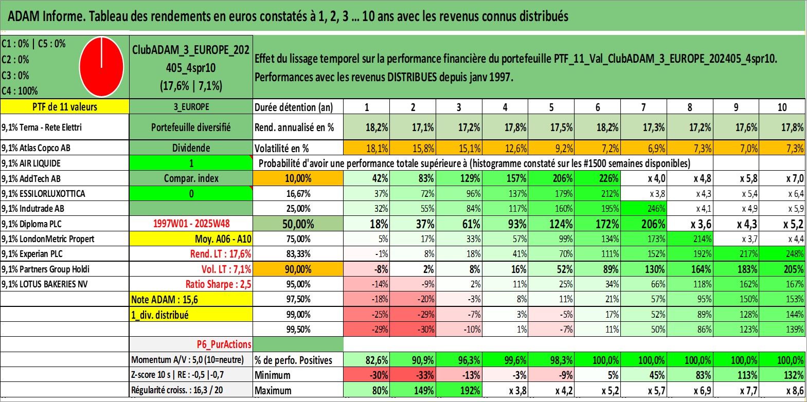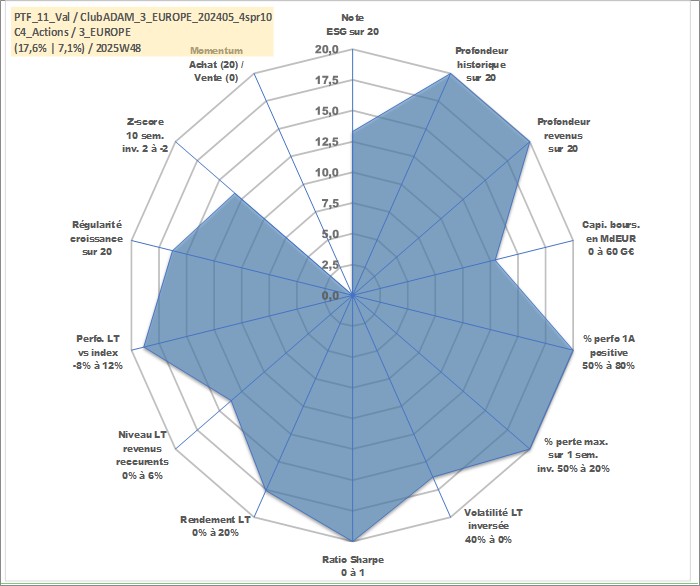 Site dédié aux investisseursPage dédiée sur site financeAnalyse des valorisations hebdomadaires du portefeuille ClubADAM_3_EUROPE_202405_4spr10_11actifs avec un profil P6_PurActions. Ce portefeuille est cote en EUR. Les valorisations couvrent les semaines 1997W01 a 2025W48. Les revenus de cet actif financier sont pris en compte depuis la semaine 1997W01. La note globale ESG de cet actif est estimee a 13.3 (apres rebasage entre 0 et 20).