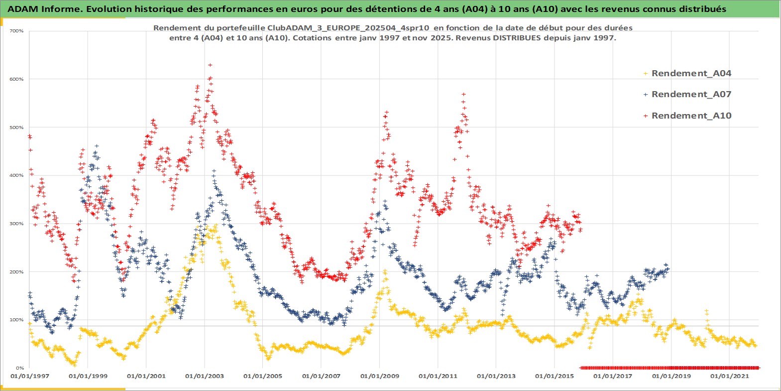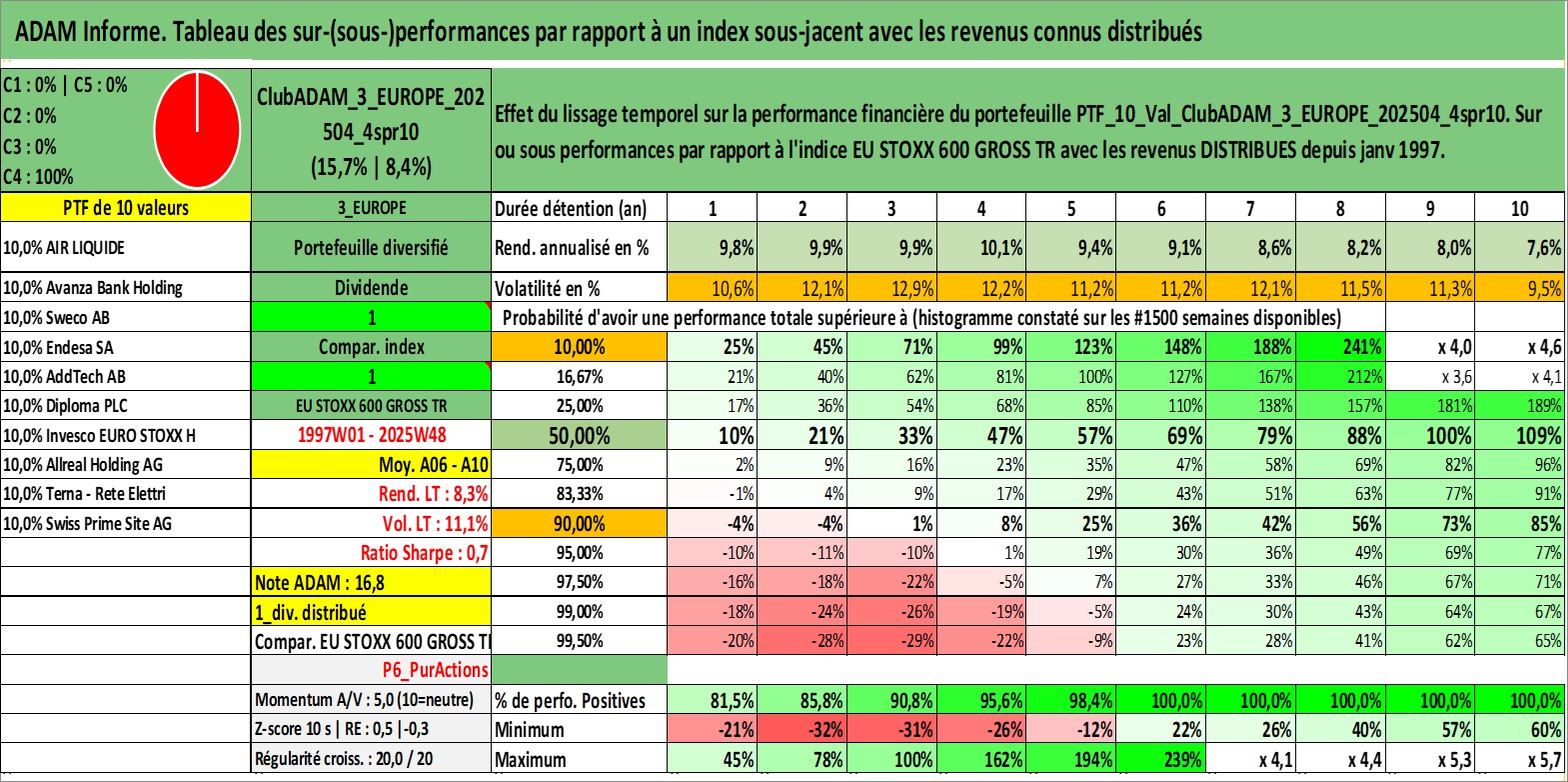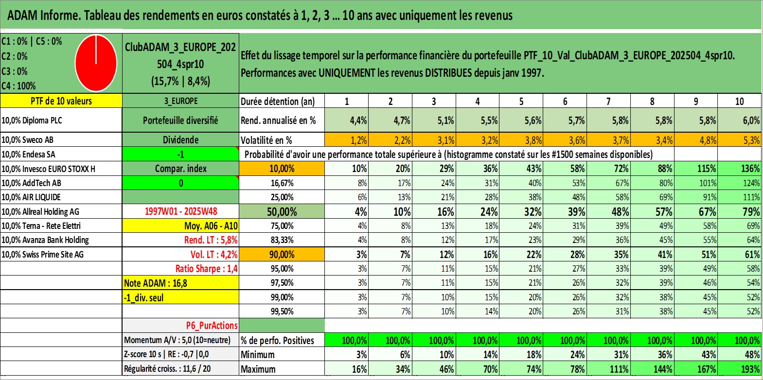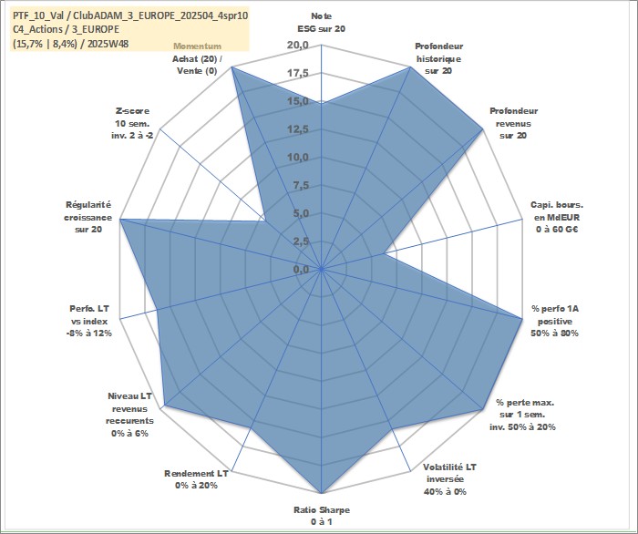 Site dédié aux investisseursPage dédiée sur site financeAnalyse des valorisations hebdomadaires du portefeuille ClubADAM_3_EUROPE_202504_4spr10_10actifs avec un profil P6_PurActions. Ce portefeuille est cote en EUR. Les valorisations couvrent les semaines 1997W01 a 2025W48. Les revenus de cet actif financier sont pris en compte depuis la semaine 1997W01. La note globale ESG de cet actif est estimee a 14.7 (apres rebasage entre 0 et 20).