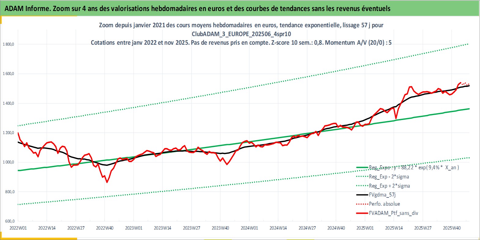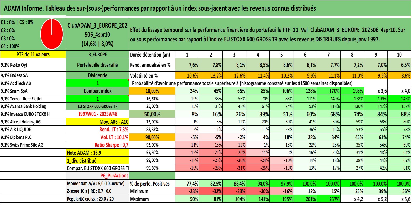 Site dédié aux investisseursPage dédiée sur site financeAnalyse des valorisations hebdomadaires du portefeuille ClubADAM_3_EUROPE_202506_4spr10_11actifs avec un profil P6_PurActions. Ce portefeuille est cote en EUR. Les valorisations couvrent les semaines 1997W01 a 2025W48. Les revenus de cet actif financier sont pris en compte depuis la semaine 1997W01. La note globale ESG de cet actif est estimee a 14.4 (apres rebasage entre 0 et 20).