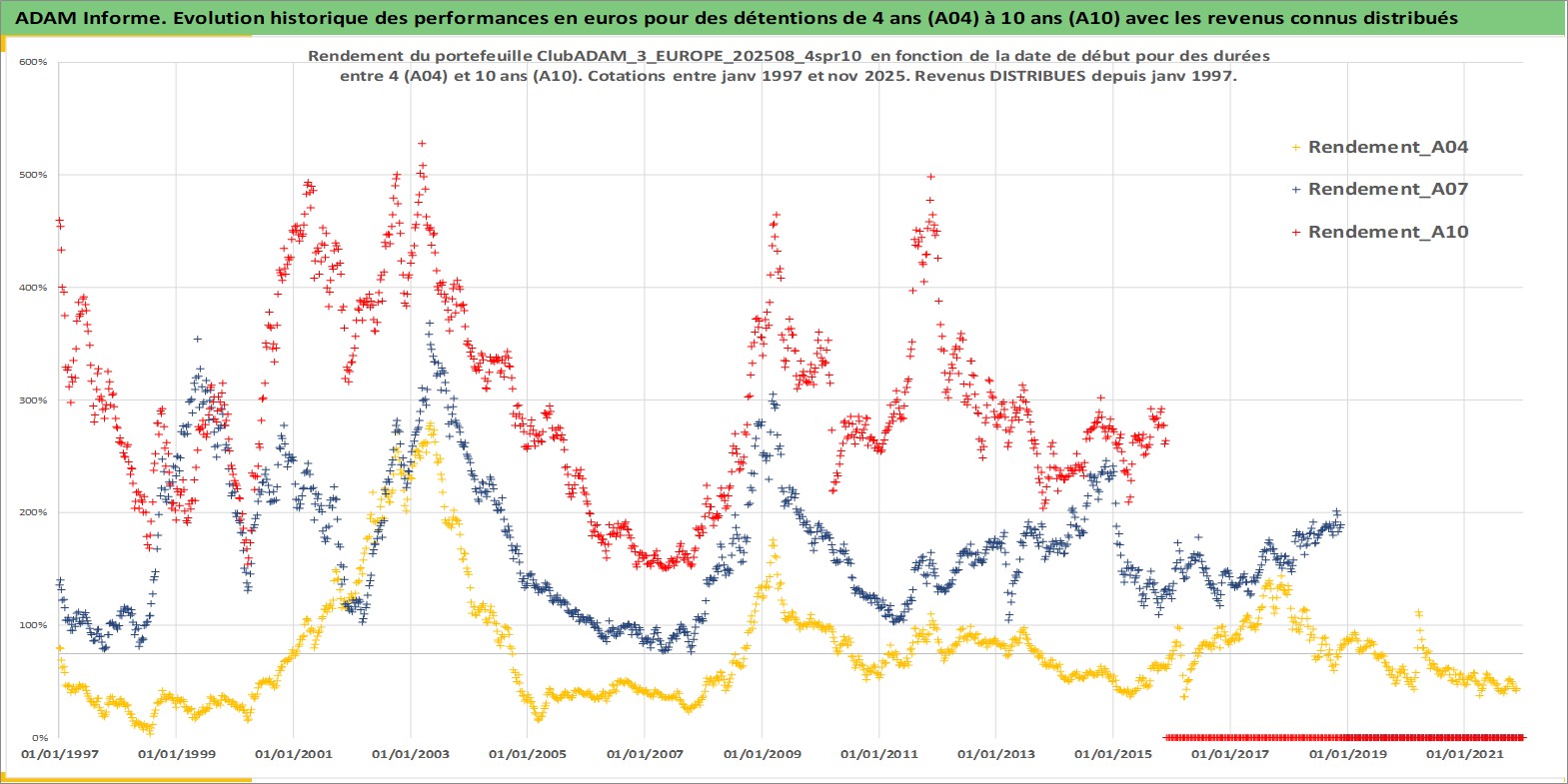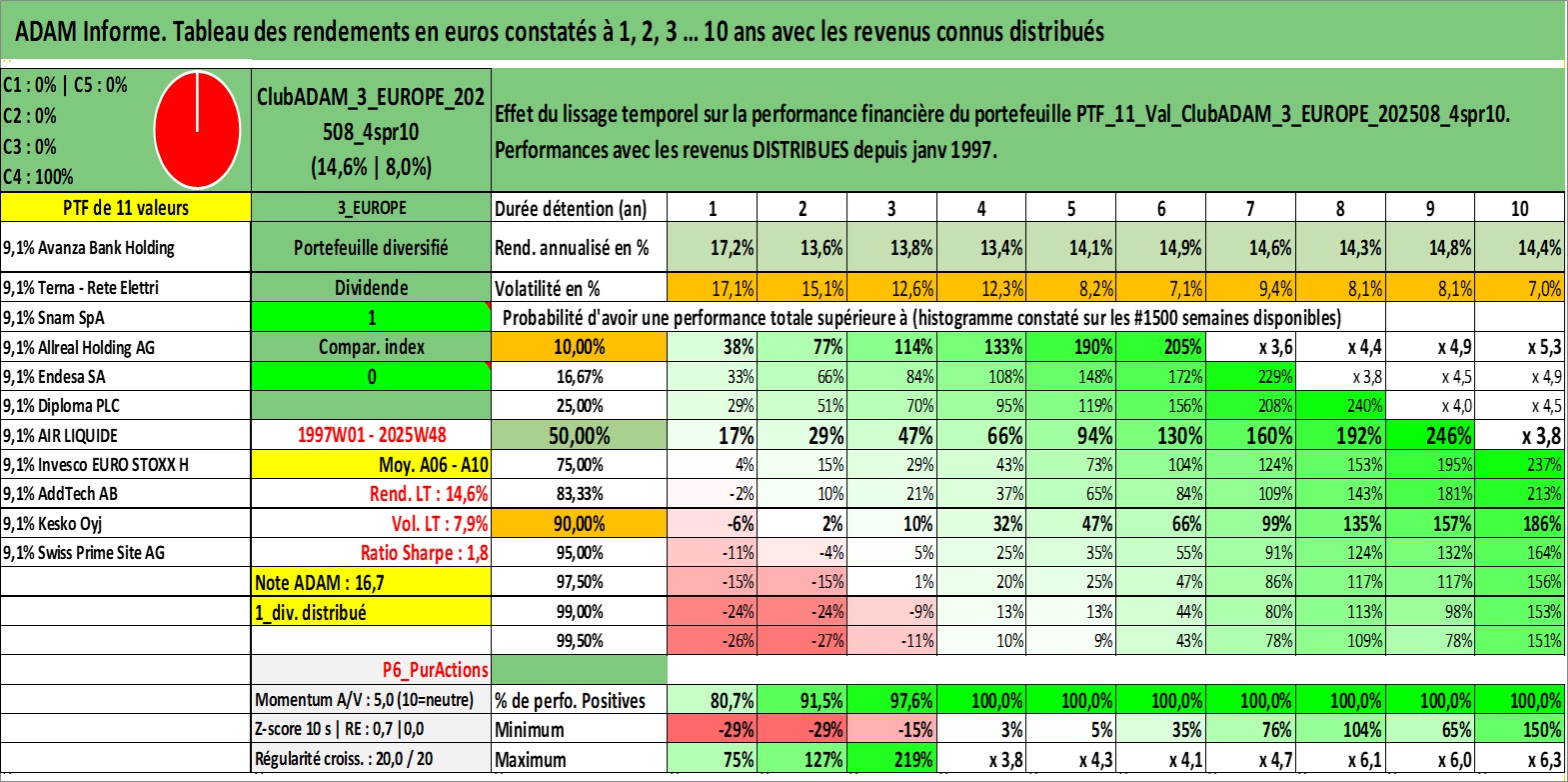 Site dédié aux investisseursPage dédiée sur site financeAnalyse des valorisations hebdomadaires du portefeuille ClubADAM_3_EUROPE_202508_4spr10_11actifs avec un profil P6_PurActions. Ce portefeuille est cote en EUR. Les valorisations couvrent les semaines 1997W01 a 2025W48. Les revenus de cet actif financier sont pris en compte depuis la semaine 1997W01. La note globale ESG de cet actif est estimee a 14.4 (apres rebasage entre 0 et 20).