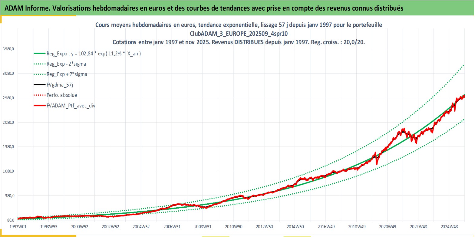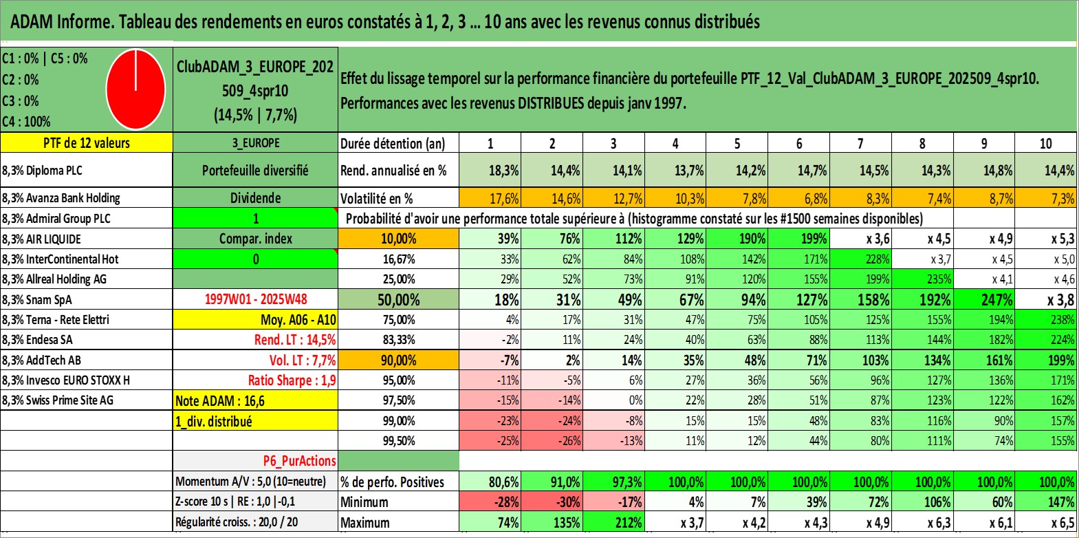 Site dédié aux investisseursPage dédiée sur site financeAnalyse des valorisations hebdomadaires du portefeuille ClubADAM_3_EUROPE_202509_4spr10_12actifs avec un profil P6_PurActions. Ce portefeuille est cote en EUR. Les valorisations couvrent les semaines 1997W01 a 2025W48. Les revenus de cet actif financier sont pris en compte depuis la semaine 1997W01. La note globale ESG de cet actif est estimee a 13.1 (apres rebasage entre 0 et 20).