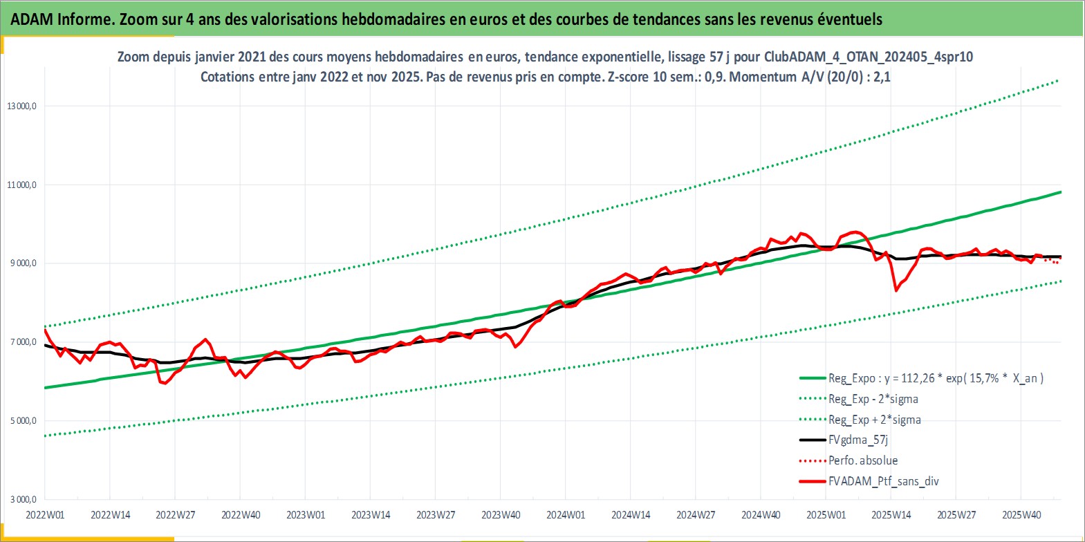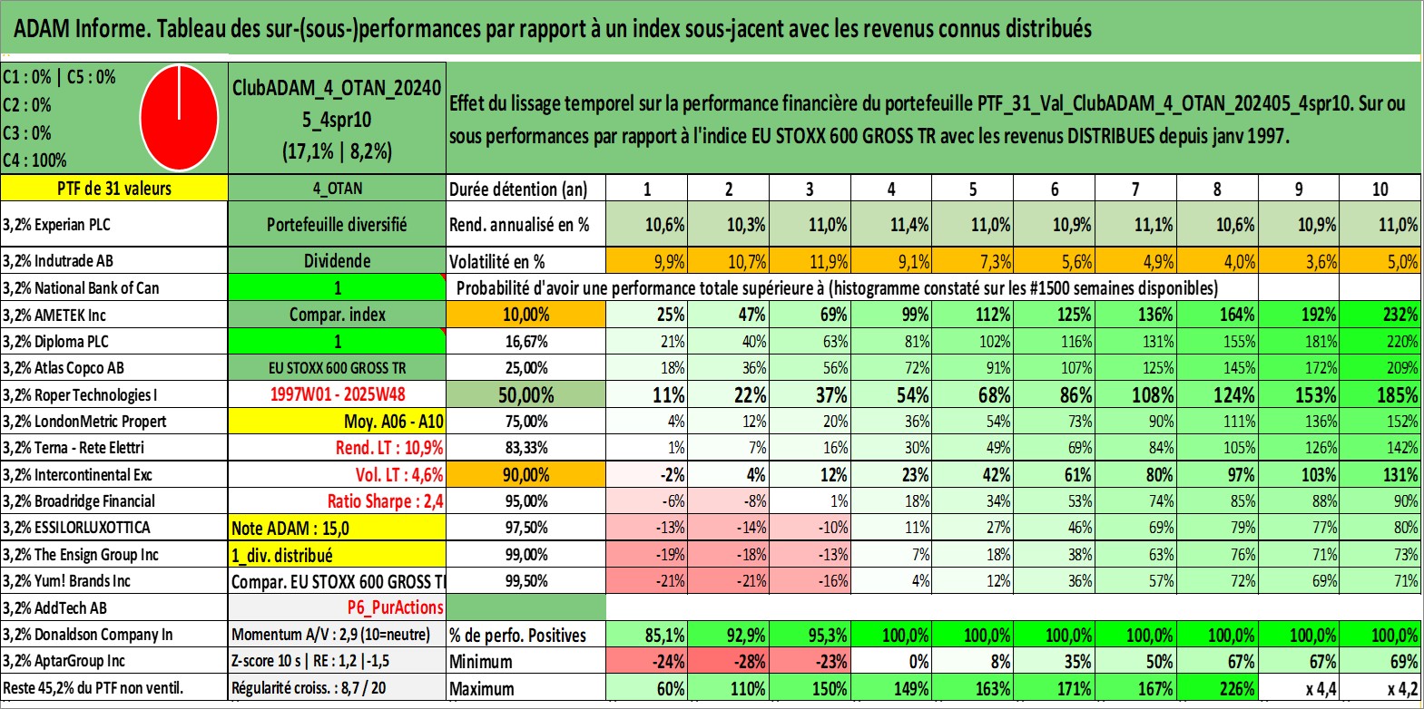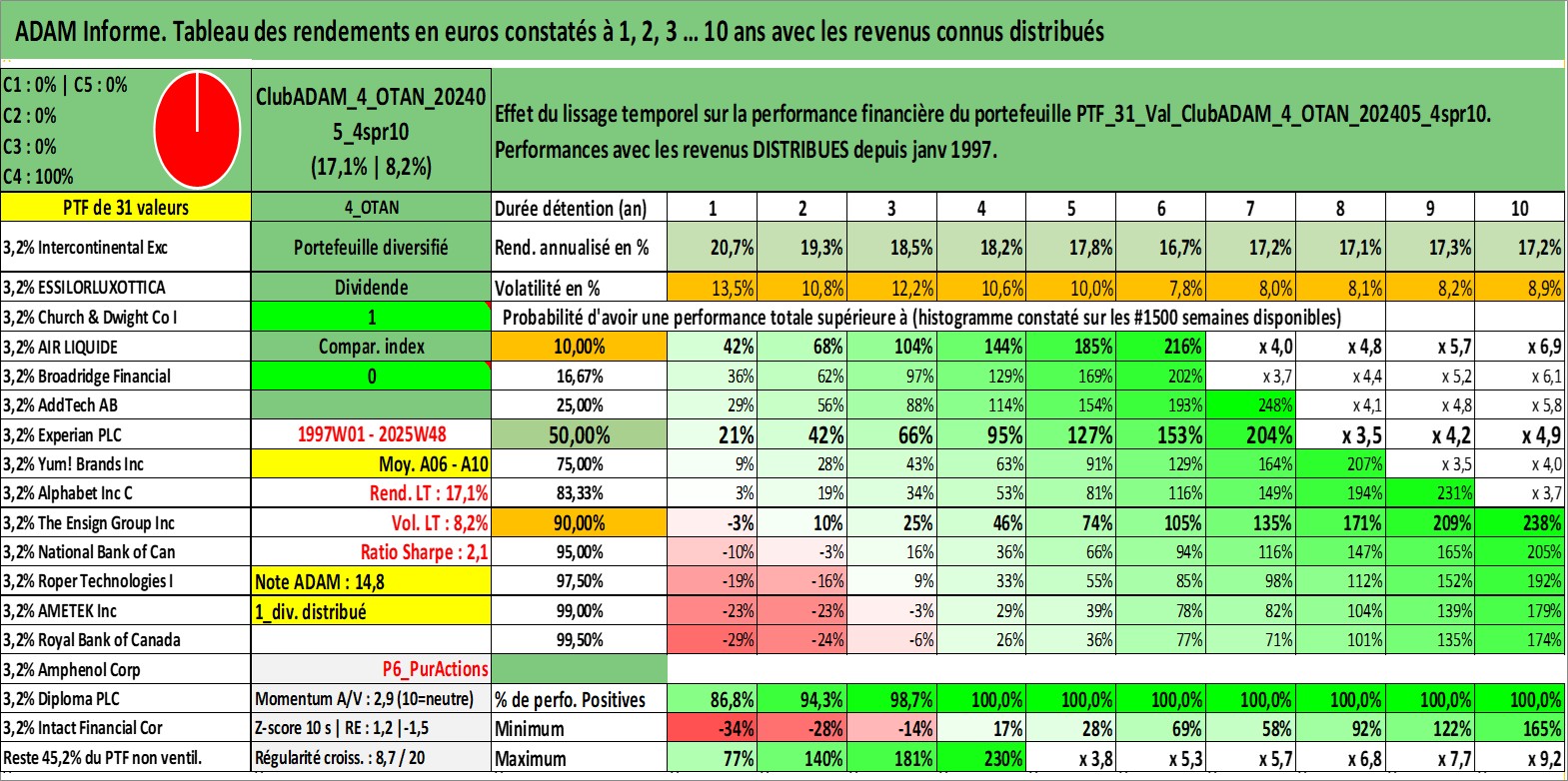 Site dédié aux investisseursPage dédiée sur site financeAnalyse des valorisations hebdomadaires du portefeuille ClubADAM_4_OTAN_202405_4spr10_31actifs avec un profil P6_PurActions. Ce portefeuille est cote en EUR. Les valorisations couvrent les semaines 1997W01 a 2025W48. Les revenus de cet actif financier sont pris en compte depuis la semaine 1997W01. La note globale ESG de cet actif est estimee a 10.2 (apres rebasage entre 0 et 20).