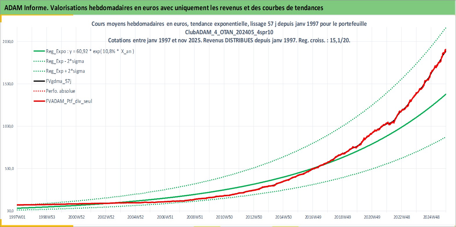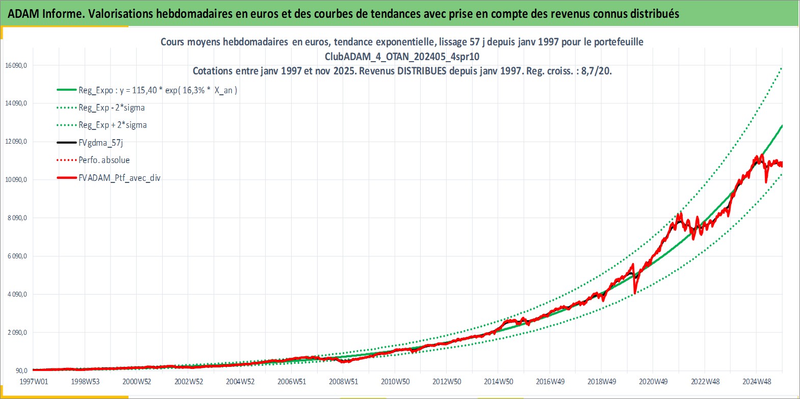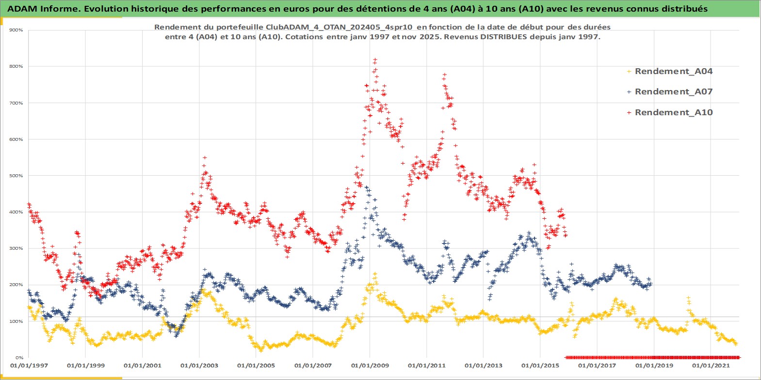 Site dédié aux investisseursPage dédiée sur site financeAnalyse des valorisations hebdomadaires du portefeuille ClubADAM_4_OTAN_202405_4spr10_31actifs avec un profil P6_PurActions. Ce portefeuille est cote en EUR. Les valorisations couvrent les semaines 1997W01 a 2025W48. Les revenus de cet actif financier sont pris en compte depuis la semaine 1997W01. La note globale ESG de cet actif est estimee a 10.2 (apres rebasage entre 0 et 20).
