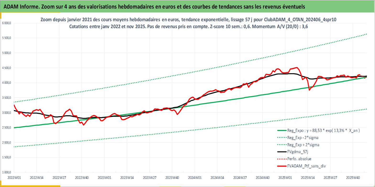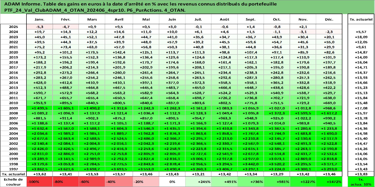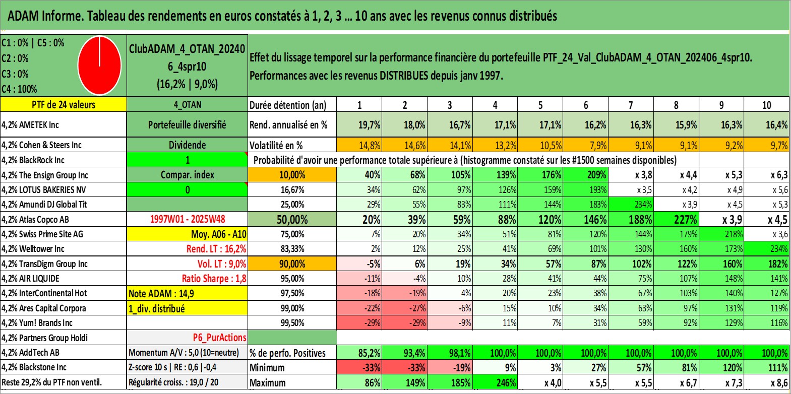 Site dédié aux investisseursPage dédiée sur site financeAnalyse des valorisations hebdomadaires du portefeuille ClubADAM_4_OTAN_202406_4spr10_24actifs avec un profil P6_PurActions. Ce portefeuille est cote en EUR. Les valorisations couvrent les semaines 1997W01 a 2025W48. Les revenus de cet actif financier sont pris en compte depuis la semaine 1997W01. La note globale ESG de cet actif est estimee a 11.1 (apres rebasage entre 0 et 20).
