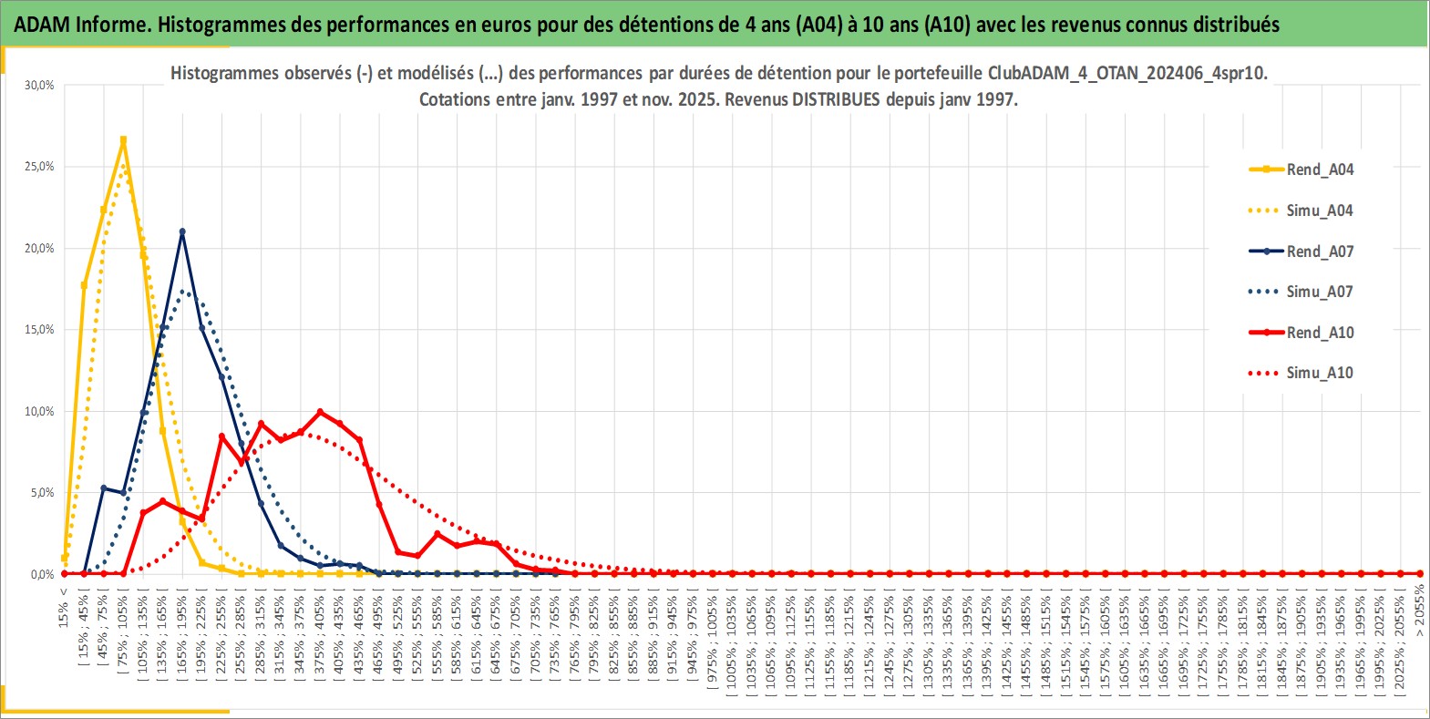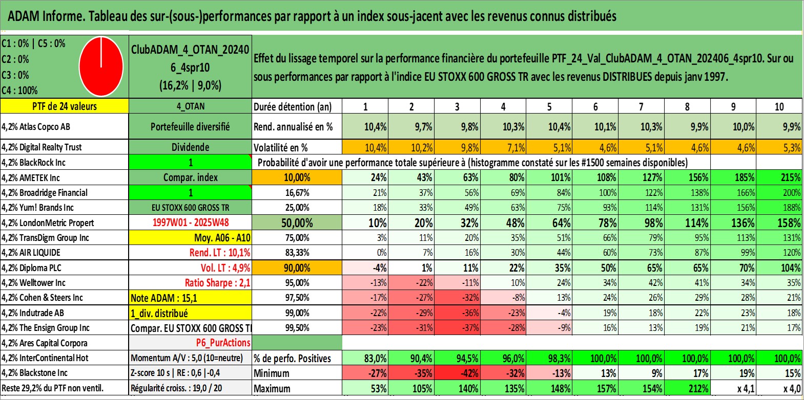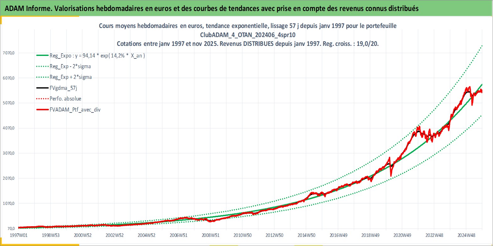 Site dédié aux investisseursPage dédiée sur site financeAnalyse des valorisations hebdomadaires du portefeuille ClubADAM_4_OTAN_202406_4spr10_24actifs avec un profil P6_PurActions. Ce portefeuille est cote en EUR. Les valorisations couvrent les semaines 1997W01 a 2025W48. Les revenus de cet actif financier sont pris en compte depuis la semaine 1997W01. La note globale ESG de cet actif est estimee a 11.1 (apres rebasage entre 0 et 20).