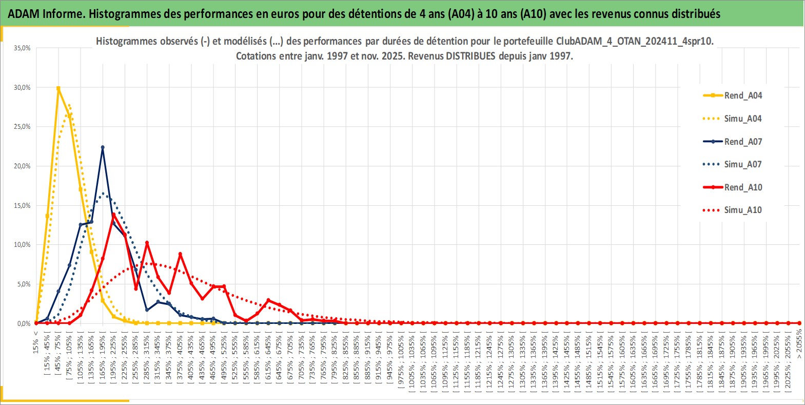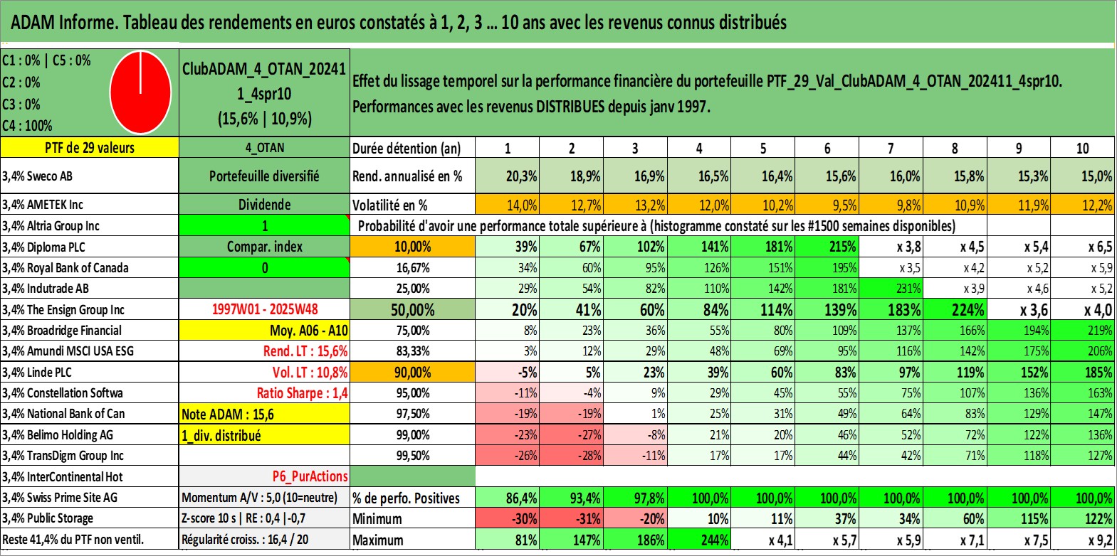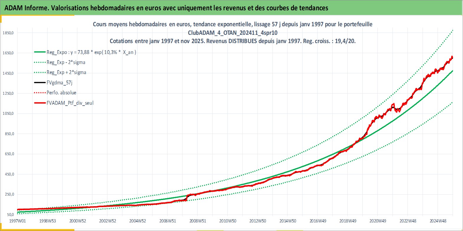 Site dédié aux investisseursPage dédiée sur site financeAnalyse des valorisations hebdomadaires du portefeuille ClubADAM_4_OTAN_202411_4spr10_29actifs avec un profil P6_PurActions. Ce portefeuille est cote en EUR. Les valorisations couvrent les semaines 1997W01 a 2025W48. Les revenus de cet actif financier sont pris en compte depuis la semaine 1997W01. La note globale ESG de cet actif est estimee a 11.4 (apres rebasage entre 0 et 20).