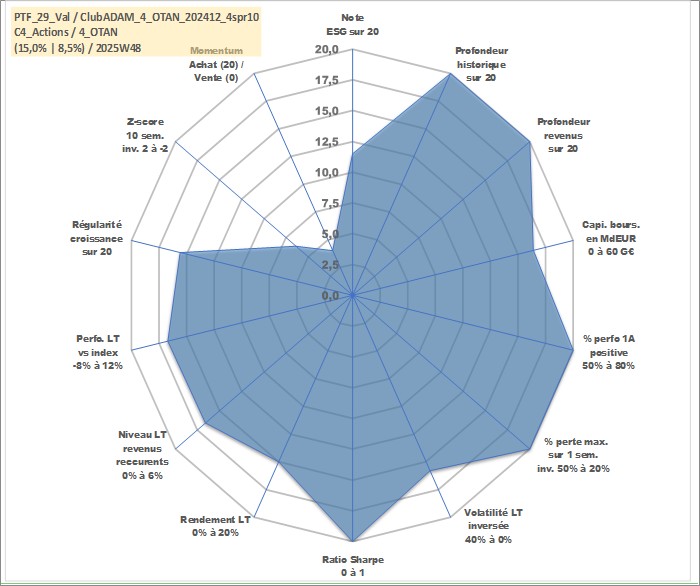 Site dédié aux investisseursPage dédiée sur site financeAnalyse des valorisations hebdomadaires du portefeuille ClubADAM_4_OTAN_202412_4spr10_29actifs avec un profil P6_PurActions. Ce portefeuille est cote en EUR. Les valorisations couvrent les semaines 1997W01 a 2025W48. Les revenus de cet actif financier sont pris en compte depuis la semaine 1997W01. La note globale ESG de cet actif est estimee a 11.5 (apres rebasage entre 0 et 20).