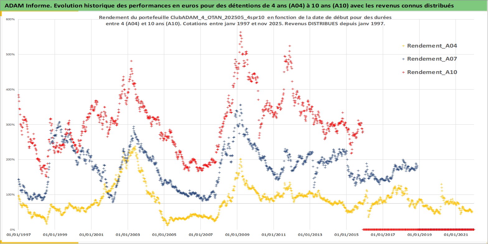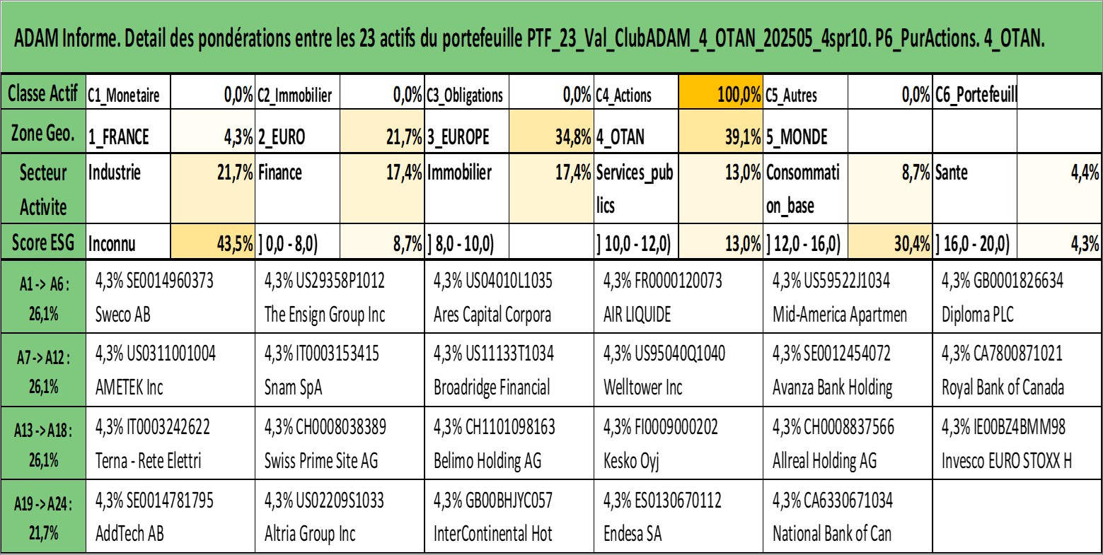 Site dédié aux investisseursPage dédiée sur site financeAnalyse des valorisations hebdomadaires du portefeuille ClubADAM_4_OTAN_202505_4spr10_23actifs avec un profil P6_PurActions. Ce portefeuille est cote en EUR. Les valorisations couvrent les semaines 1997W01 a 2025W48. Les revenus de cet actif financier sont pris en compte depuis la semaine 1997W01. La note globale ESG de cet actif est estimee a 12.6 (apres rebasage entre 0 et 20).