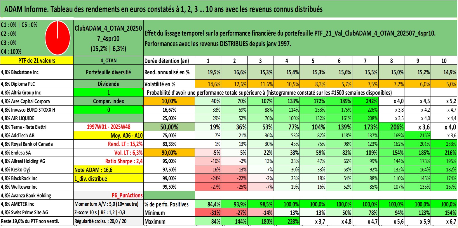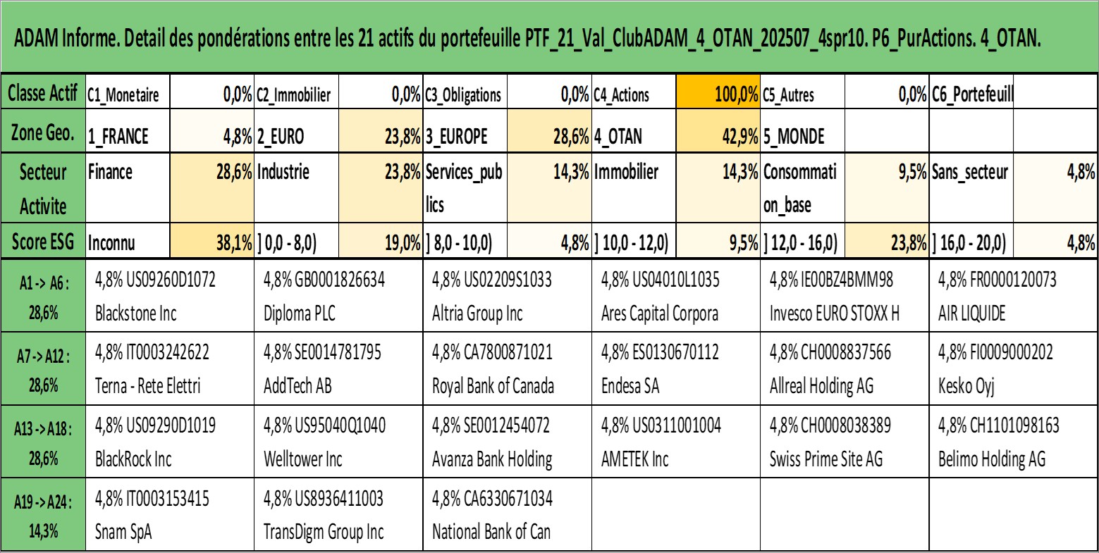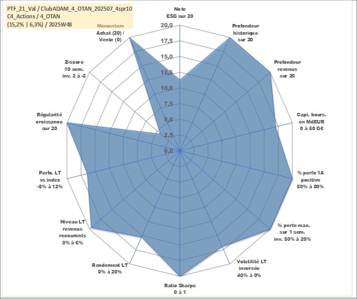 Site dédié aux investisseursPage dédiée sur site financeAnalyse des valorisations hebdomadaires du portefeuille ClubADAM_4_OTAN_202507_4spr10_21actifs avec un profil P6_PurActions. Ce portefeuille est cote en EUR. Les valorisations couvrent les semaines 1997W01 a 2025W48. Les revenus de cet actif financier sont pris en compte depuis la semaine 1997W01. La note globale ESG de cet actif est estimee a 11.3 (apres rebasage entre 0 et 20).