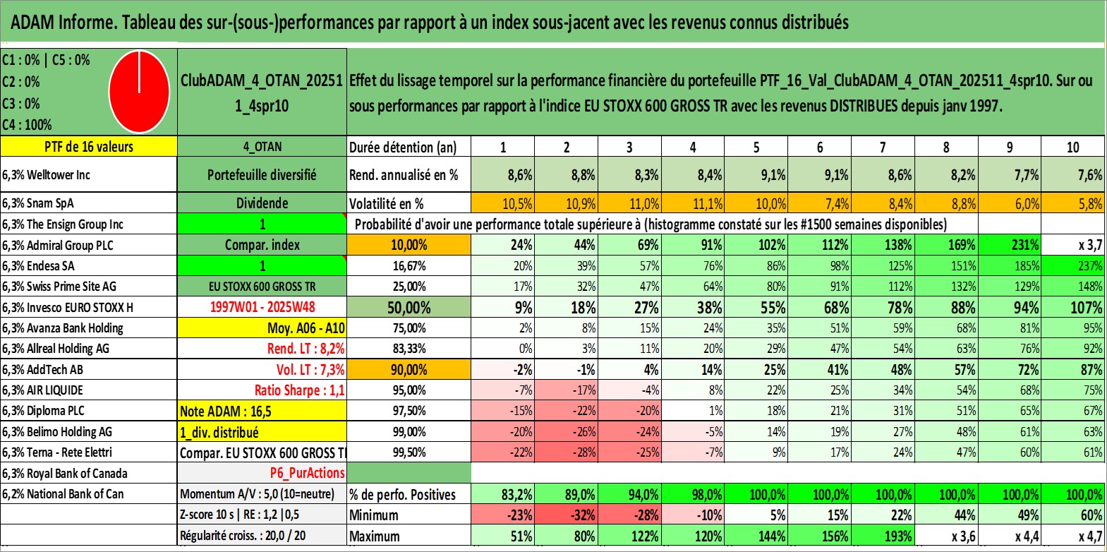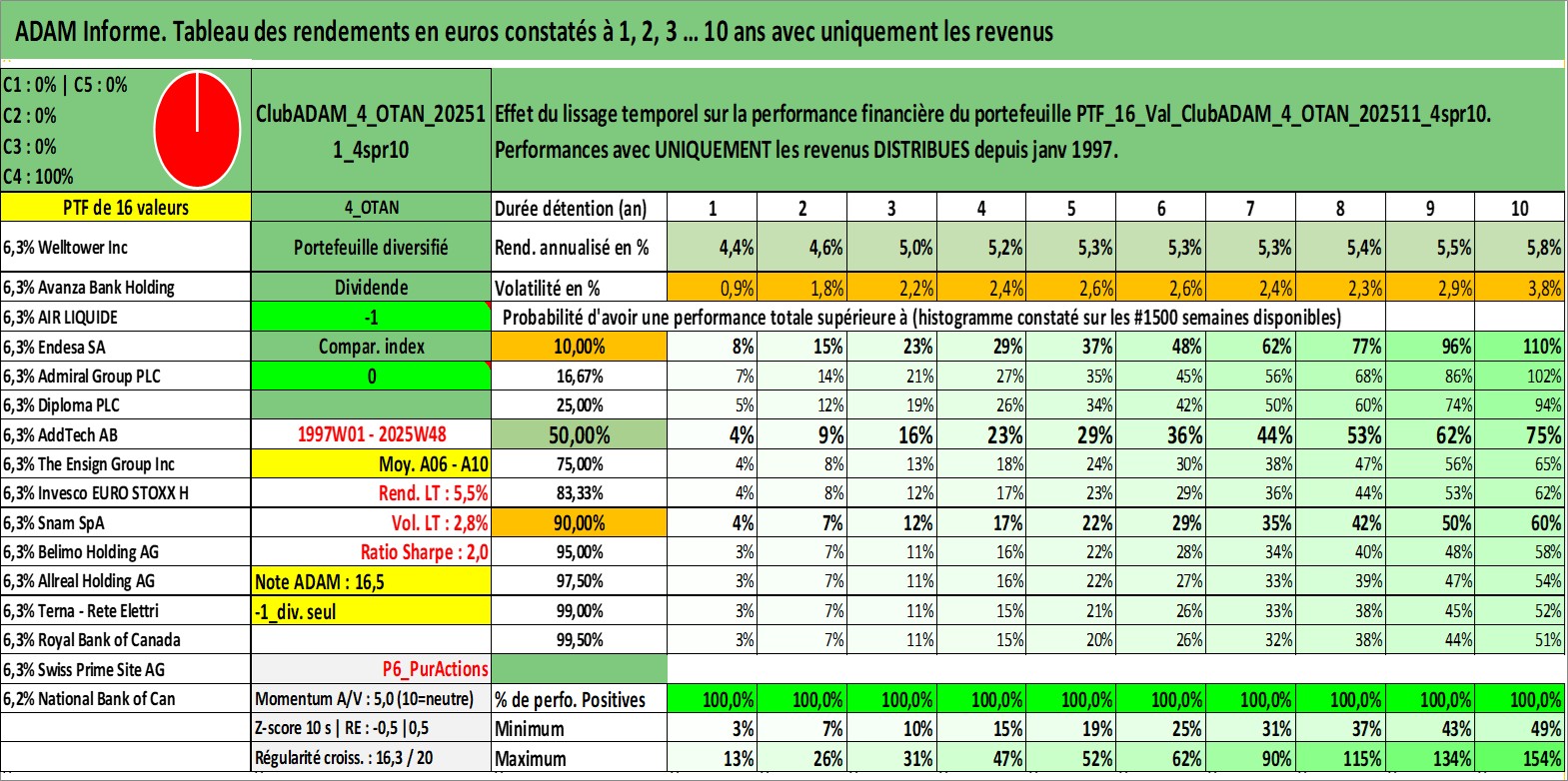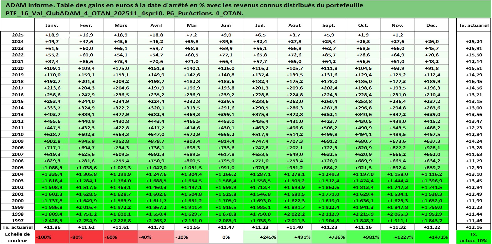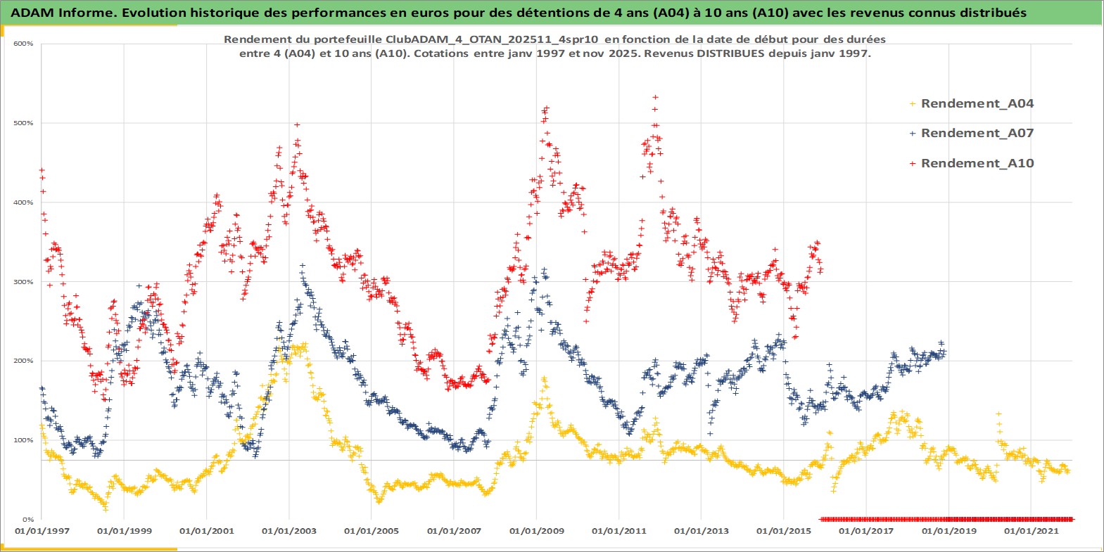 Site dédié aux investisseursPage dédiée sur site financeAnalyse des valorisations hebdomadaires du portefeuille ClubADAM_4_OTAN_202511_4spr10_16actifs avec un profil P6_PurActions. Ce portefeuille est cote en EUR. Les valorisations couvrent les semaines 1997W01 a 2025W48. Les revenus de cet actif financier sont pris en compte depuis la semaine 1997W01. La note globale ESG de cet actif est estimee a 13.3 (apres rebasage entre 0 et 20).