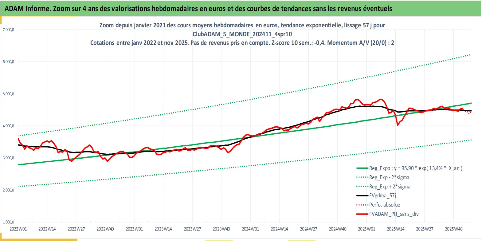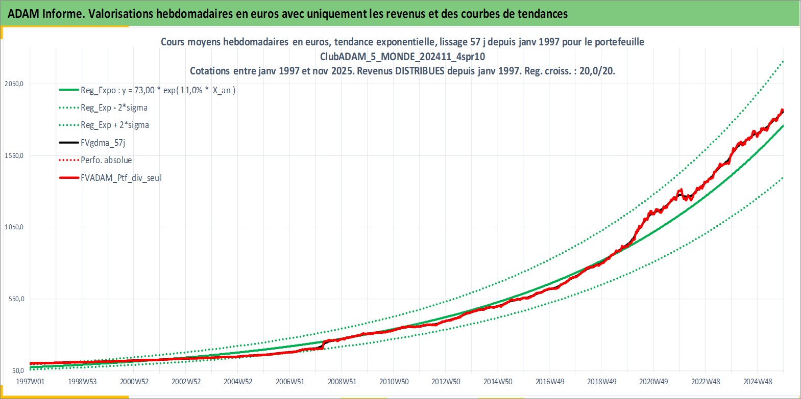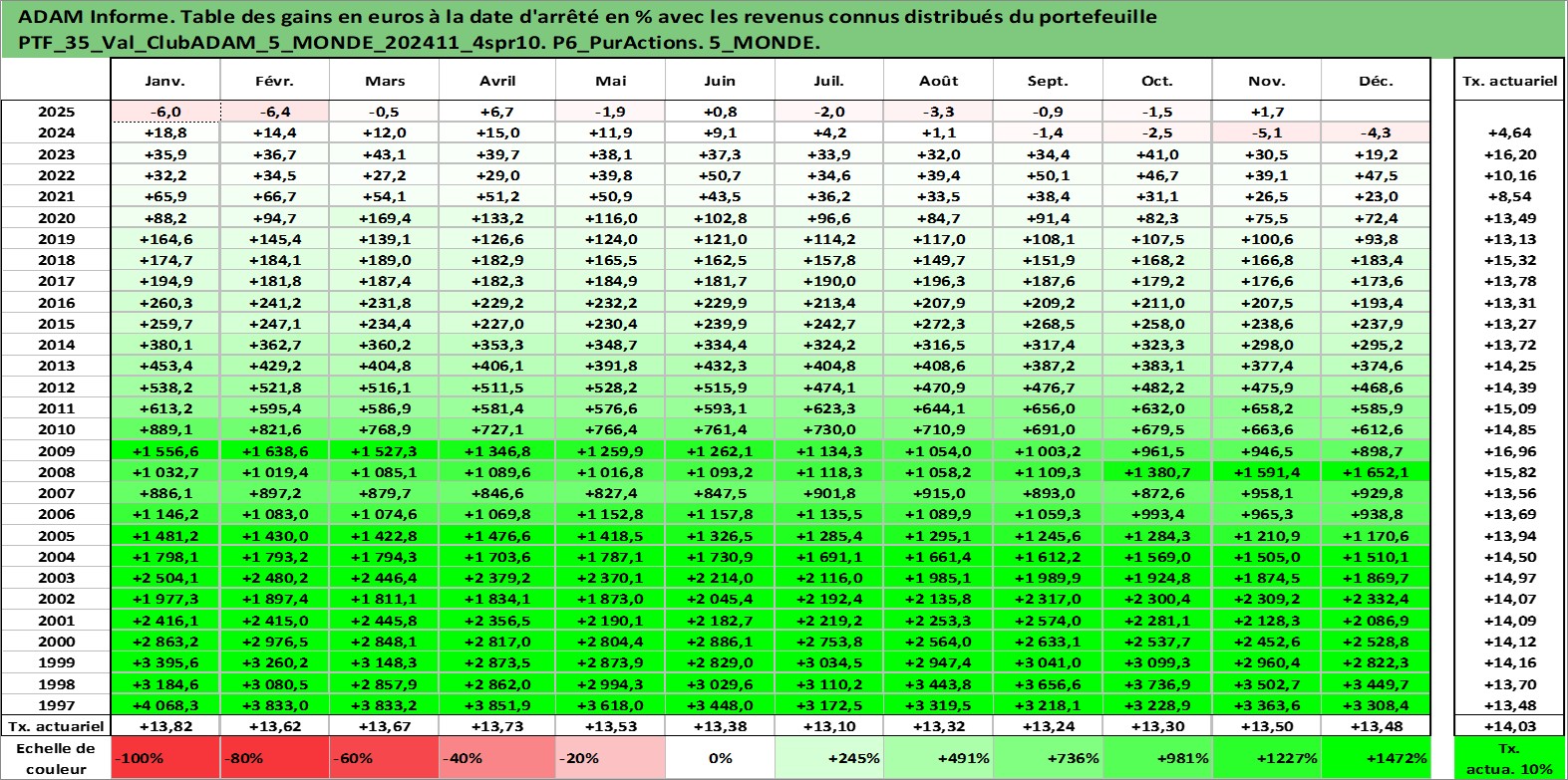 Site dédié aux investisseursPage dédiée sur site financeAnalyse des valorisations hebdomadaires du portefeuille ClubADAM_5_MONDE_202411_4spr10_35actifs avec un profil P6_PurActions. Ce portefeuille est cote en EUR. Les valorisations couvrent les semaines 1997W01 a 2025W48. Les revenus de cet actif financier sont pris en compte depuis la semaine 1997W01. La note globale ESG de cet actif est estimee a 11.8 (apres rebasage entre 0 et 20).