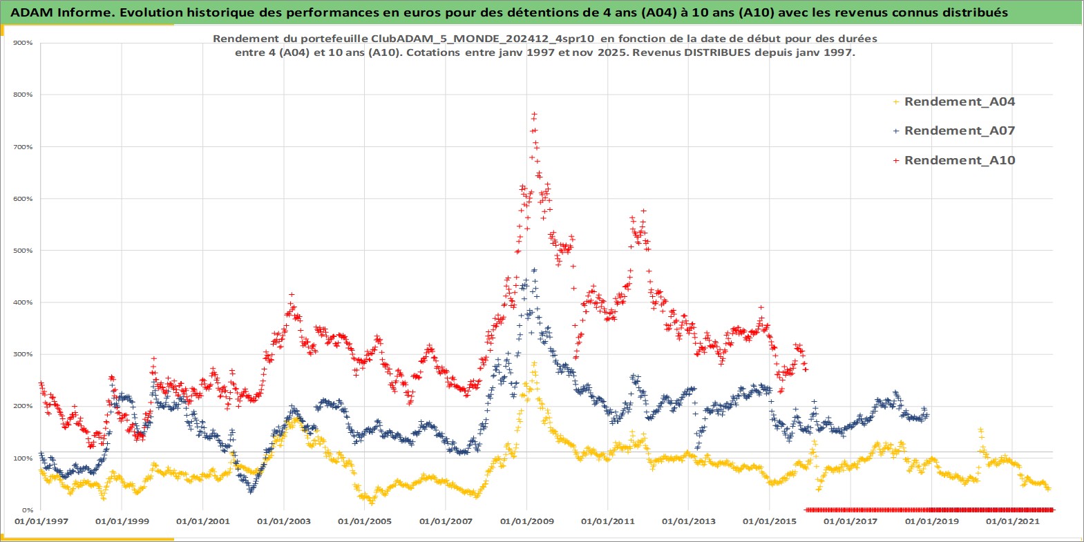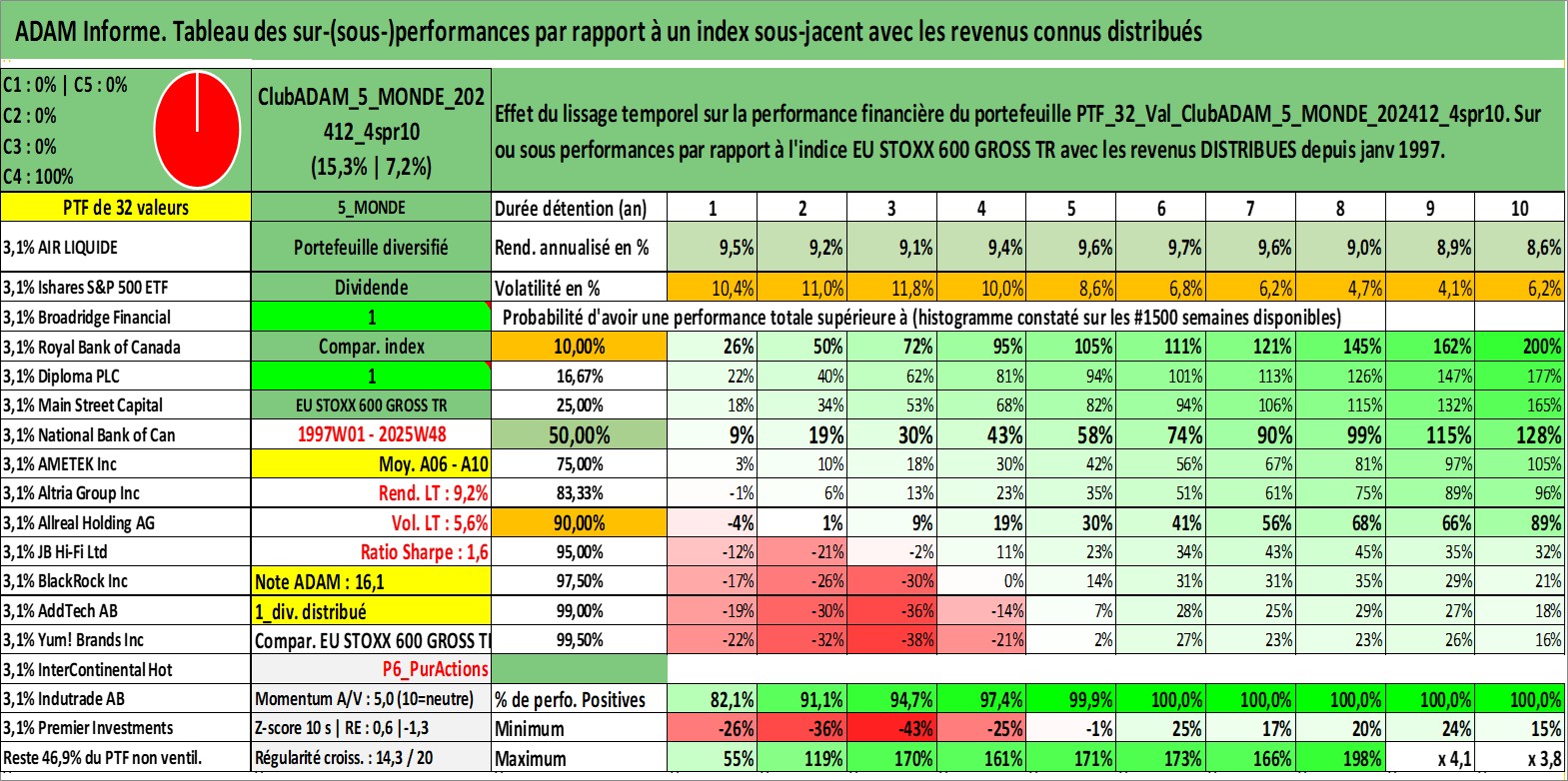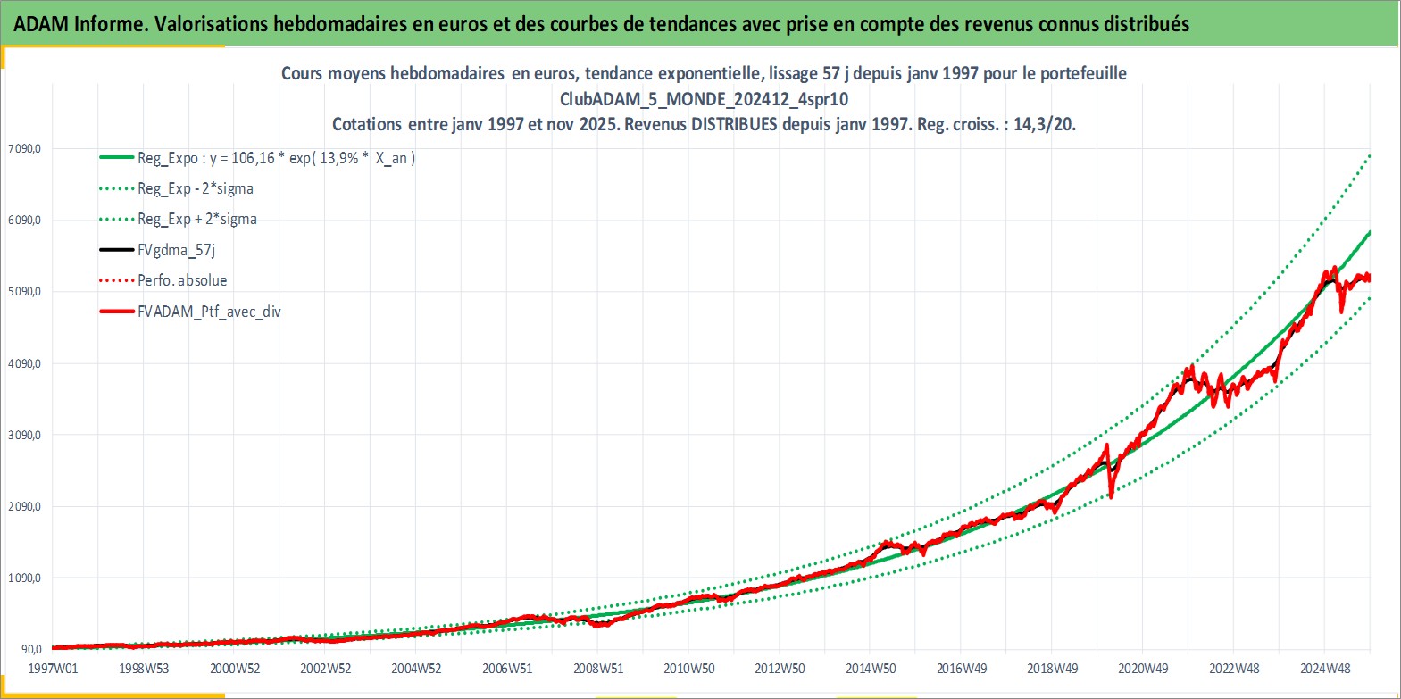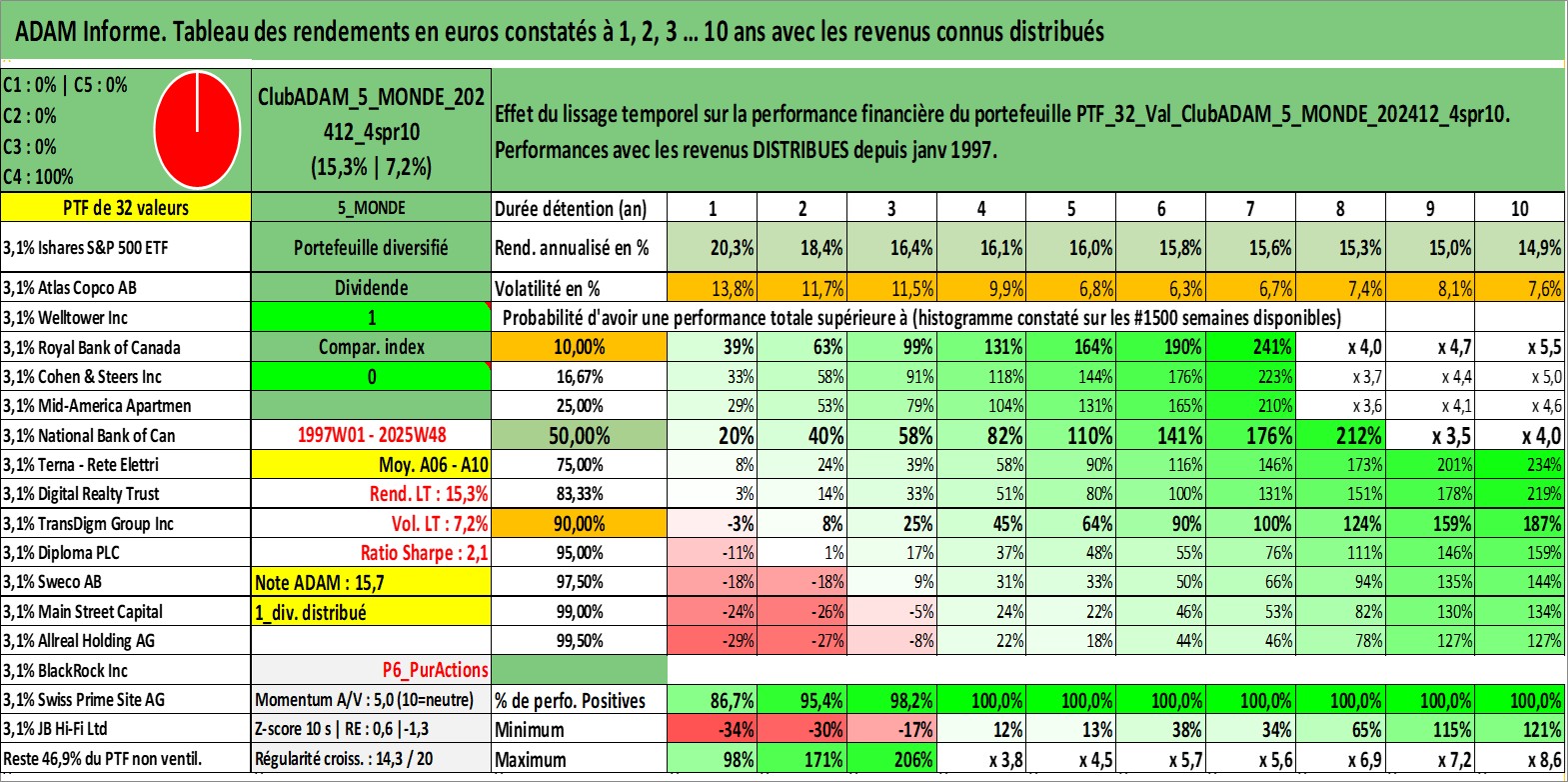 Site dédié aux investisseursPage dédiée sur site financeAnalyse des valorisations hebdomadaires du portefeuille ClubADAM_5_MONDE_202412_4spr10_32actifs avec un profil P6_PurActions. Ce portefeuille est cote en EUR. Les valorisations couvrent les semaines 1997W01 a 2025W48. Les revenus de cet actif financier sont pris en compte depuis la semaine 1997W01. La note globale ESG de cet actif est estimee a 11.5 (apres rebasage entre 0 et 20).