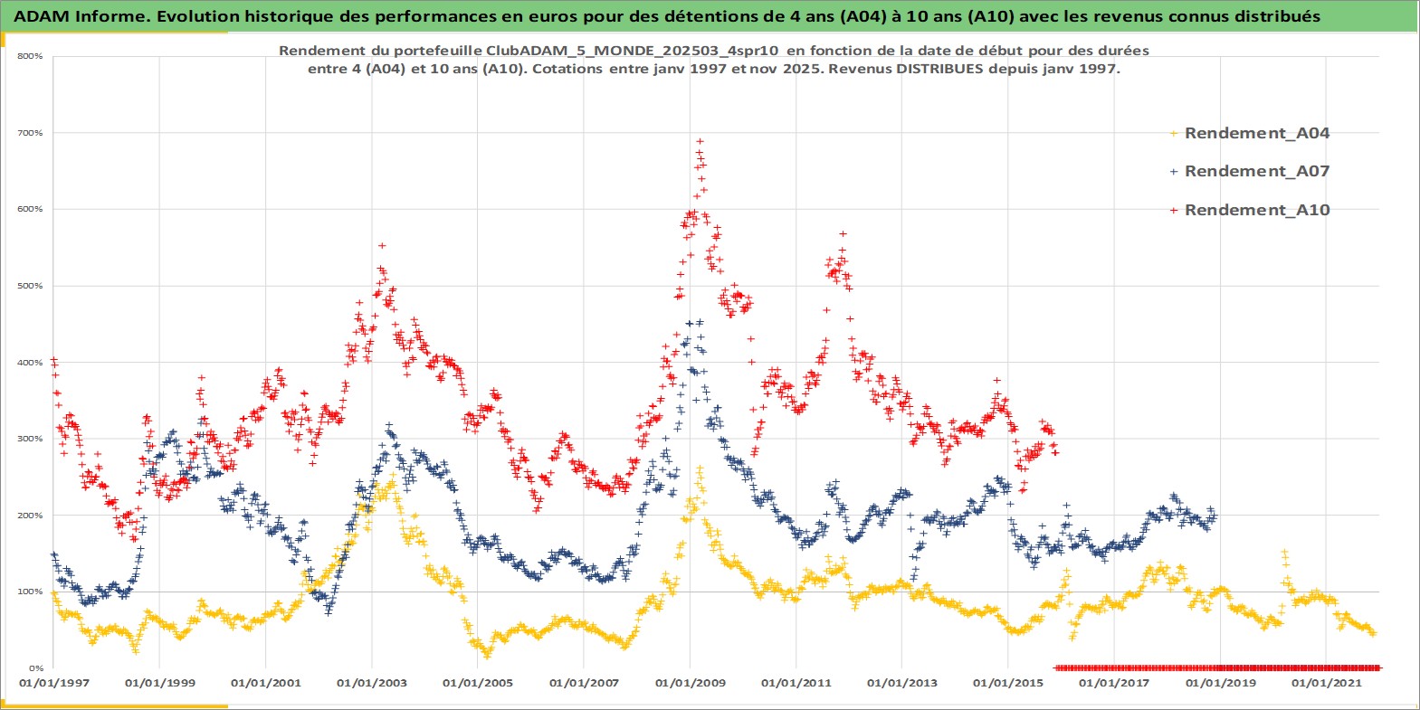 Site dédié aux investisseursPage dédiée sur site financeAnalyse des valorisations hebdomadaires du portefeuille ClubADAM_5_MONDE_202503_4spr10_30actifs avec un profil P6_PurActions. Ce portefeuille est cote en EUR. Les valorisations couvrent les semaines 1997W01 a 2025W48. Les revenus de cet actif financier sont pris en compte depuis la semaine 1997W01. La note globale ESG de cet actif est estimee a 11.4 (apres rebasage entre 0 et 20).